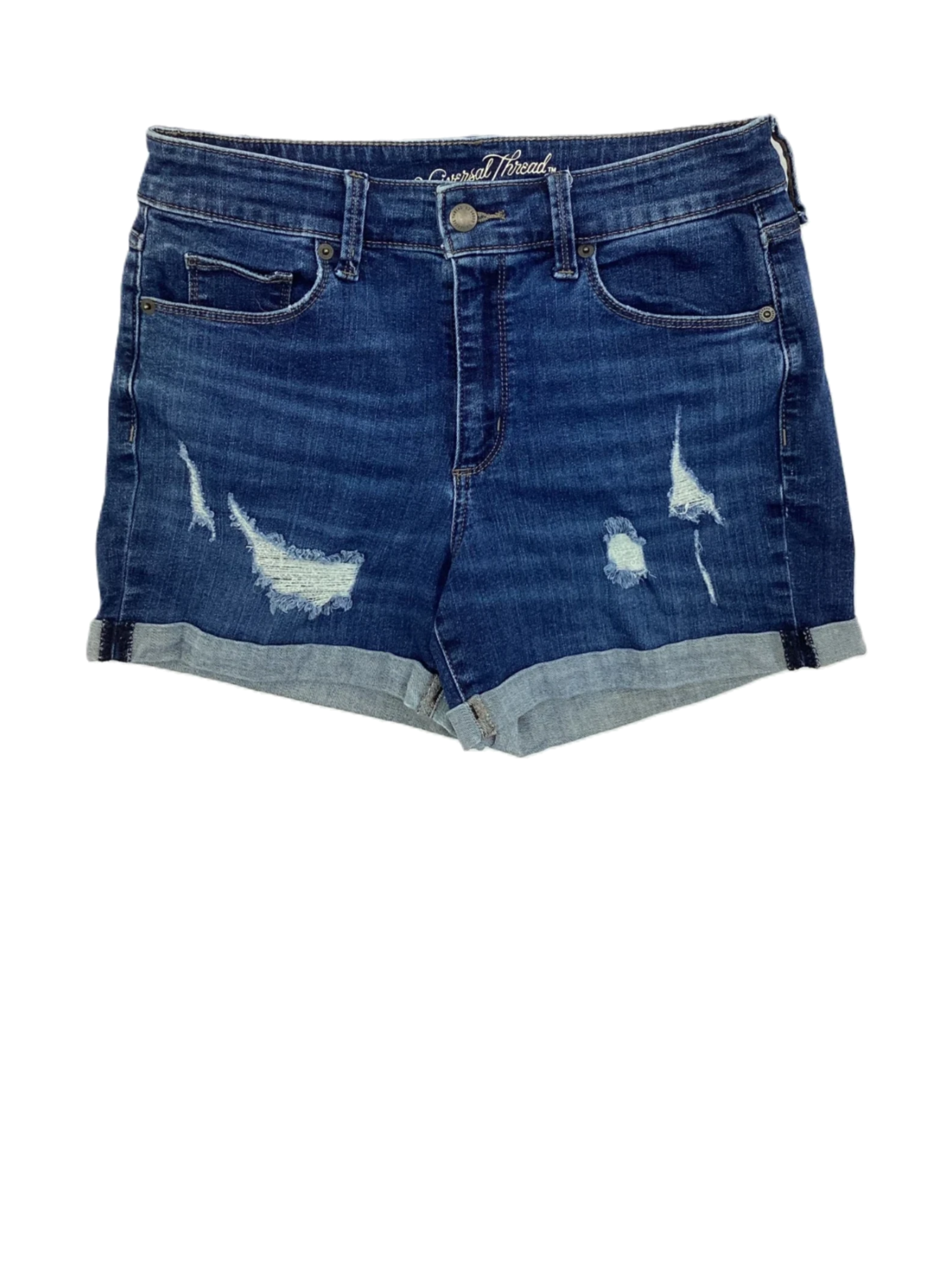 These are distressed denim shorts.