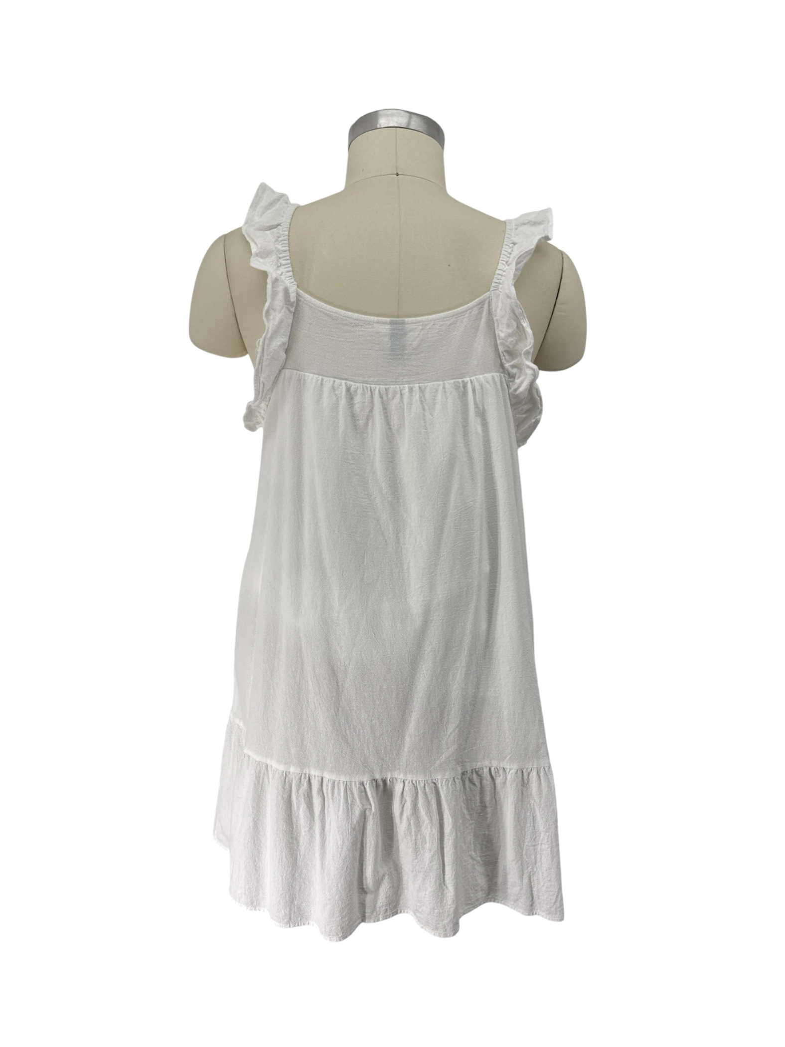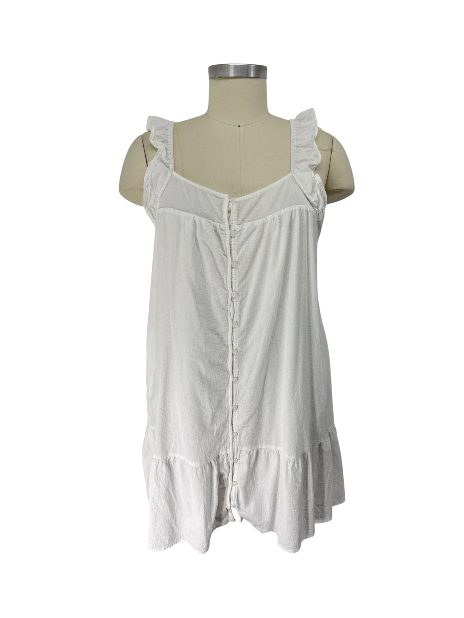 This pre-owned Universal Thread dress is a perfect summer staple. Crafted from soft, 100% cotton (including recycled cotton), it offers a comfortable and breezy feel. The dress features a flattering A-line silhouette with a playful ruffle hem, button-down front, and delicate ruffle straps. Ideal for warm weather, this white mini dress is easy to dress up or down, making it a versatile addition to your wardrobe.