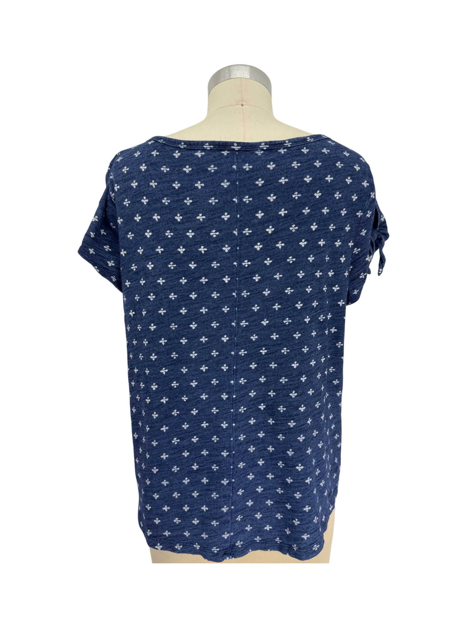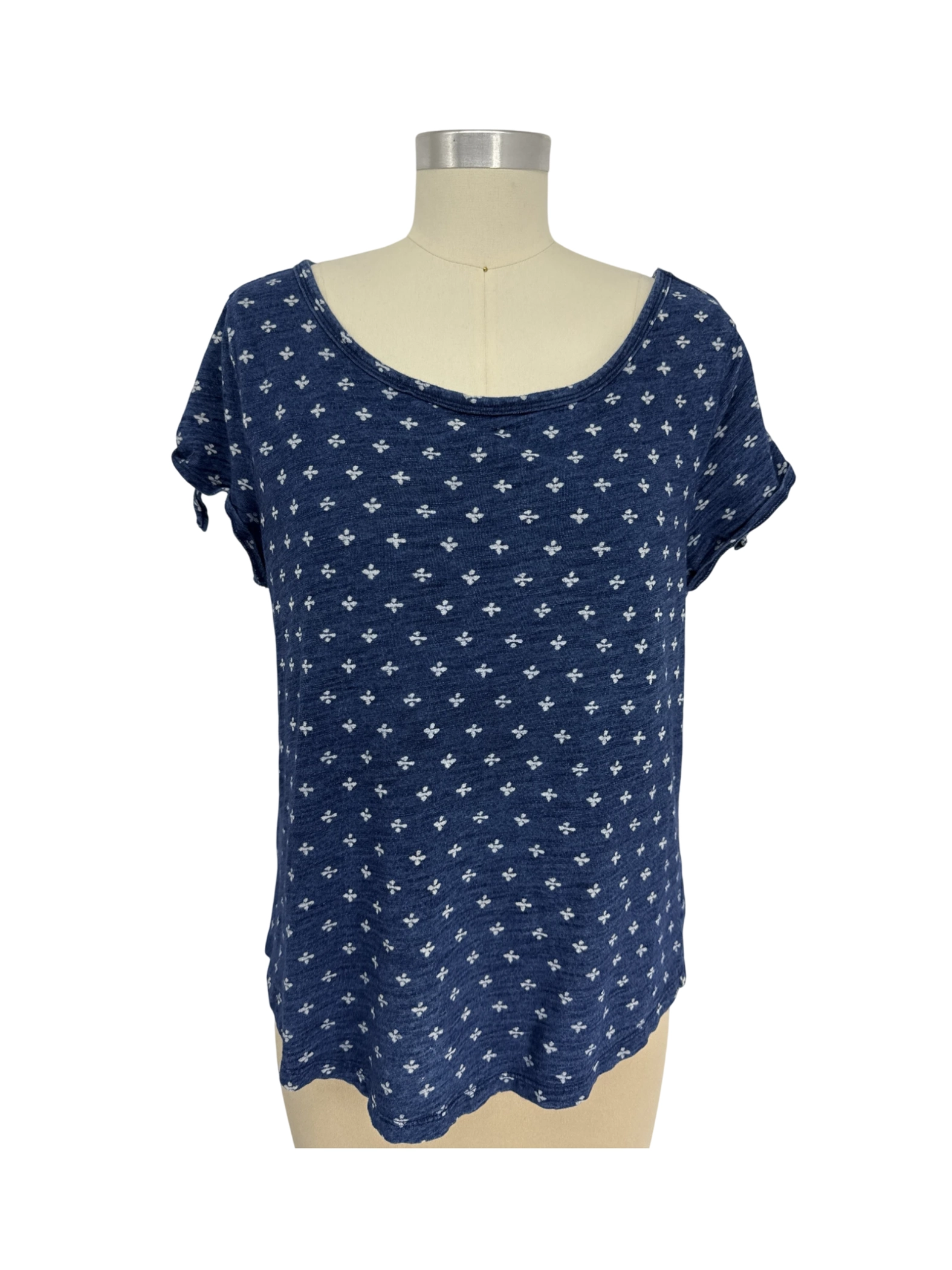 This pre-owned Universal Thread t-shirt is a stylish addition to any wardrobe. The top features a flattering scoop neck and short sleeves, perfect for warm weather. The fabric is a soft cotton blend, ensuring comfort all day long. The blue color is adorned with a delicate floral pattern, offering a touch of femininity. This versatile t-shirt can be dressed up or down. Add this unique, lightly-used top to your collection and express your style. - Elevate your casual wardrobe with this pre-owned Universal Thread T-shirt. Crafted from soft, breathable cotton, this top features a stylish navy blue and white dotted pattern. The classic round neck and short sleeves make it perfect for warm weather. This versatile tee is ideal for everyday wear, offering both comfort and style. Made from 100% cotton, ensuring a comfortable fit. Add this must-have piece to your collection today!