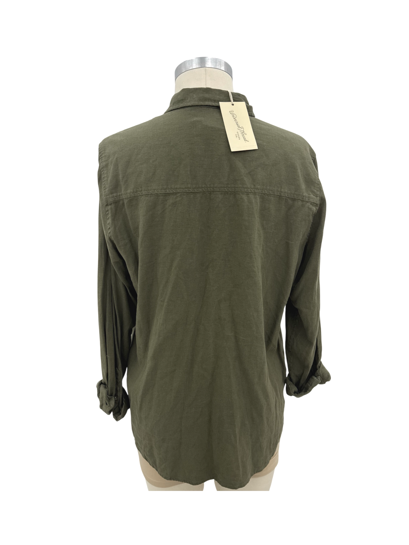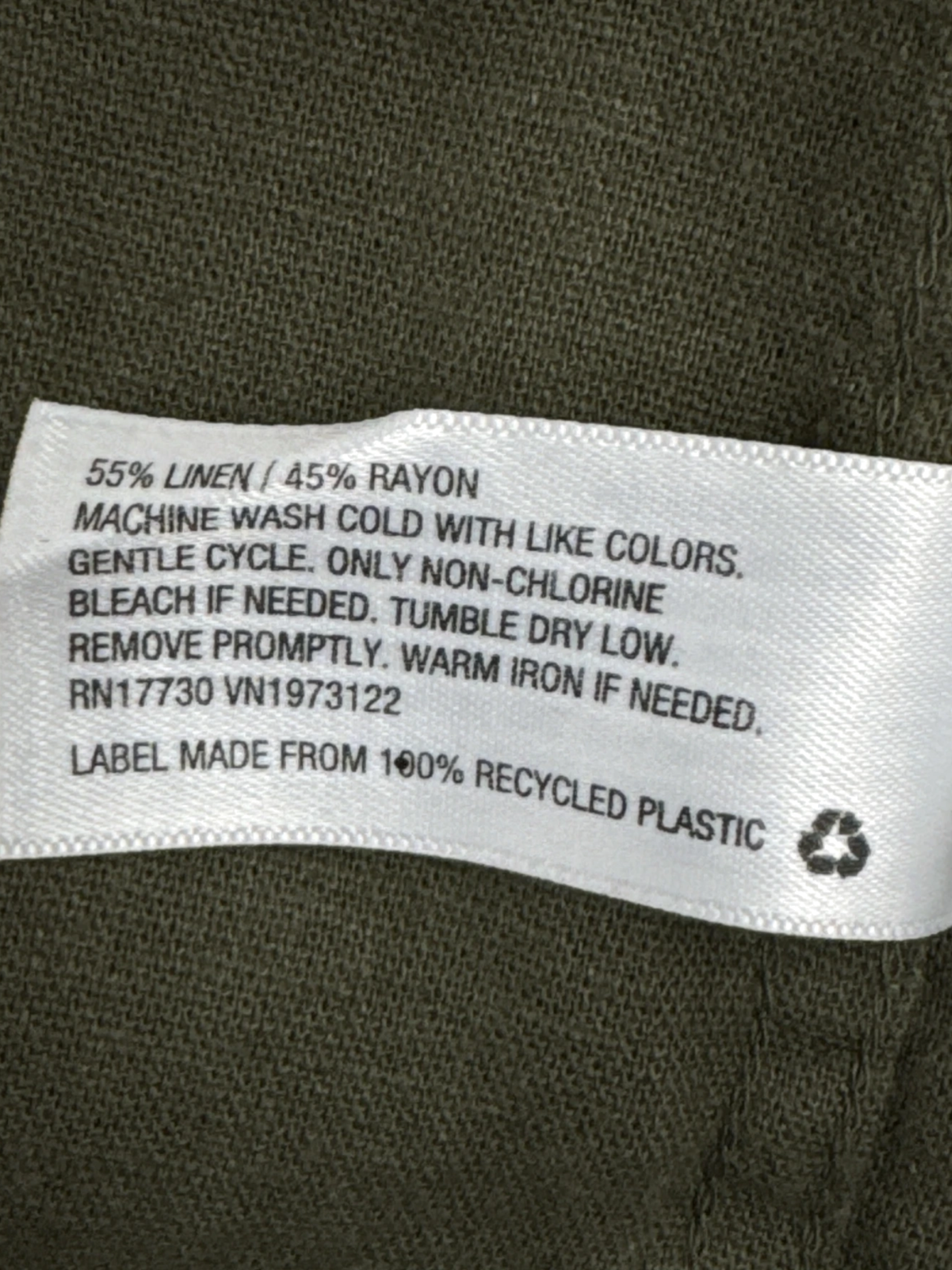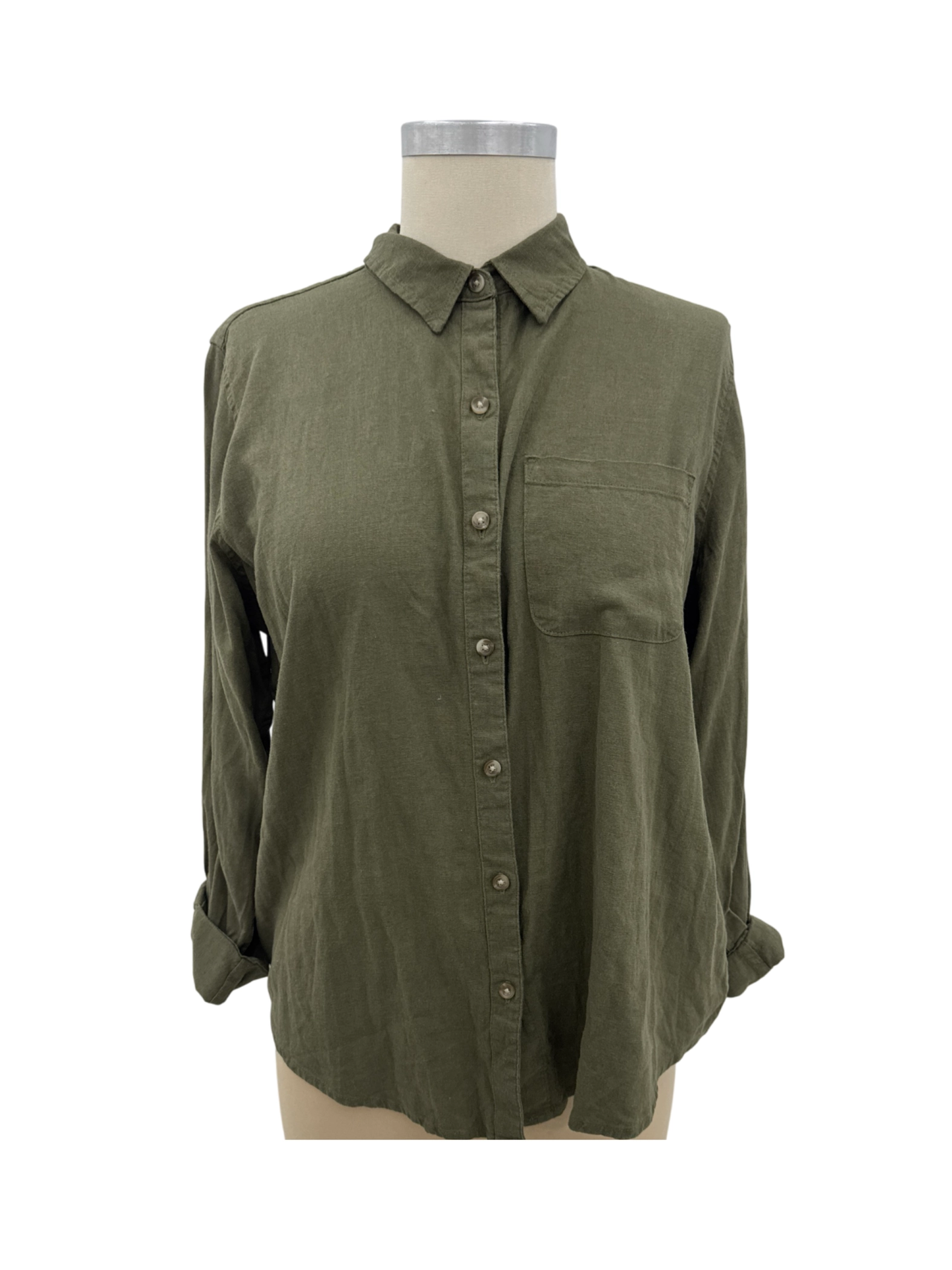 Elevate your everyday wardrobe with this pre-loved Universal Thread button-up shirt. Crafted from a blend of linen and rayon, this shirt offers a relaxed fit and all-day comfort. Featuring a classic collar, long sleeves, and a practical pocket, this shirt is perfect for layering. Its versatile design makes it suitable for various occasions, from casual outings to work settings. Made with recycled plastic, the label adds an eco-conscious touch.