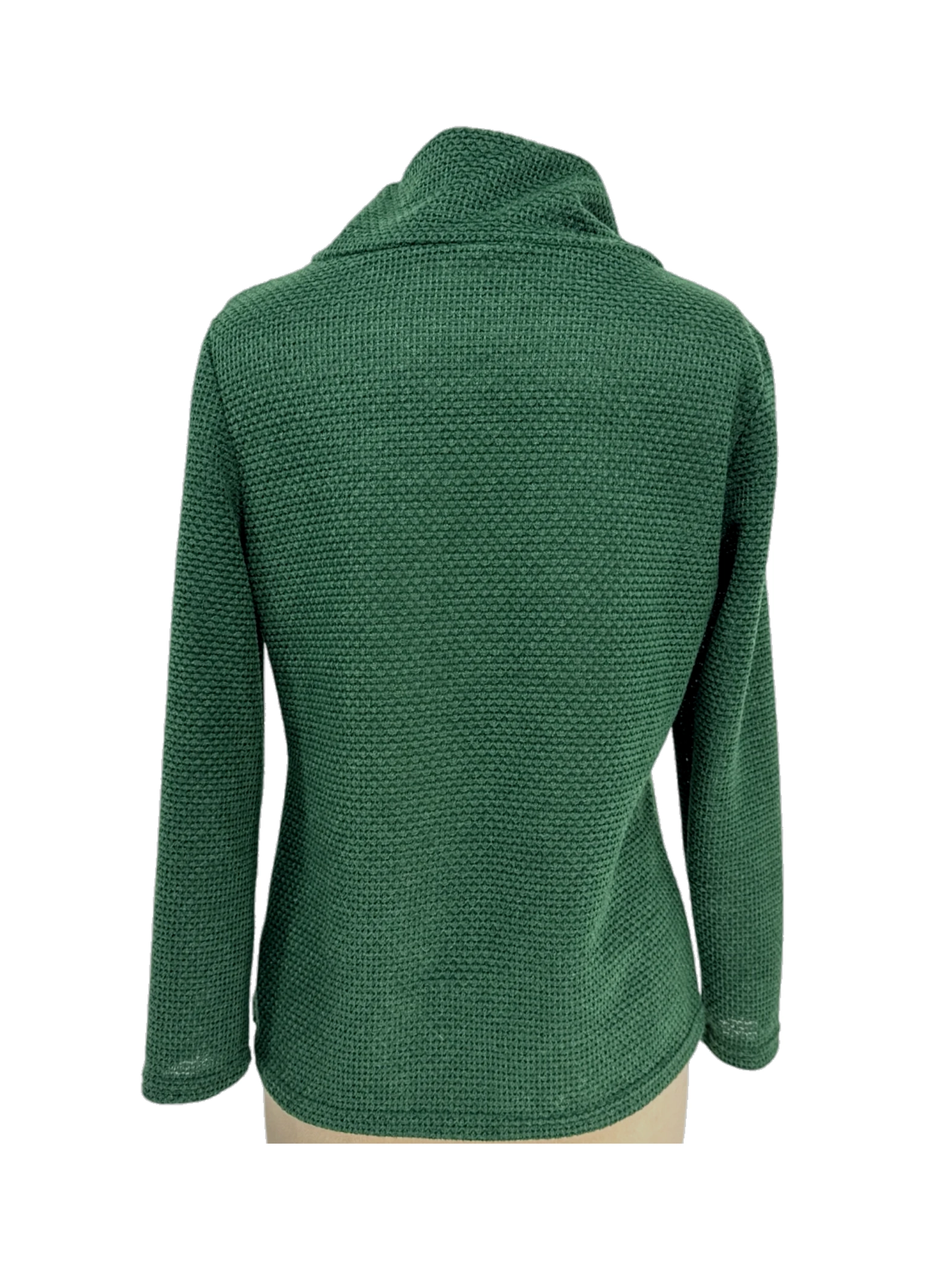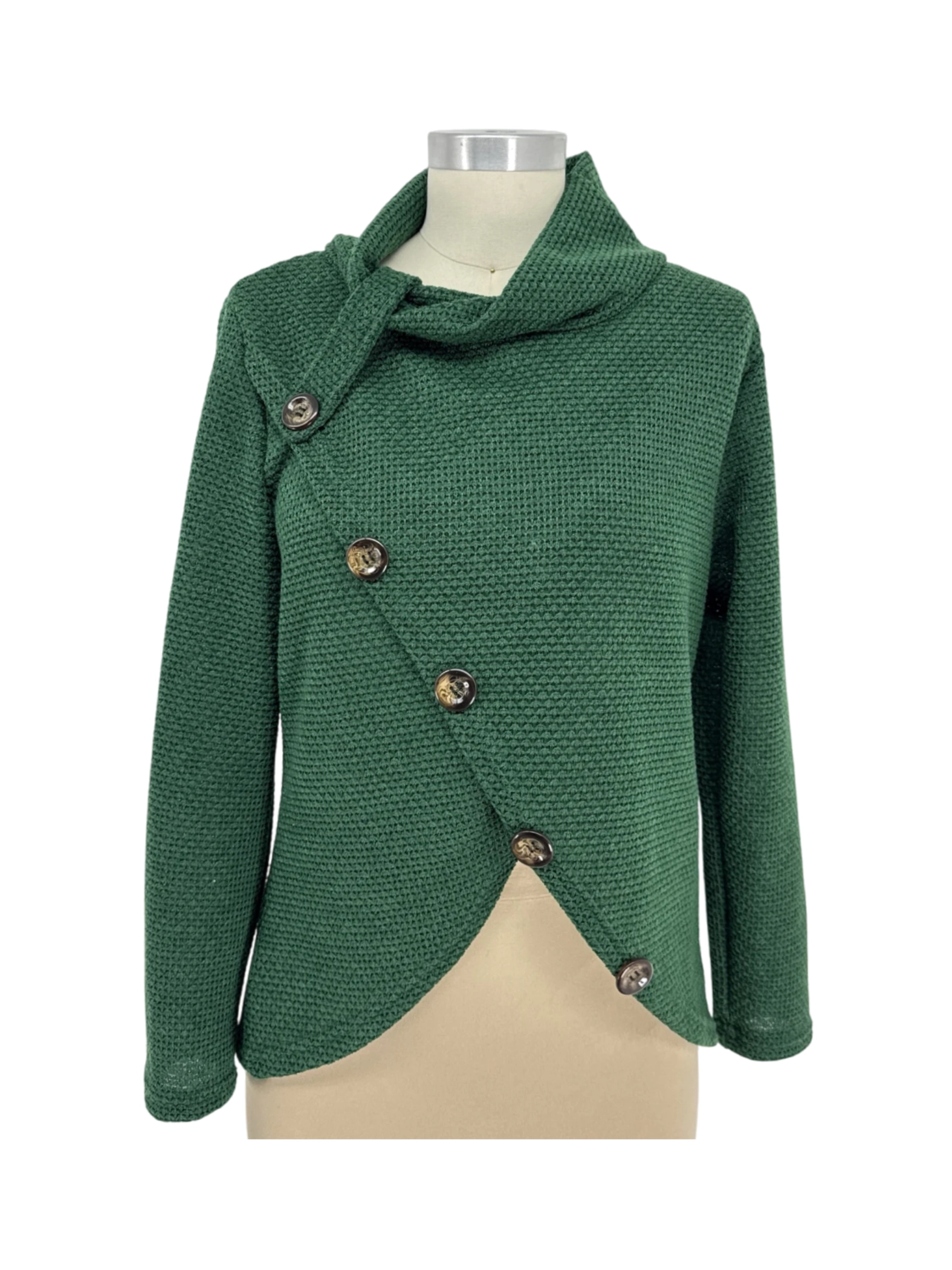 Elevate your fall and winter wardrobe with this stylish, pre-owned green sweater. This versatile piece features a unique button-up design and a cozy turtleneck, perfect for layering. Made from a soft blend of cotton and polyester, it offers both comfort and durability. The sweater's classic design makes it ideal for both casual and semi-formal occasions. It is a perfect addition to any fashion-conscious woman's closet. This gently used sweater is in excellent condition and ready to be worn, offering a blend of style and sustainability.