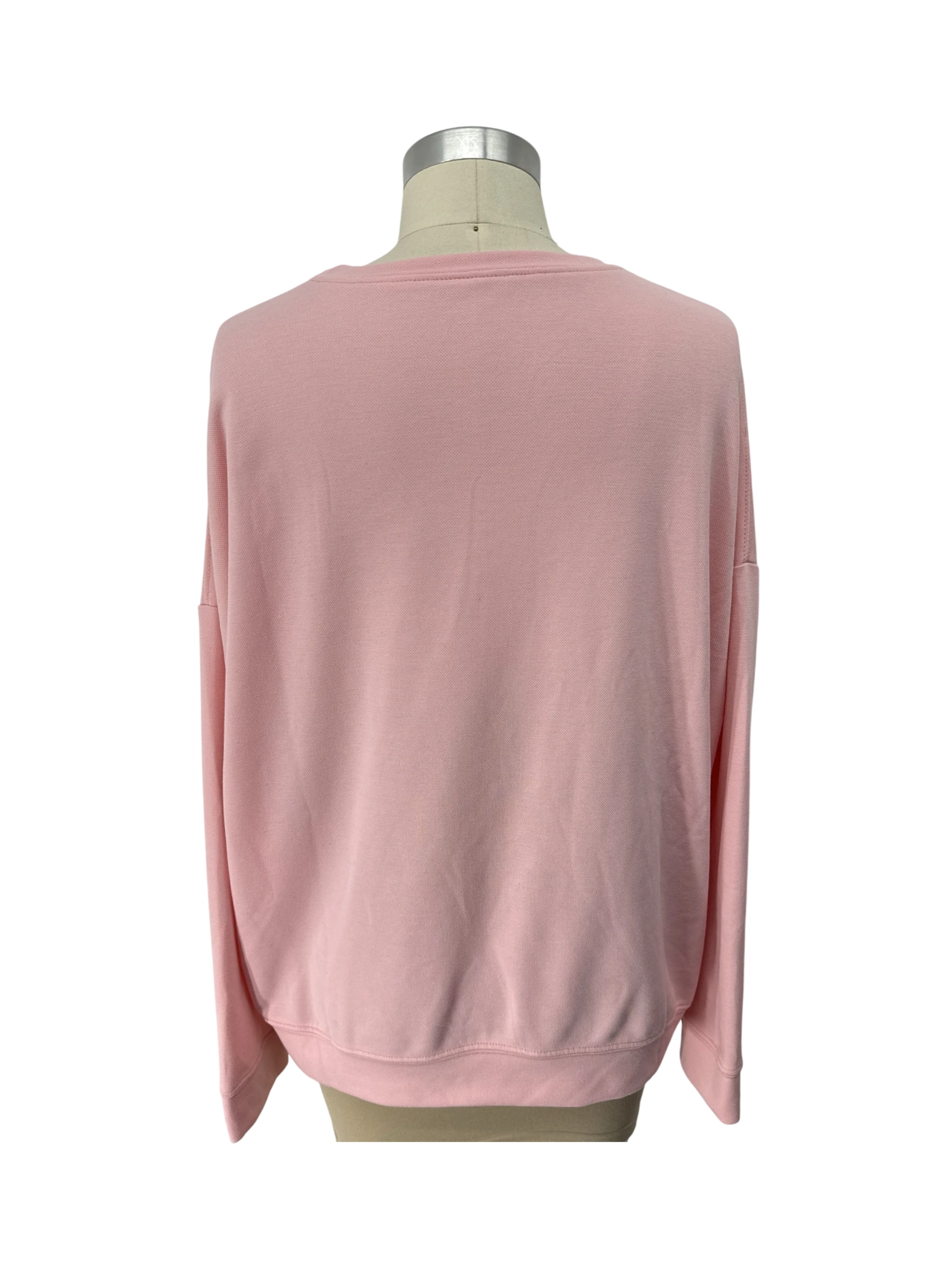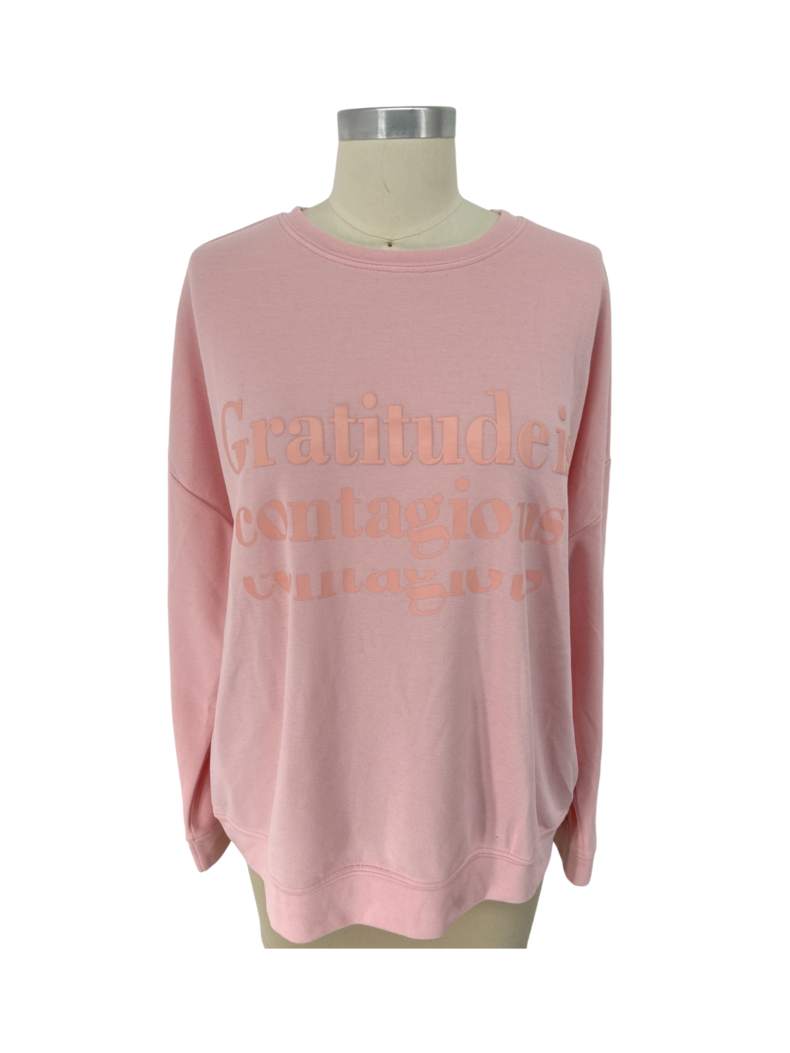 This gently used pink sweatshirt is a cozy and stylish addition to any wardrobe. Featuring a crew neck and long sleeves, it's perfect for casual wear. The sweatshirt has a unique "Gratitude contagious" design. Ideal for fall, it can be paired with jeans or leggings for a comfortable and fashionable look.