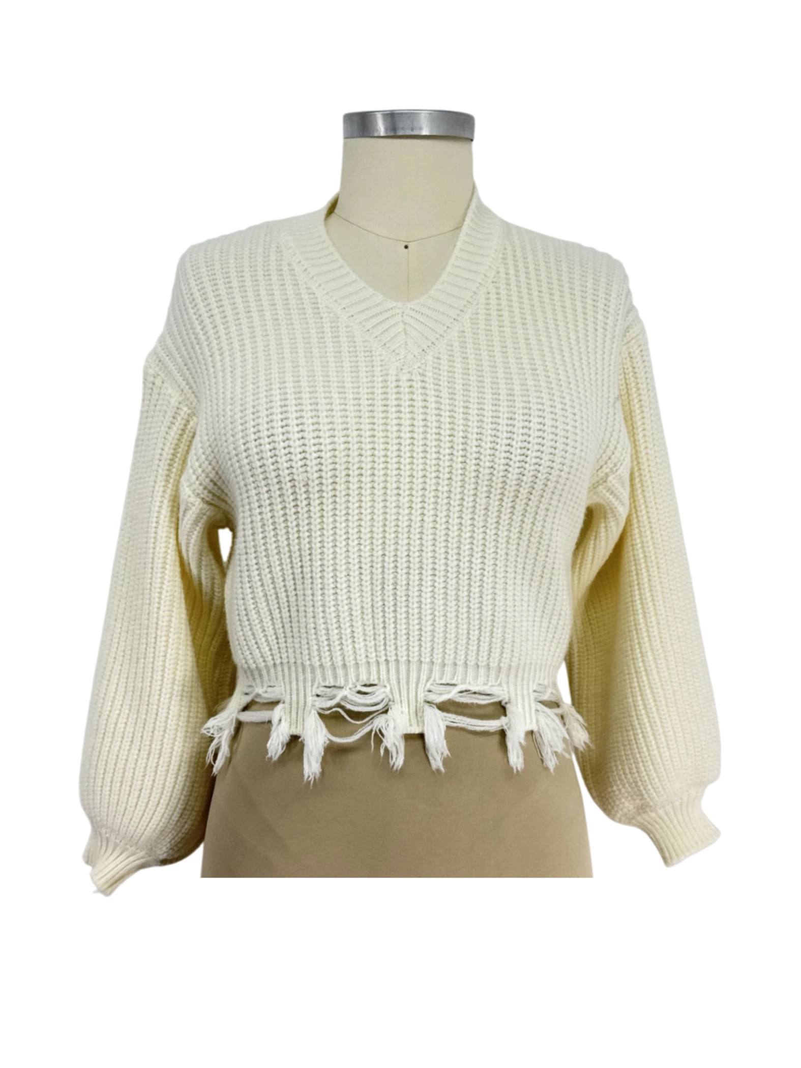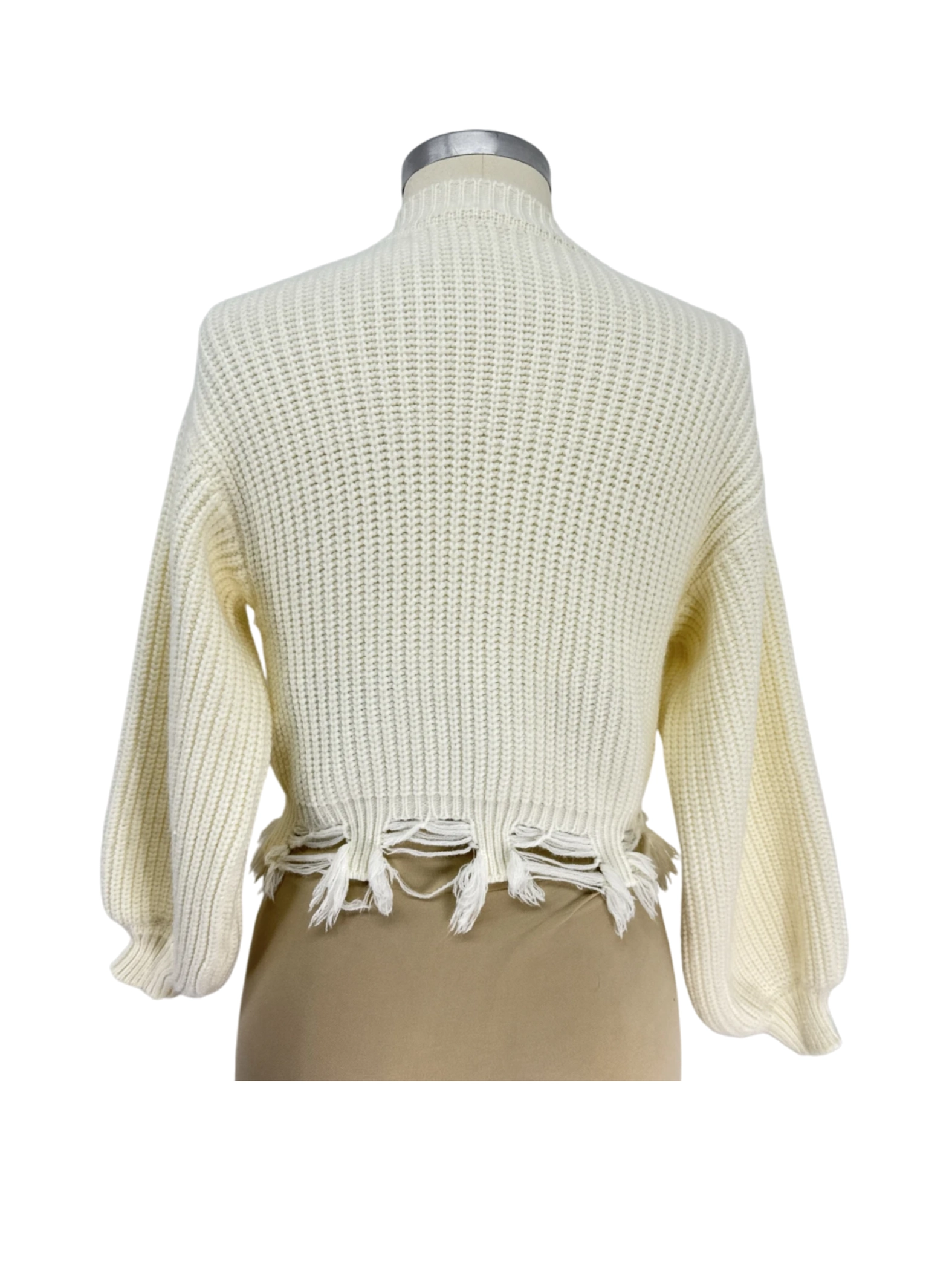 This pre-owned ivory cropped sweater is a chic and versatile addition to any wardrobe. Featuring a flattering V-neck and a unique fringe hem detail, it offers a modern and edgy look. Perfect for layering, this sweater provides warmth without sacrificing style. Ideal for the fall and winter seasons. Embrace the casual elegance of this cozy cropped sweater.