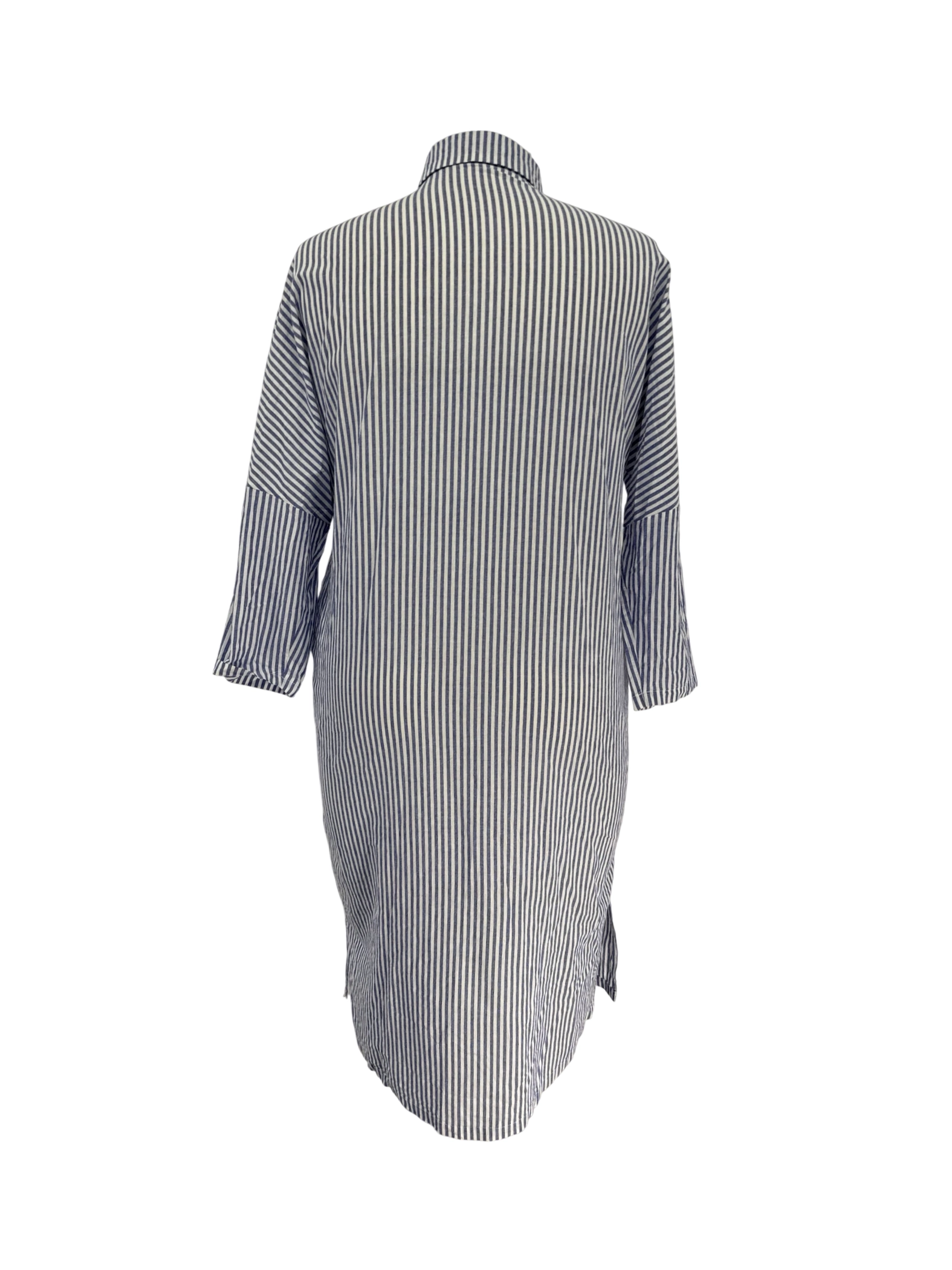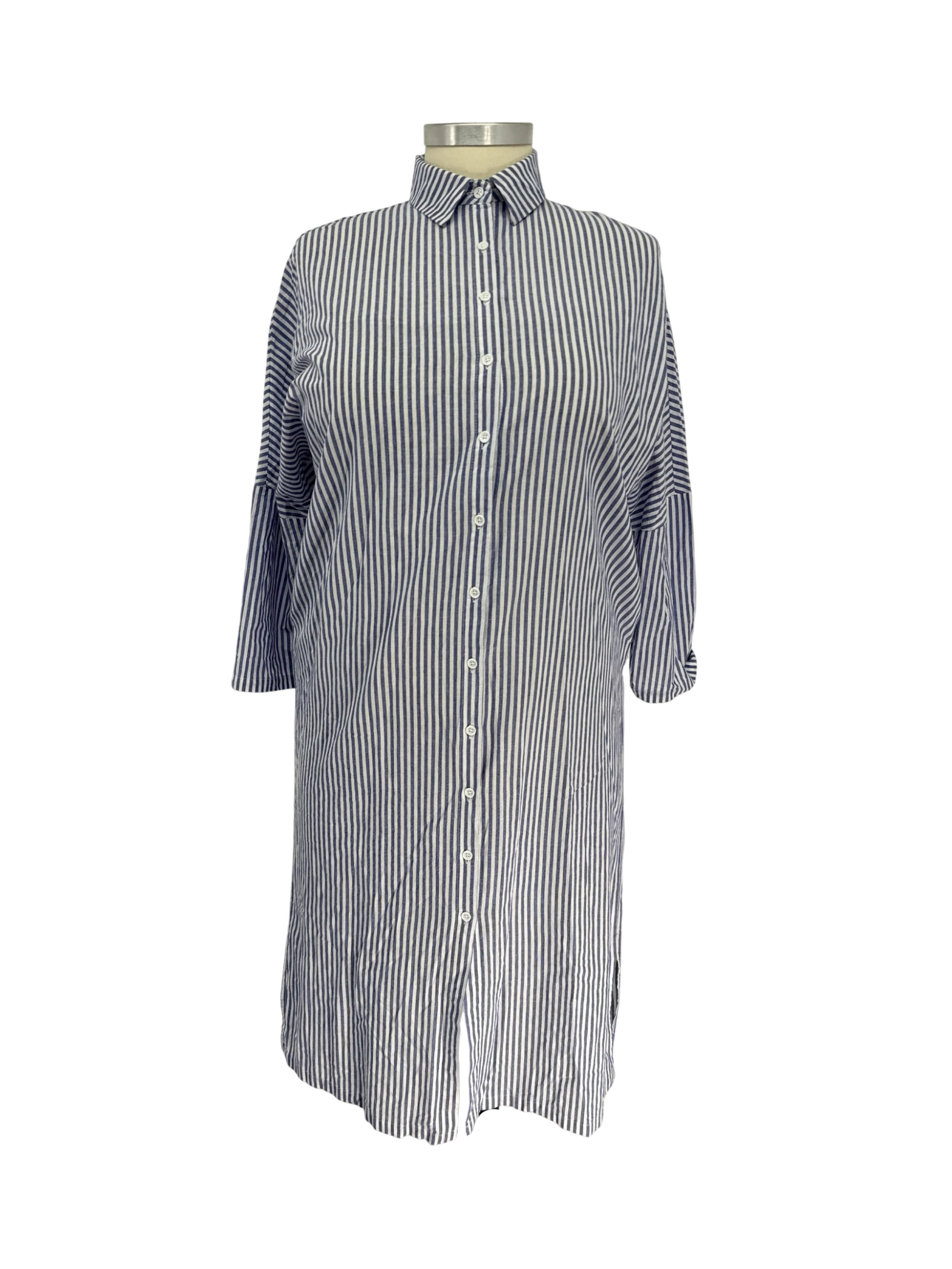 Elevate your casual wardrobe with this pre-owned striped shift dress. Crafted from breathable 100% cotton, this dress offers both comfort and style. Featuring a classic collar neckline and long sleeves that can be folded up, it's perfect for warmer days. Its versatile design makes it suitable for various casual occasions. This midi-length dress offers a relaxed fit, ensuring both comfort and a chic look. A sustainable and stylish addition to your closet!