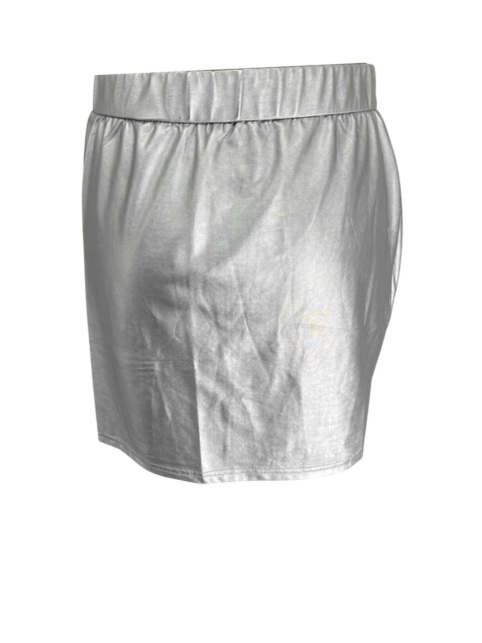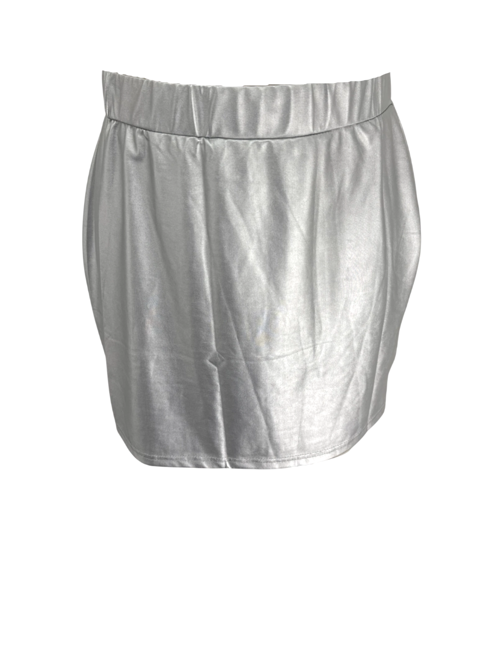 This pre-owned silver metallic mini skirt is a stylish and versatile addition to any wardrobe. The skirt features a flattering A-line silhouette and an elastic waistband for a comfortable fit. Made from a blend of polyester and elastane, it offers both durability and stretch. Perfect for a night out or a casual day look, this skirt adds a touch of glamour and shine. It is suitable for Spring, Summer, and Fall and can be easily styled up or down. A pre-owned skirt in excellent condition.