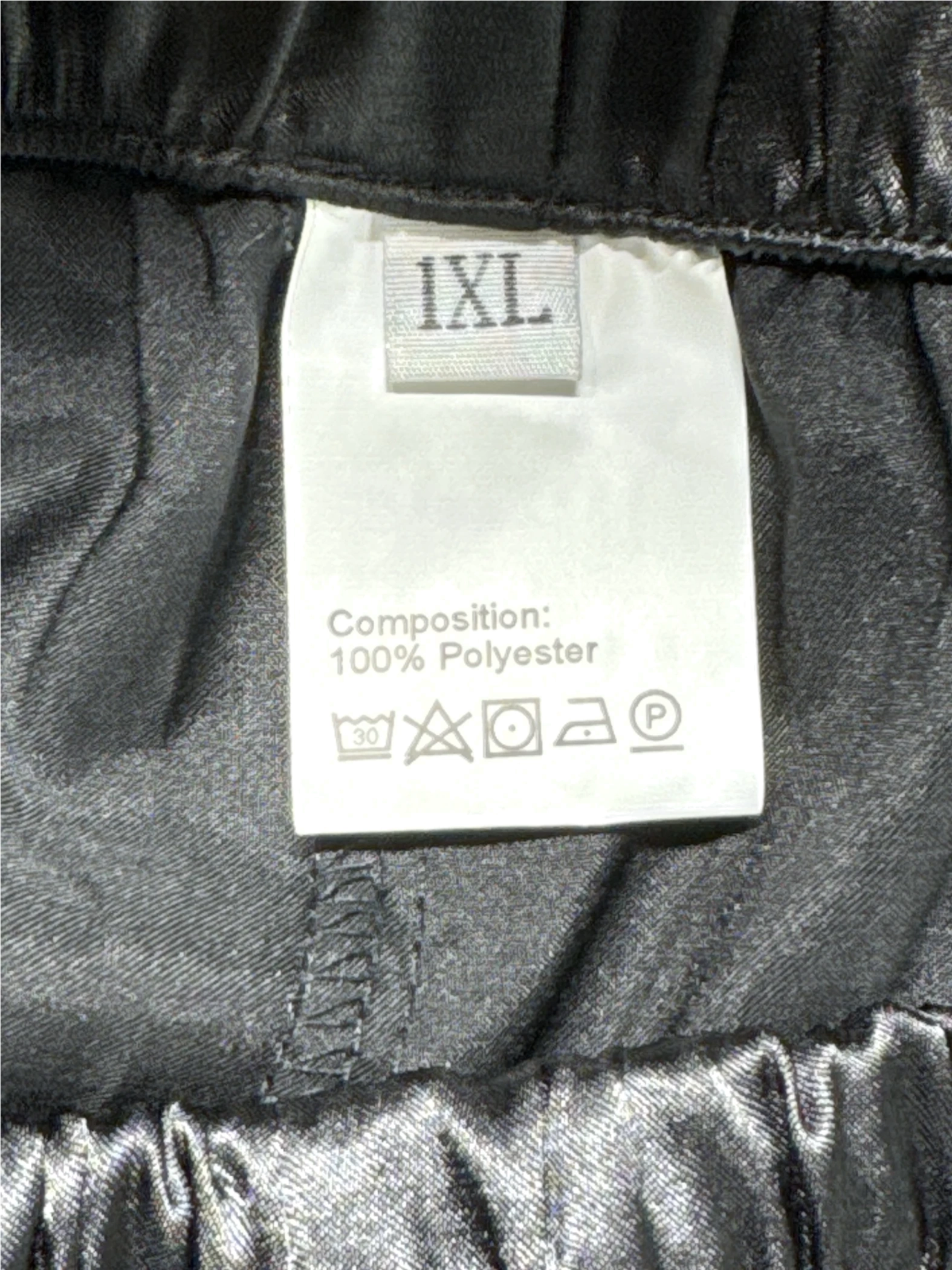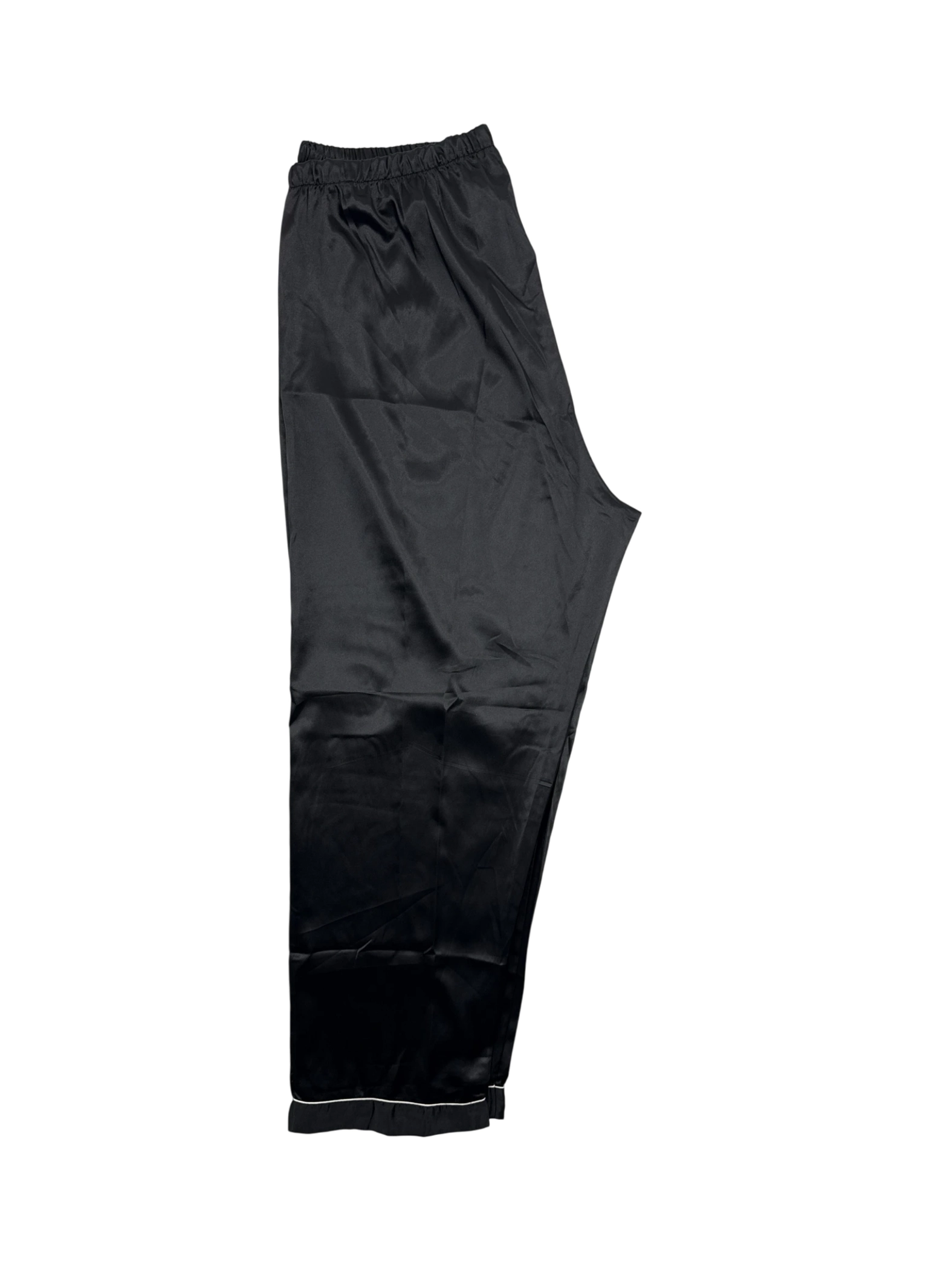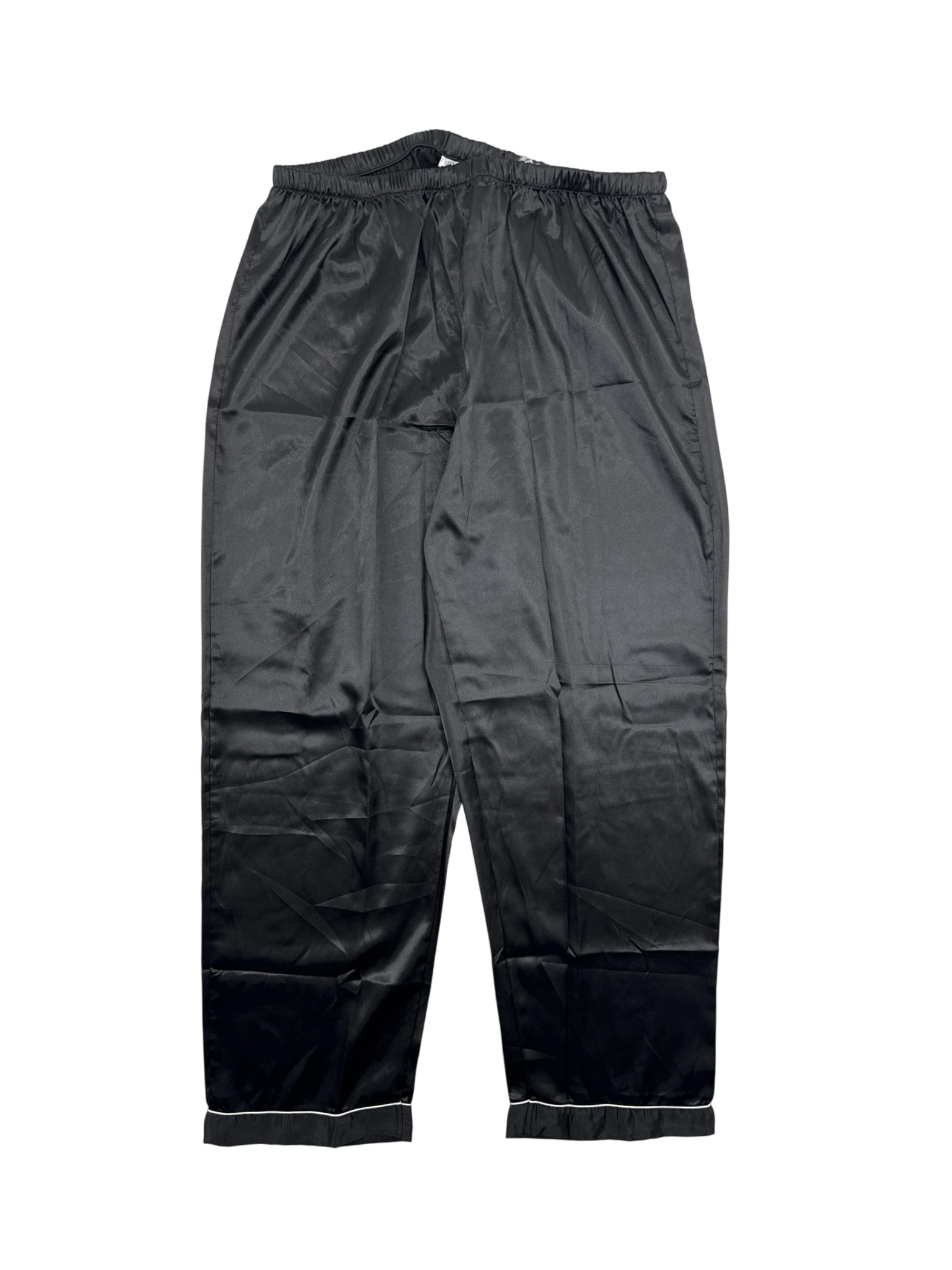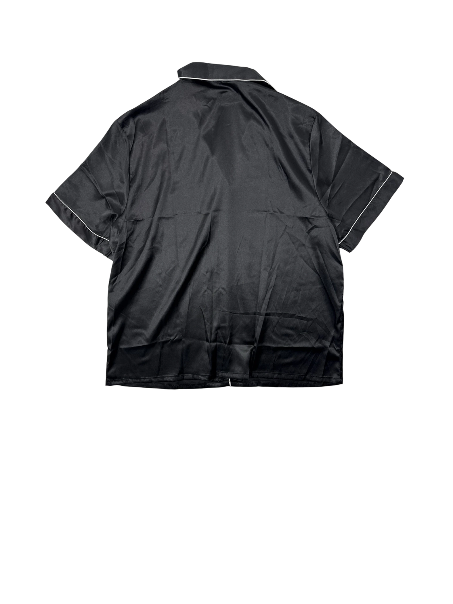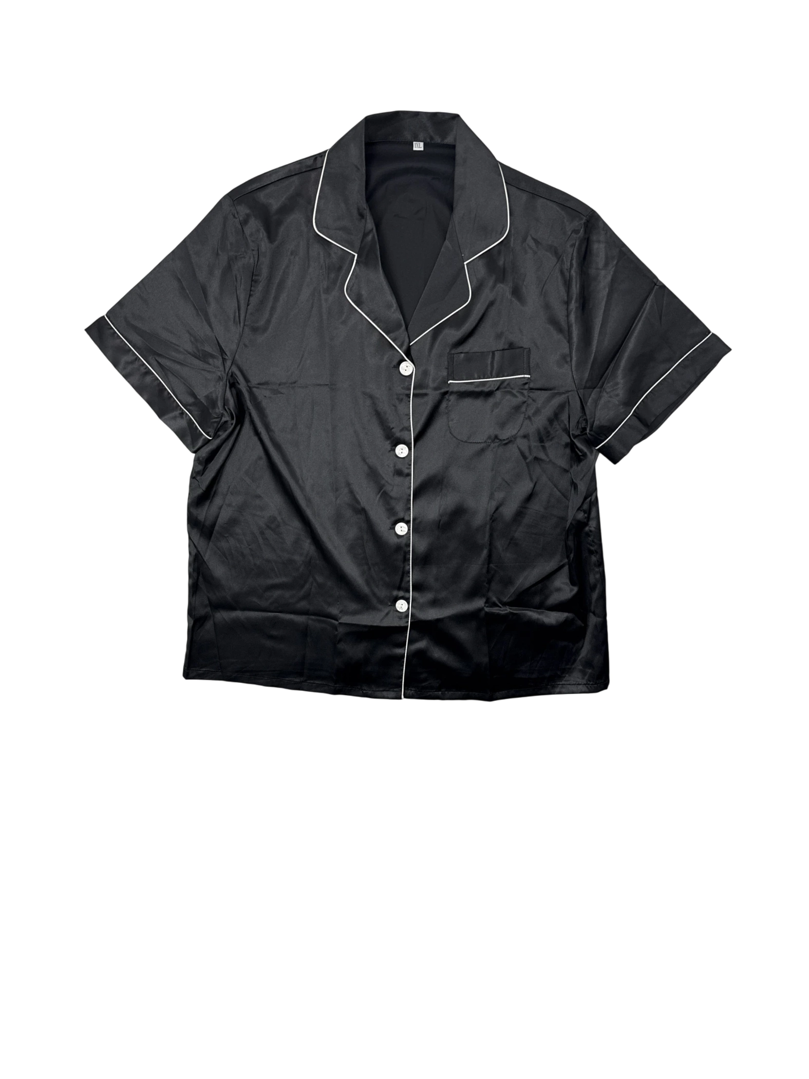 Indulge in luxurious comfort with this pre-owned black satin pajama set. This cozy sleepwear ensemble features a button-down short-sleeve shirt and matching pants, both trimmed with elegant white piping. Crafted from smooth satin, this set provides a silky touch against your skin. Perfect for warm summer nights or as a loungewear option during cooler seasons. A stylish and affordable addition to your sleep wardrobe. Great for gifting or treating yourself.