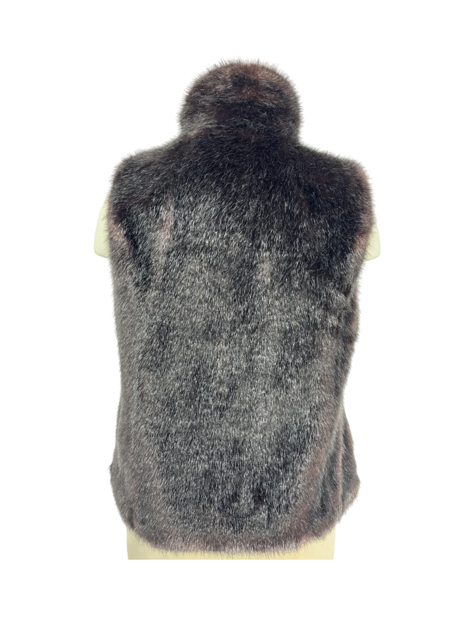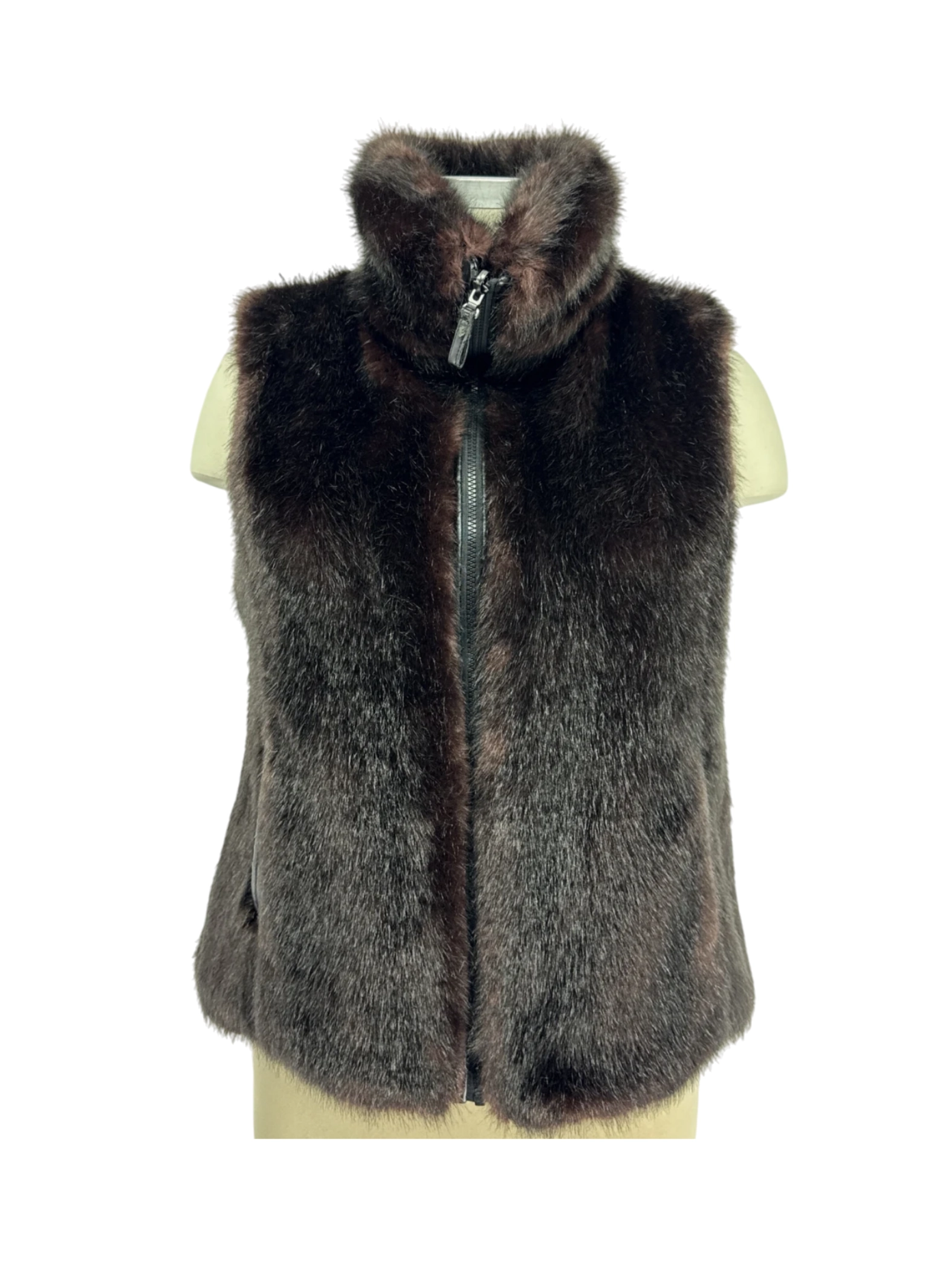 This pre-owned women's vest is a cozy and stylish addition to any wardrobe. Made from soft, faux fur, it offers warmth and a touch of luxury. The vest features a high collar, a full zip closure, and a versatile brown color that complements various outfits. Perfect for layering, it's an ideal choice for fall and winter, offering both comfort and fashion-forward flair.