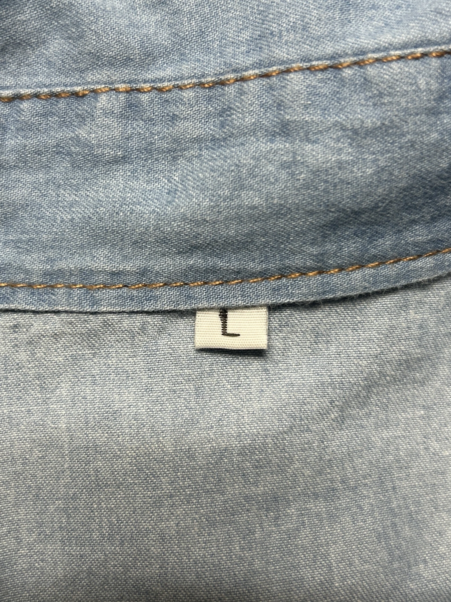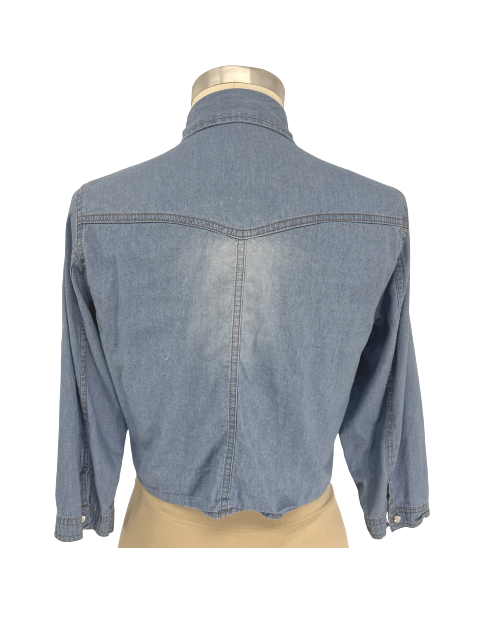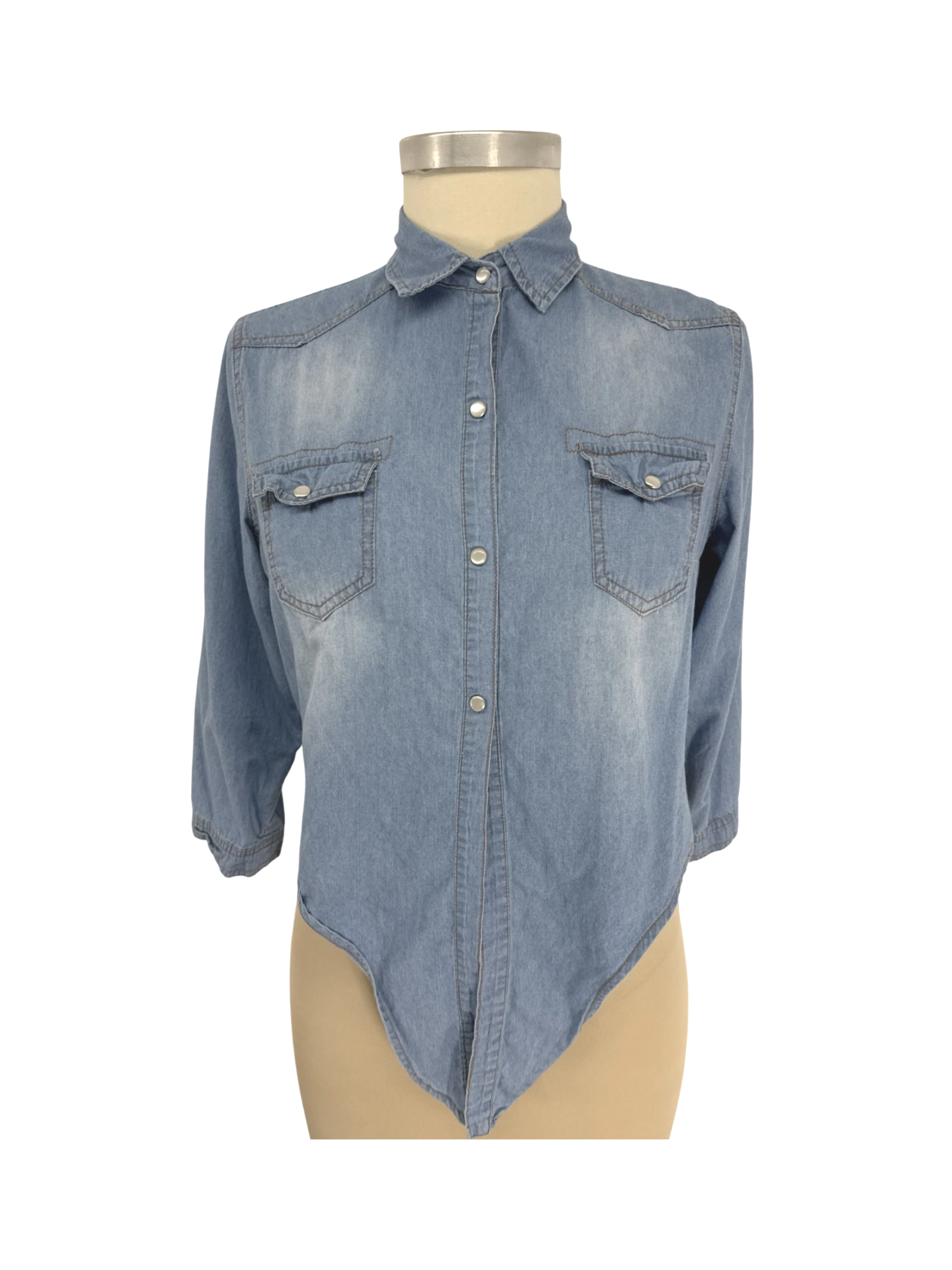 This is a stylish pre-owned denim shirt perfect for any casual occasion. Crafted from a comfortable denim blend, it features a classic button-up design, two chest pockets, and ¾ sleeves. The medium wash adds a touch of vintage charm. Suitable for spring, summer, and fall, this shirt is easy to style. It can be paired with jeans, skirts or leggings. A wardrobe essential that offers both style and comfort.