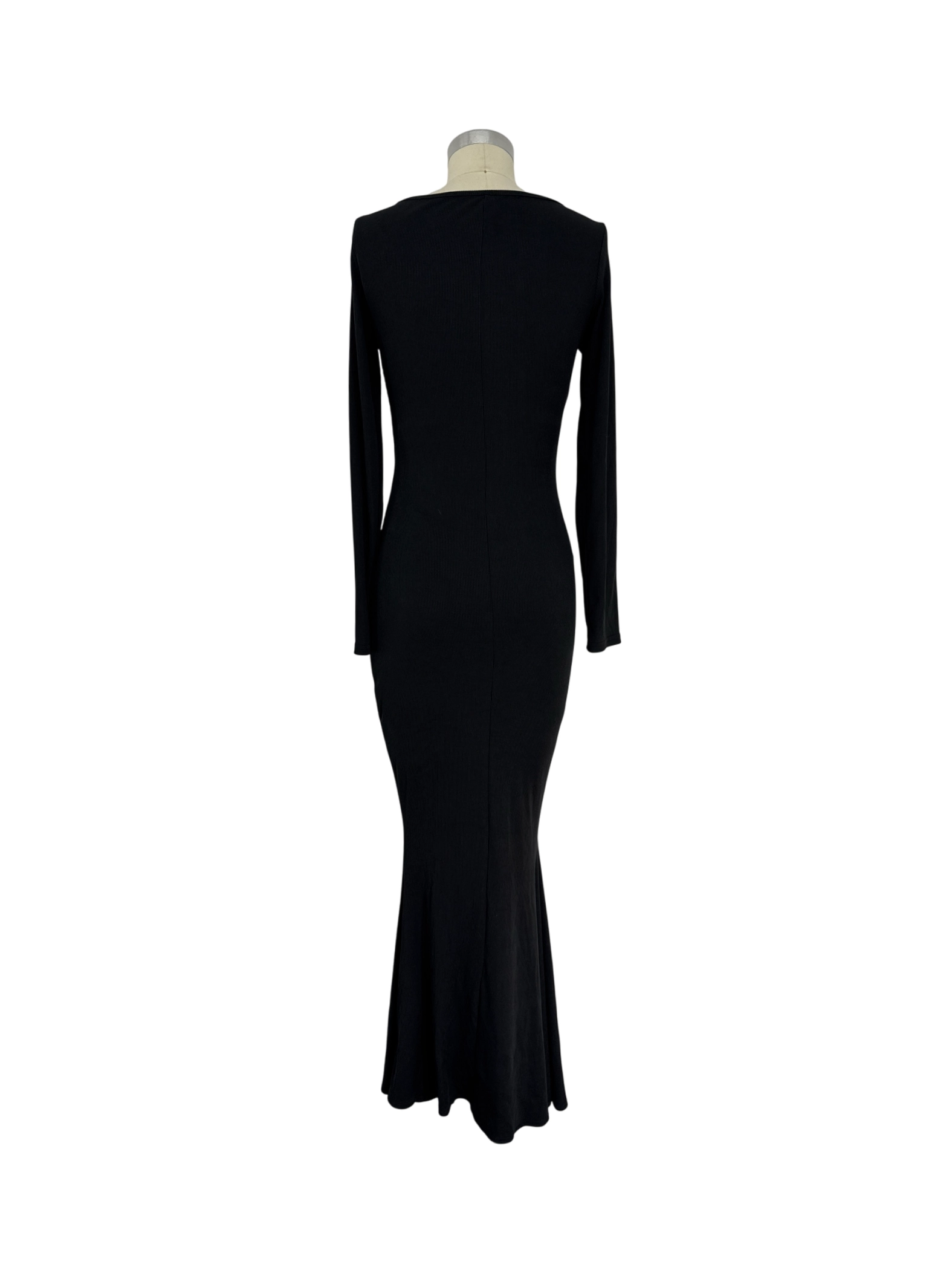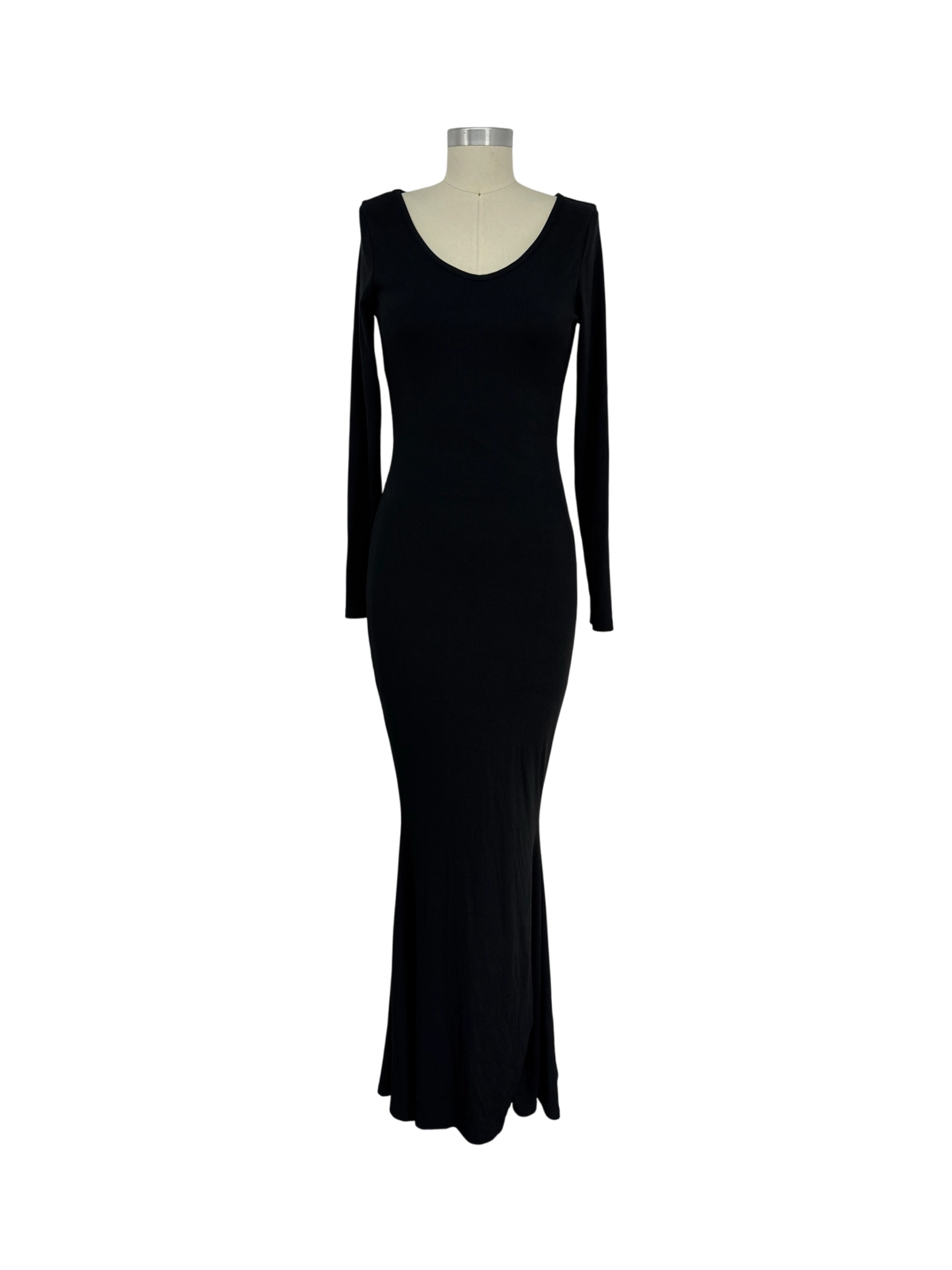 Embrace elegance with this sleek black maxi dress. Perfect for various occasions, this bodycon dress features a flattering V-neck and long sleeves, ideal for cooler seasons. Crafted from a comfortable blend of polyester and spandex, it offers a form-fitting silhouette. This pre-owned dress is a versatile addition to any wardrobe, suitable for casual outings or evening events. Its classic design ensures timeless appeal. - Elevate your evening look with this stunning pre-owned black maxi dress. This bodycon dress is designed with a flattering V-neckline and long sleeves for a sophisticated touch. Crafted from a comfortable polyester blend, it offers a sleek, form-fitting silhouette perfect for any cocktail or party event. Its classic design ensures timeless elegance, making it a versatile addition to your wardrobe.
