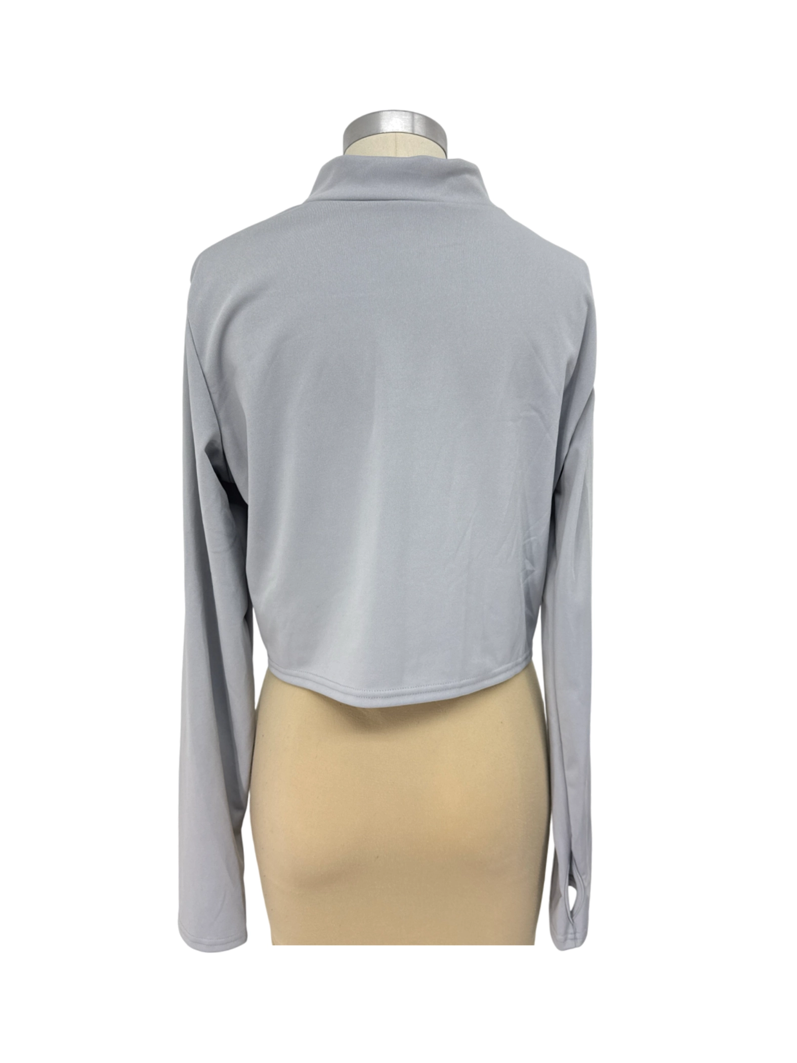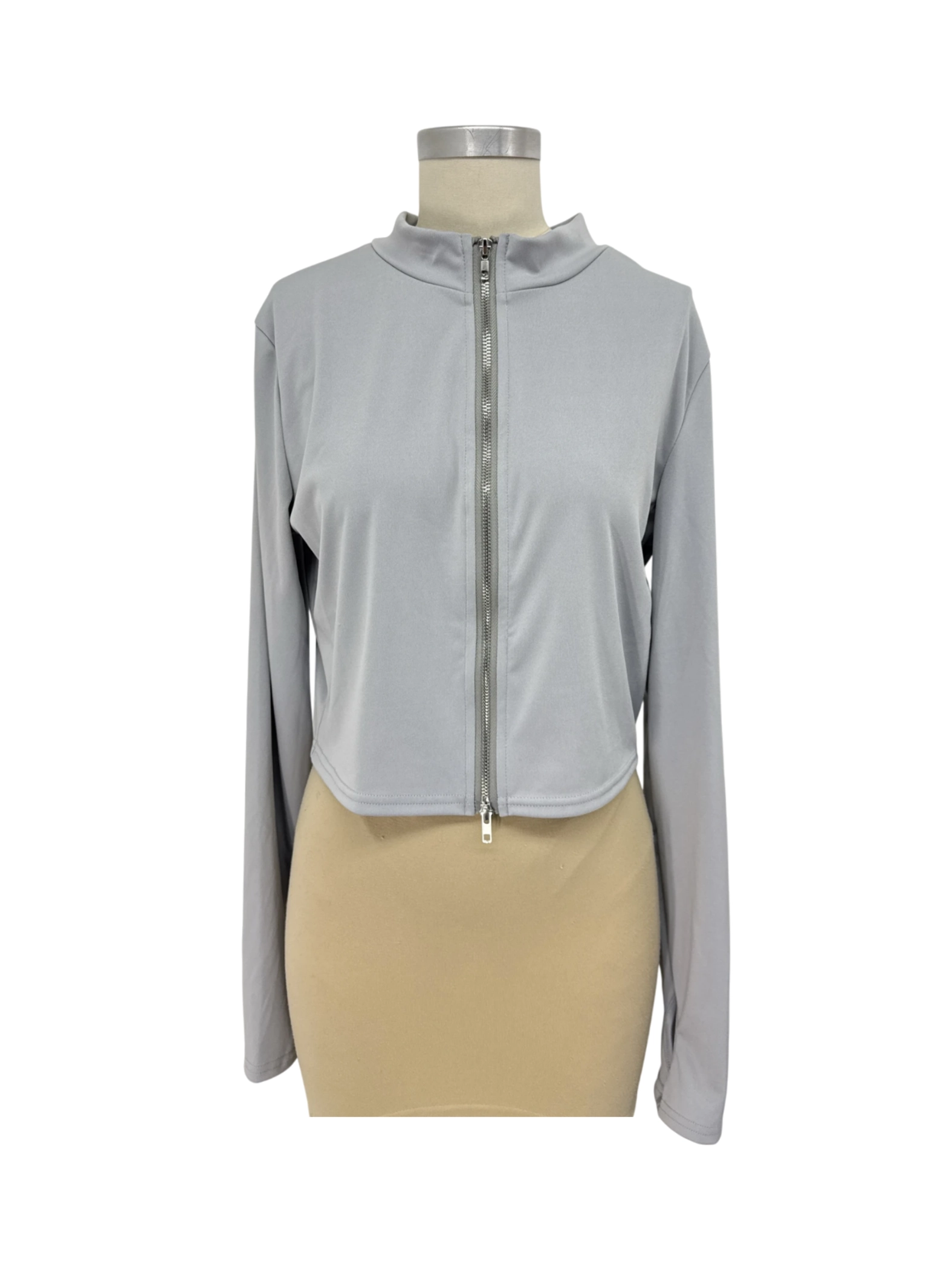 Cropped - This stylish pre-owned women's jacket is a versatile addition to any wardrobe. Crafted from a comfortable blend of polyester and spandex, this jacket features a sleek, modern design perfect for a casual or dressed-up look. The jacket boasts a flattering silhouette and a versatile solid gray color, making it easy to pair with various outfits. Lightweight and perfect for spring and fall wear.