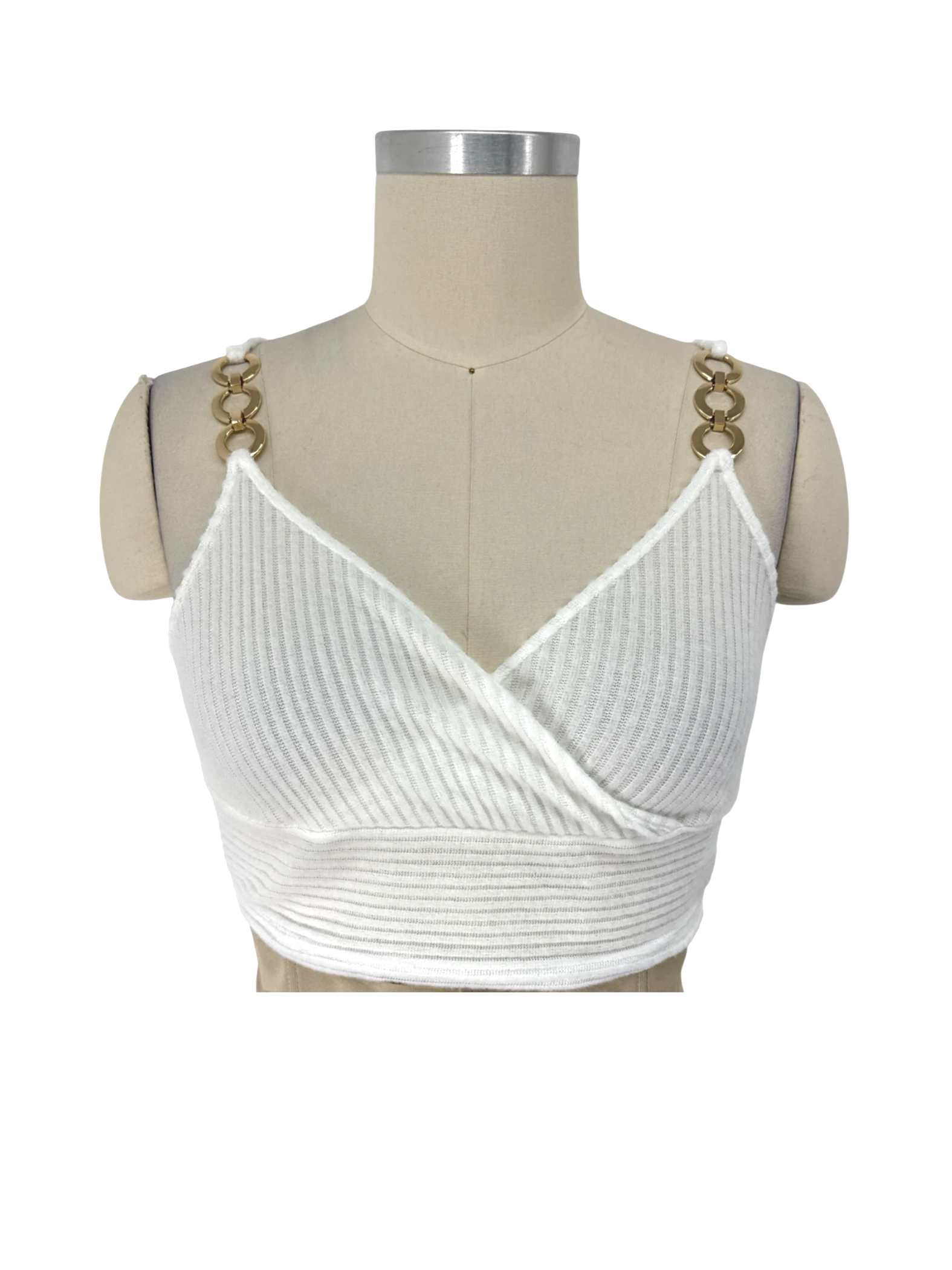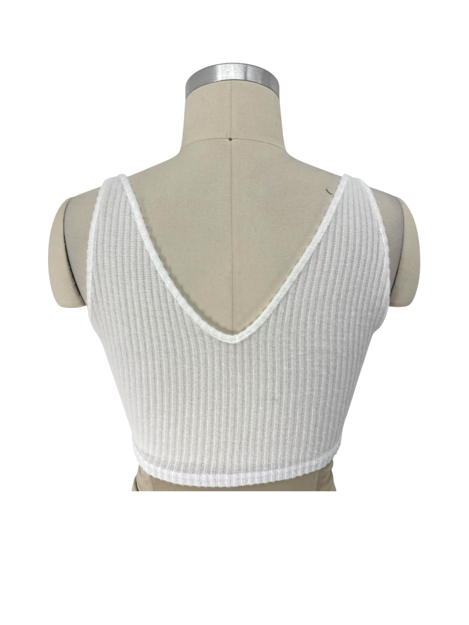 Elevate your summer style with this chic pre-owned white crop top. Featuring a flattering V-neck design, delicate chain straps, and a comfortable fit, this top is perfect for warm weather. The ribbed fabric adds a touch of texture, while the cropped length pairs effortlessly with high-waisted bottoms. Made from a blend of polyester and spandex, it offers a soft and stretchy feel. A versatile piece that's ideal for casual outings or a night out. It's in excellent condition, ready to be a new staple in your wardrobe.