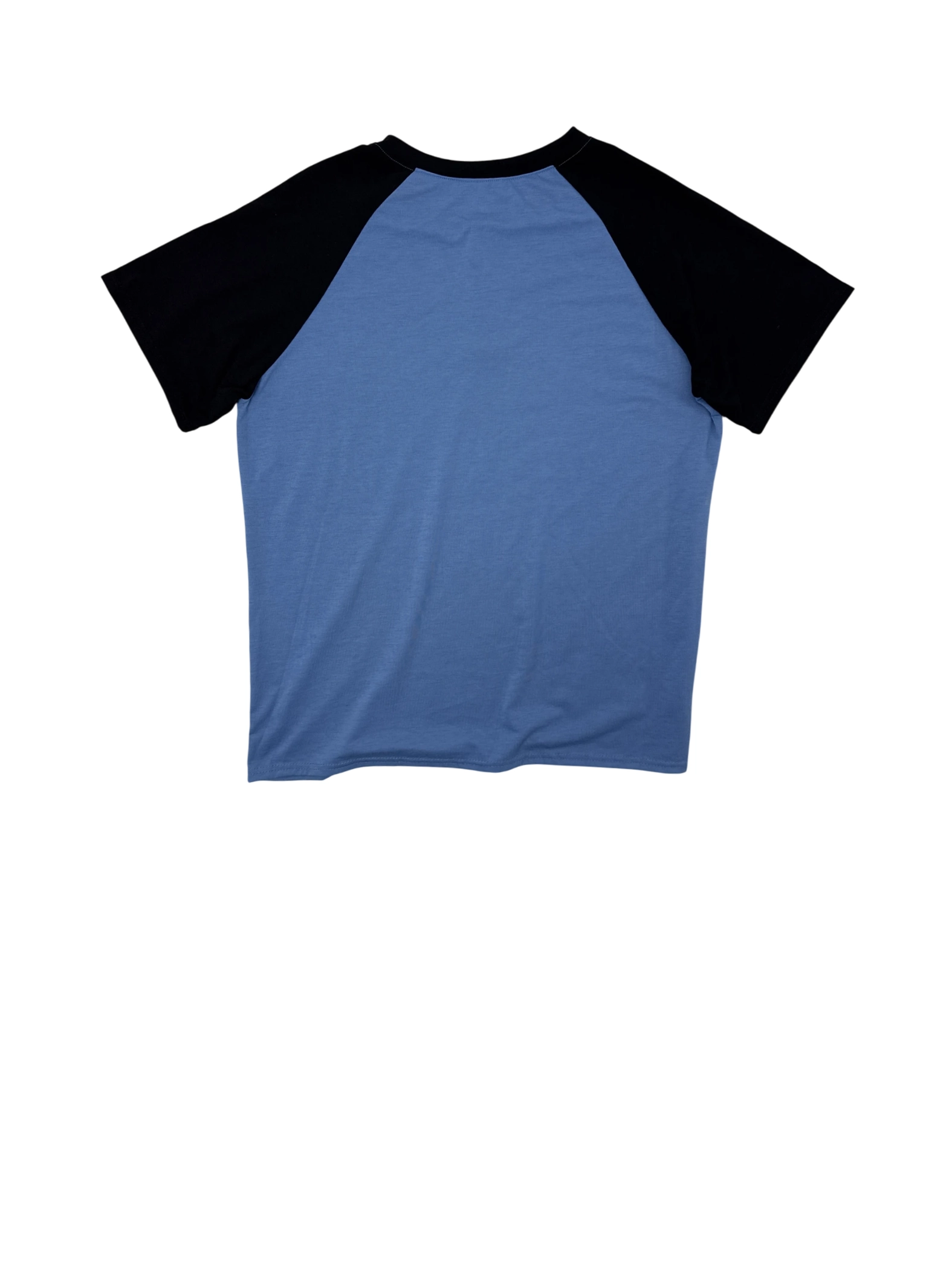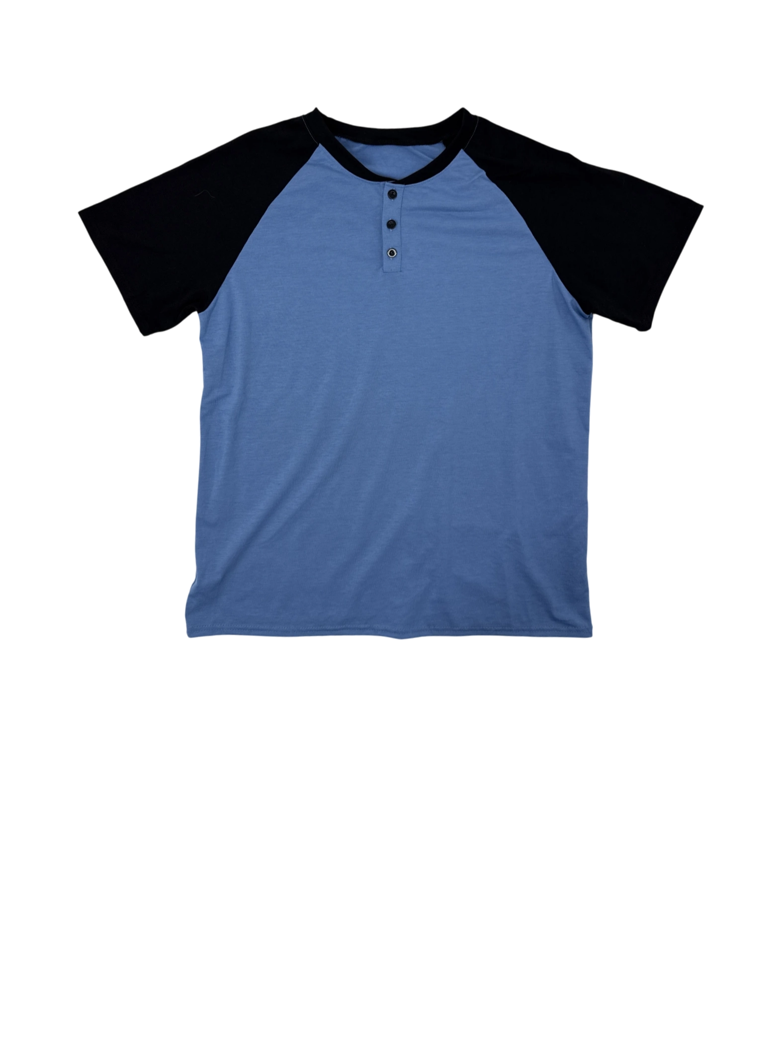 This stylish men's top features a classic baseball tee design with a modern twist. The contrasting black sleeves and neckline complement the blue body, creating a visually appealing look. It's made from a comfortable blend of polyester and cotton. Perfect for casual outings or layering, this top is a versatile addition to any wardrobe. The button-up detail adds a touch of sophistication, suitable for various occasions.