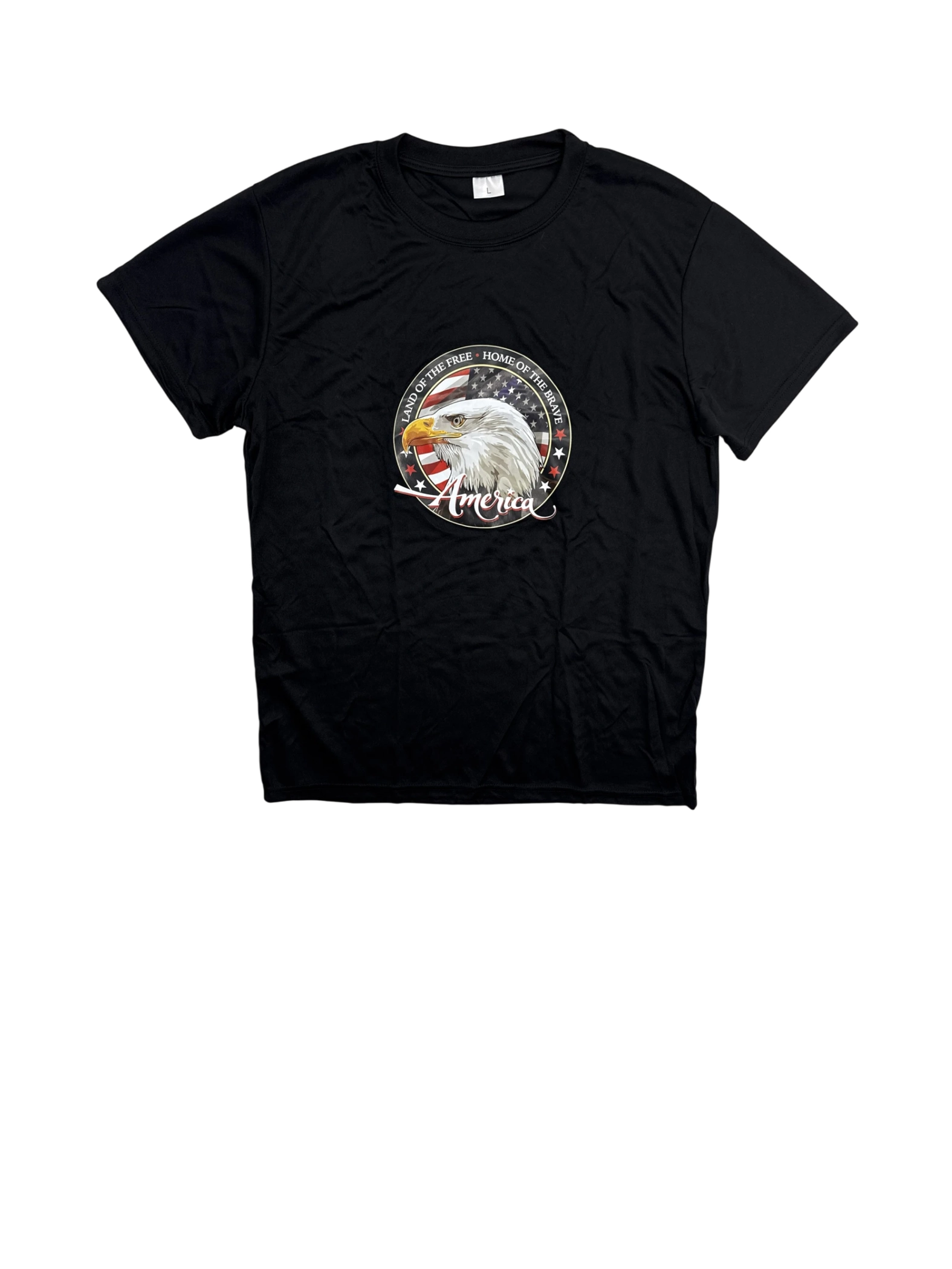 Show your patriotism with this stylish men's t-shirt. Featuring a bold American eagle graphic with the words "Land of the Free, Home of the Brave" and "America", this tee is perfect for expressing your pride. Crafted from a comfortable polyester fabric, it's ideal for everyday wear. With its classic round neck and short sleeves, this t-shirt offers both style and comfort. Wear it at a summer BBQ or during 4th of July.