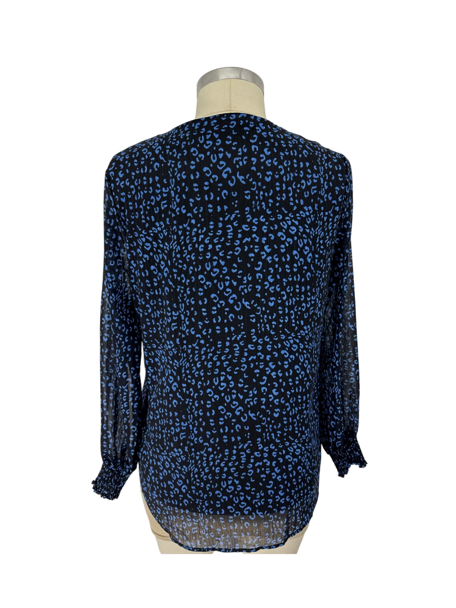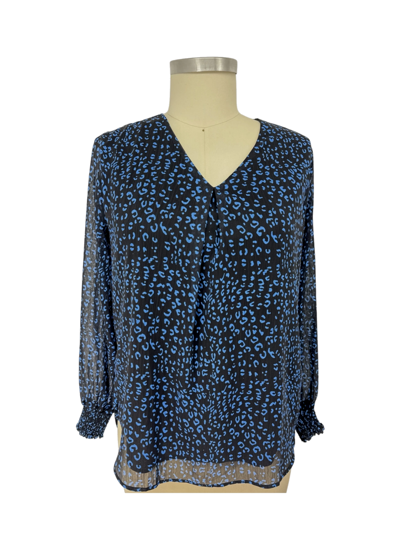 This pre-owned women's top is a stylish blouse with a V-neck and long sleeves. The top features an eye-catching animal print in blue and black, perfect for adding a pop of personality to any outfit. Made from lightweight polyester, this top is comfortable and easy to wear. Ideal for spring and fall, this blouse is a versatile addition to any wardrobe, offering a chic and effortless look for various occasions.