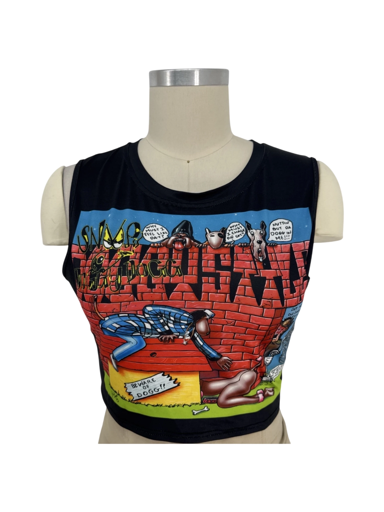 This unique and vibrant cropped tank top is a statement piece. The top is crafted from a blend of polyester and spandex, ensuring a comfortable and flexible fit. The sleeveless design and cropped length make it ideal for warm weather, while the graphic print adds a touch of personality. Perfect for casual outings or layering under a jacket, this top is a versatile addition to any wardrobe.