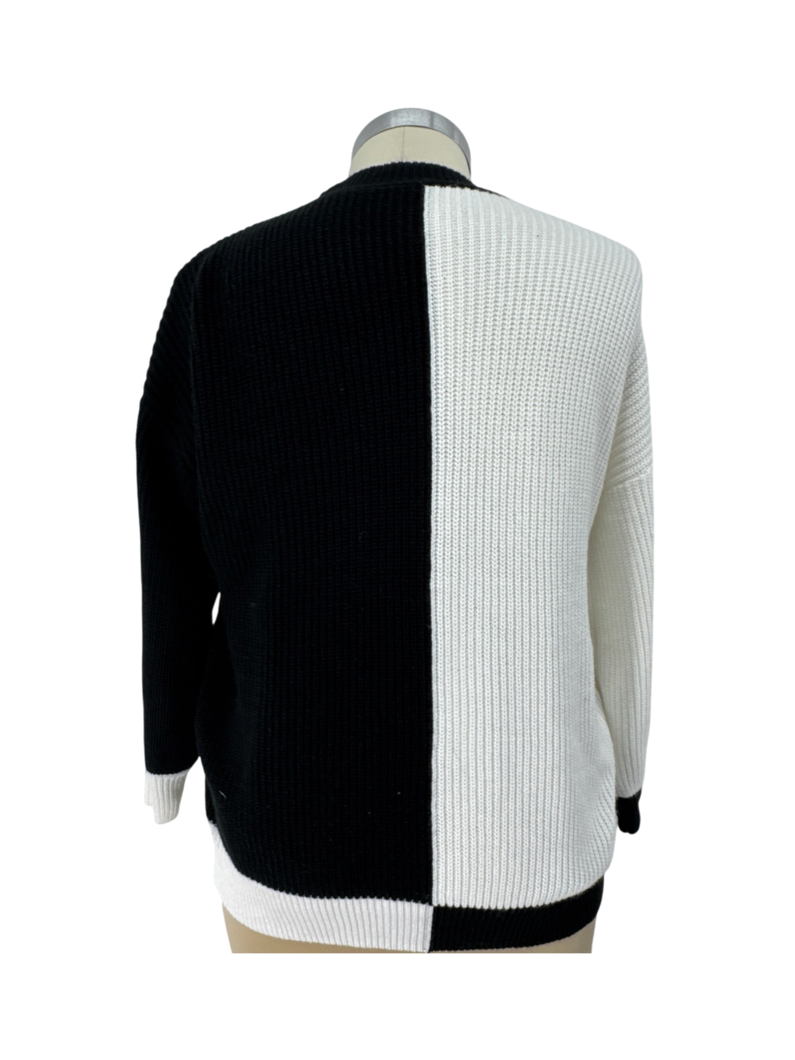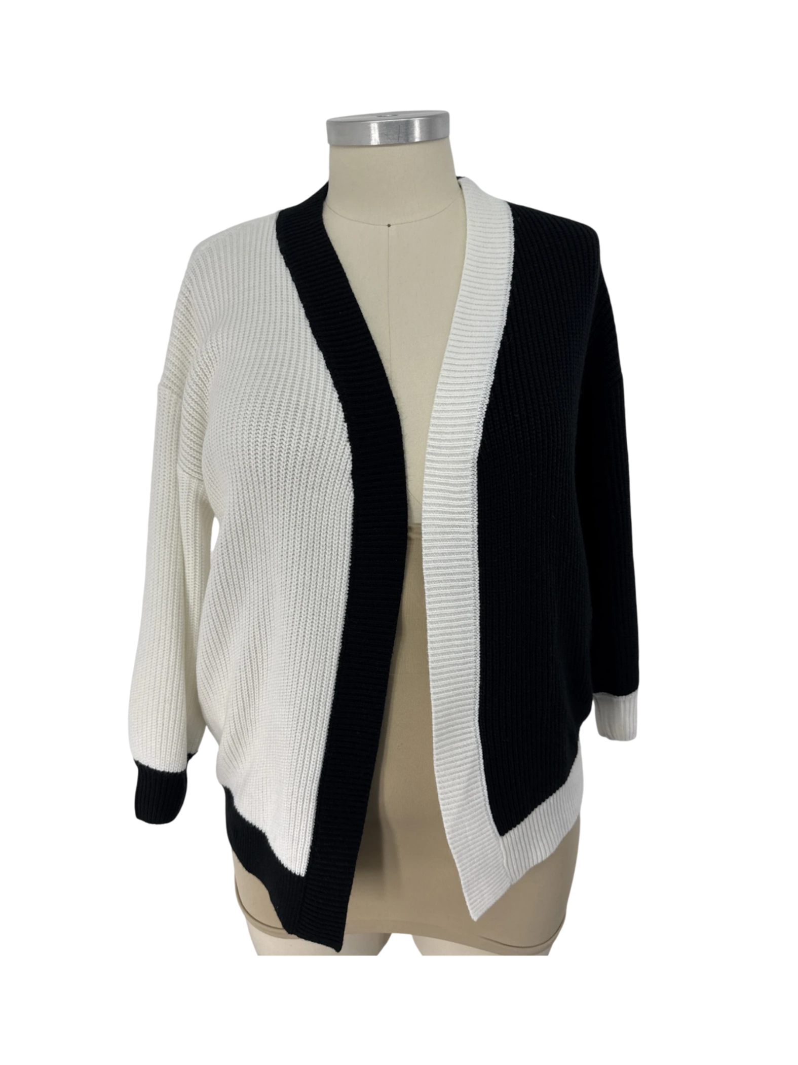 This stylish and comfortable pre-owned cardigan sweater is a perfect addition to any wardrobe. Featuring a classic open front design with color-block detailing in black and white, this sweater is made from 100% acrylic. Ideal for layering, it offers warmth and versatility for the fall and winter seasons. The sweater's classic design will complement any outfit. This pre-loved cardigan is a sustainable choice, combining fashion and eco-consciousness.