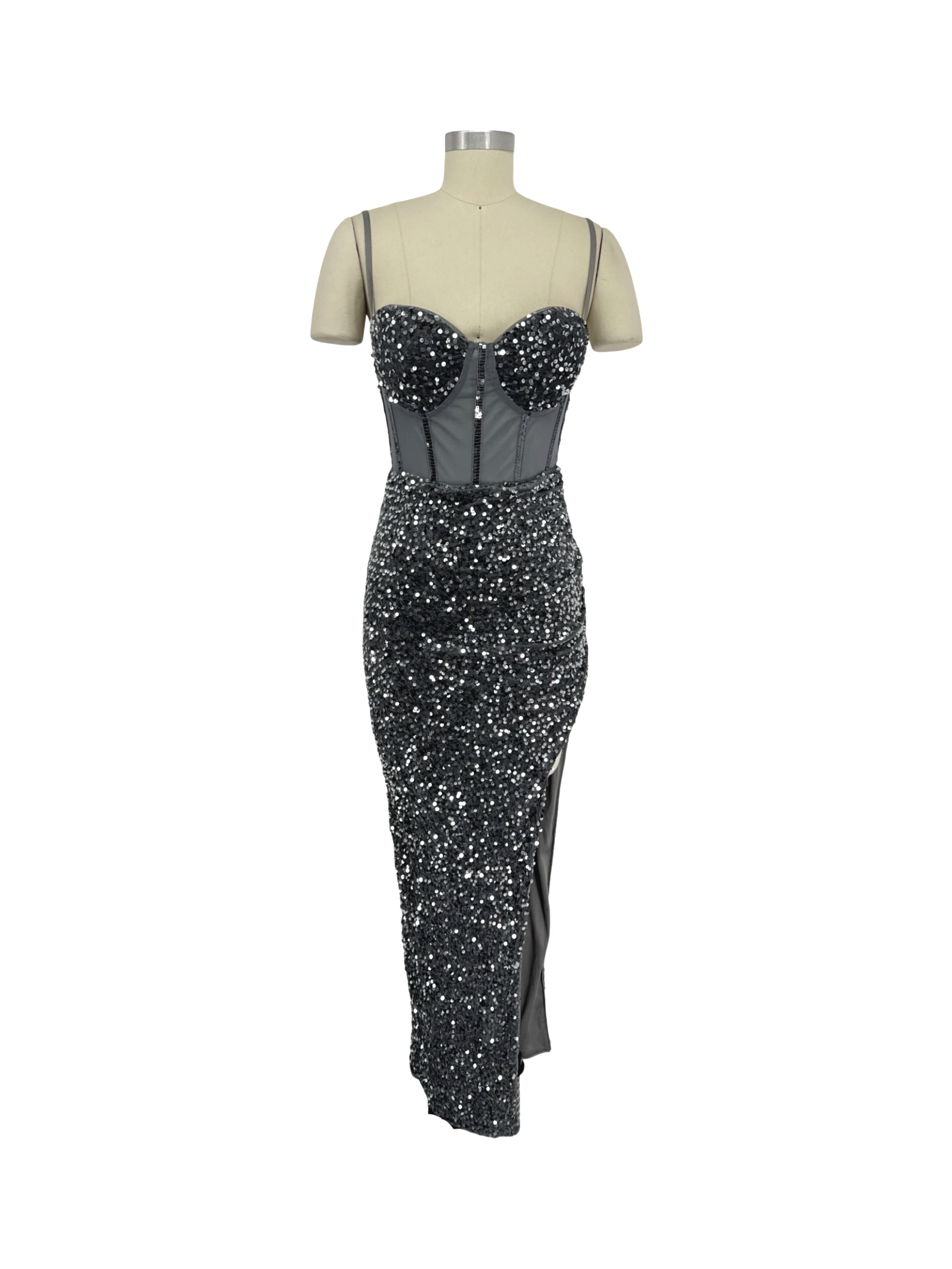 Elevate your evening attire with this stunning sequin maxi dress. This glamorous pre-owned dress features a fitted bodice with delicate spaghetti straps and a figure-hugging silhouette. The full sequin detailing adds a touch of sparkle, making it perfect for special occasions or a night out. The dress's flattering design and dramatic flair ensure you'll turn heads wherever you go. A must-have for any fashion-forward wardrobe, exuding elegance and sophistication.
