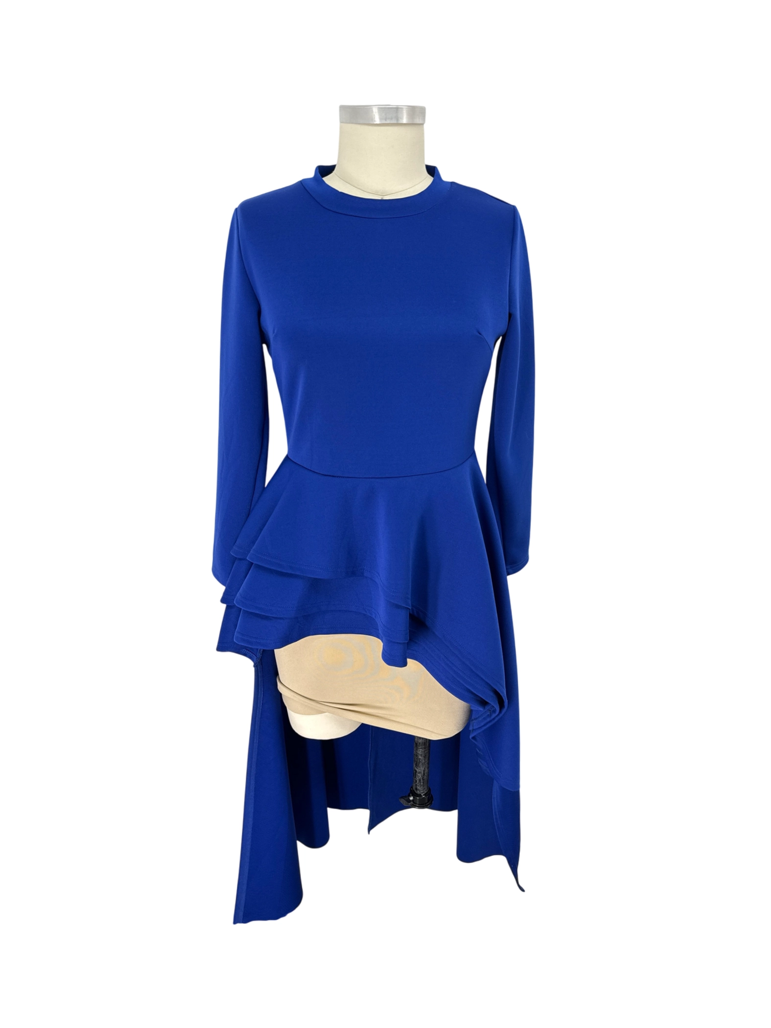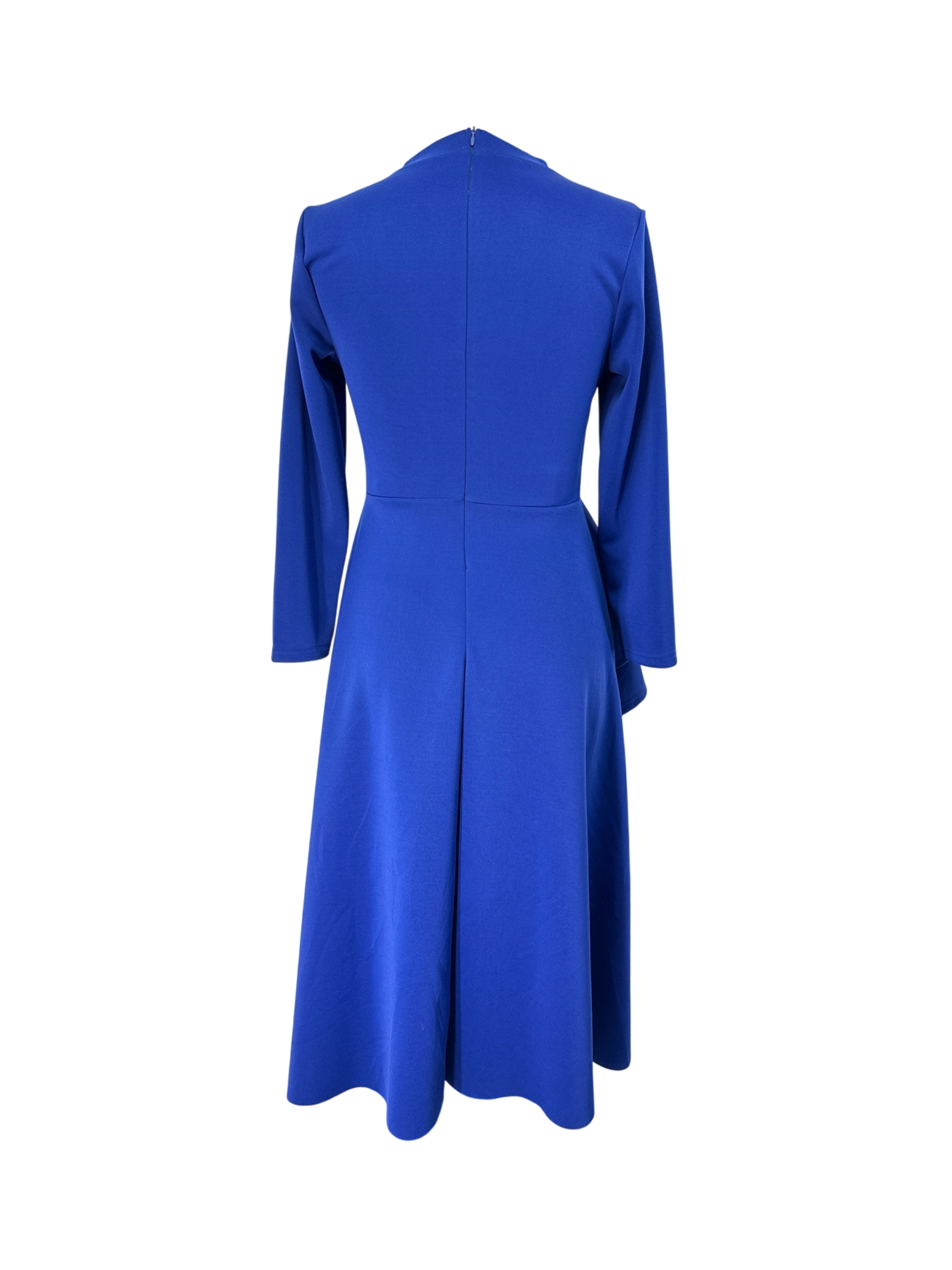 This stunning pre-owned A-line dress in a vibrant blue hue is perfect for a chic and effortless look. The dress features a flattering silhouette with long sleeves and a unique peplum design. Crafted from high-quality polyester, this midi dress is ideal for spring or fall weather. The dress is available in size L. A versatile piece to wear for various casual occasions. The sleek design and flattering fit make it a wardrobe staple for any fashion-forward woman.