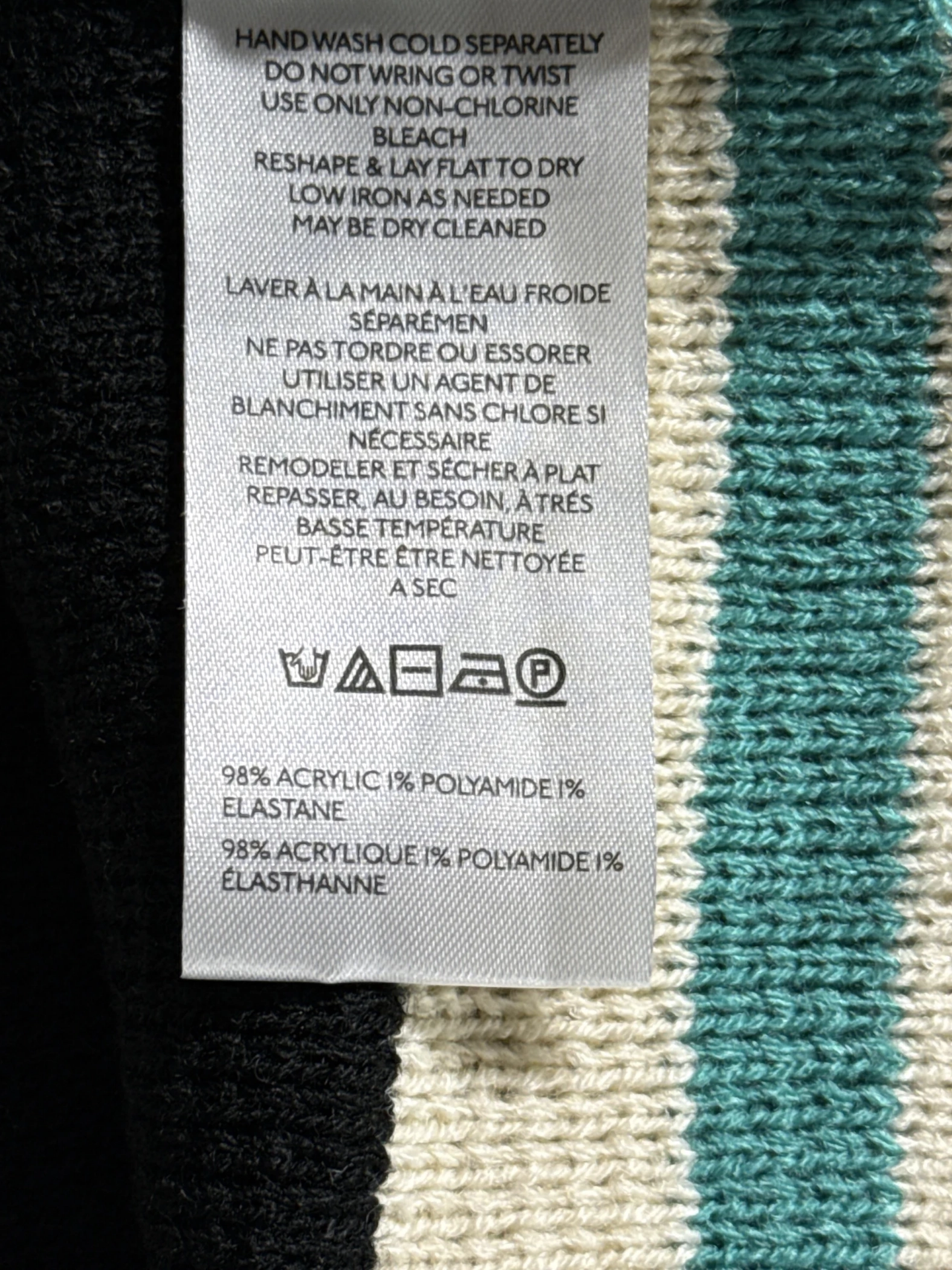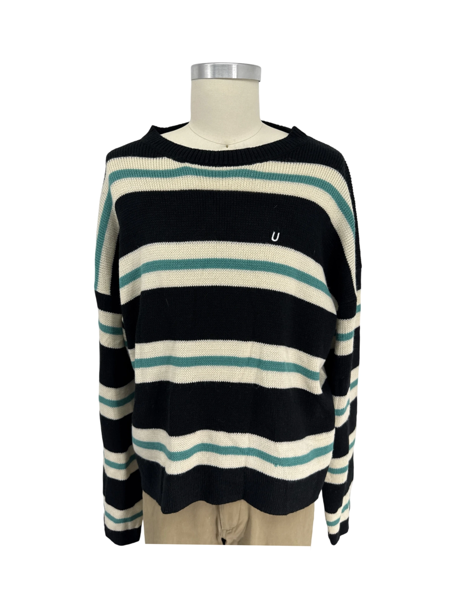 Elevate your wardrobe with this stylish Urban Outfitters striped sweater. Featuring a classic crew neck and long sleeves, this pullover is perfect for layering or wearing on its own. The black, white, and teal stripes add a touch of modern flair. Made from a comfortable acrylic blend, this sweater is designed for a relaxed fit. This pre-owned piece is a sustainable and chic addition to any closet.