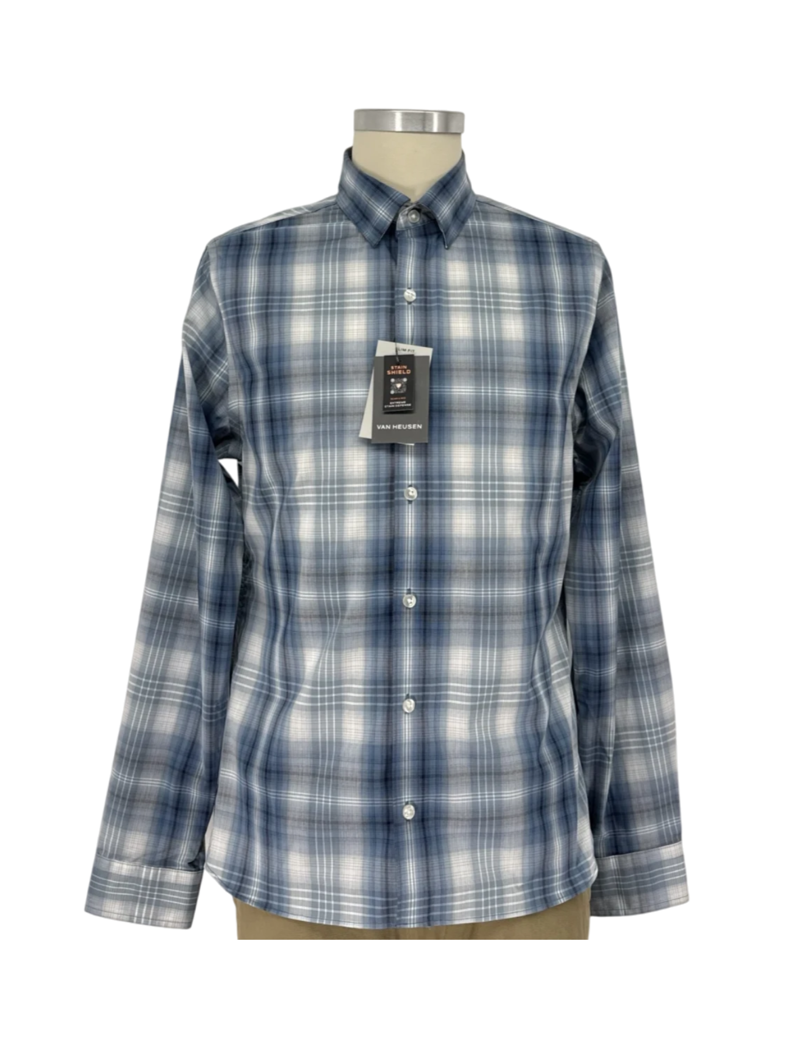 Elevate your wardrobe with this pre-owned Van Heusen men's shirt. Crafted from a comfortable cotton blend, this shirt features a classic plaid pattern in shades of blue and gray. Designed for a slim fit, it's perfect for both casual and business attire. With long sleeves and a button-down closure, this shirt is suitable for fall and winter wear. A timeless piece that combines style and comfort.