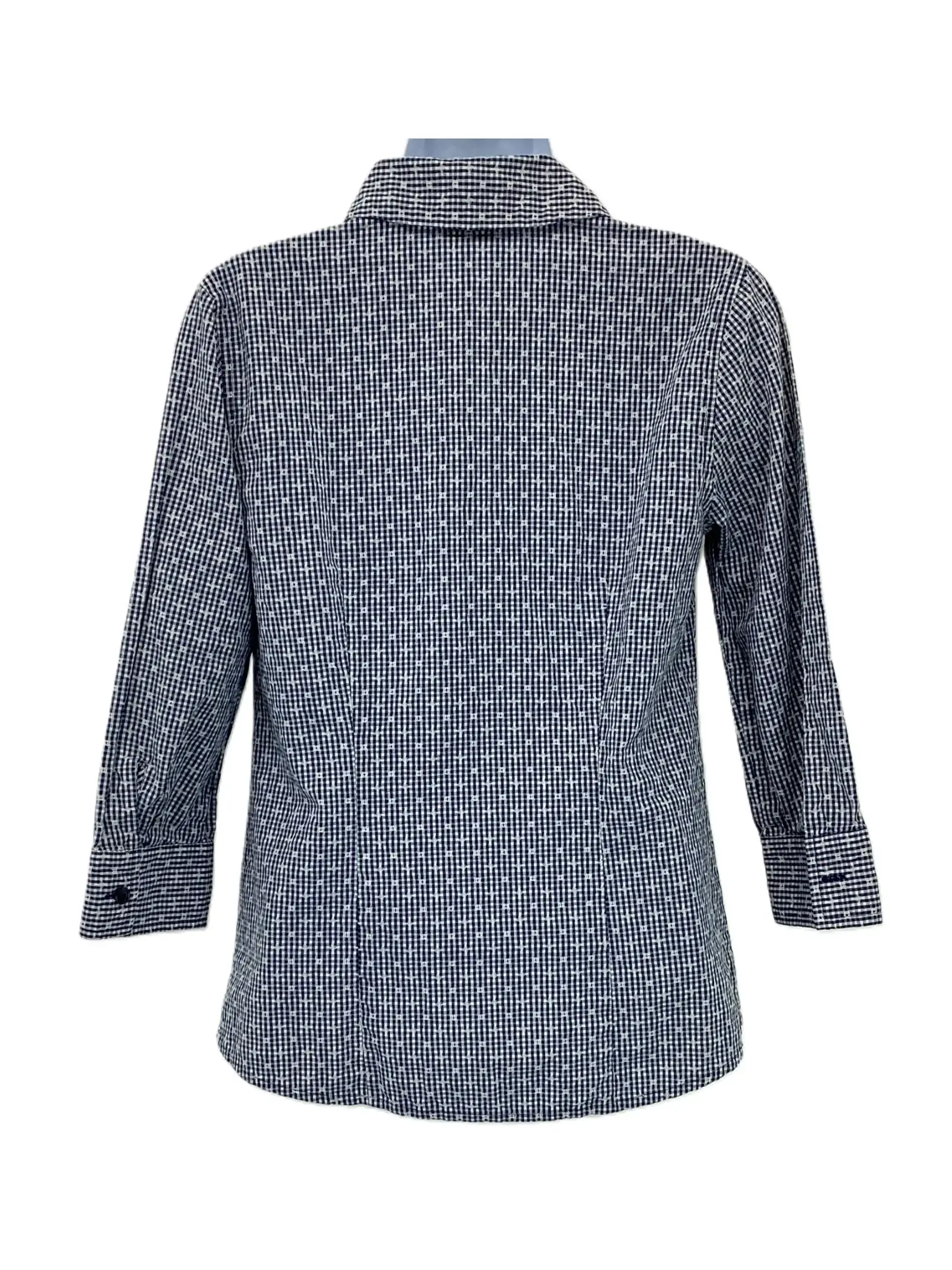 The Van Heusen women's top is size XS and features a blue and white checker pattern with 3/4 sleeves.