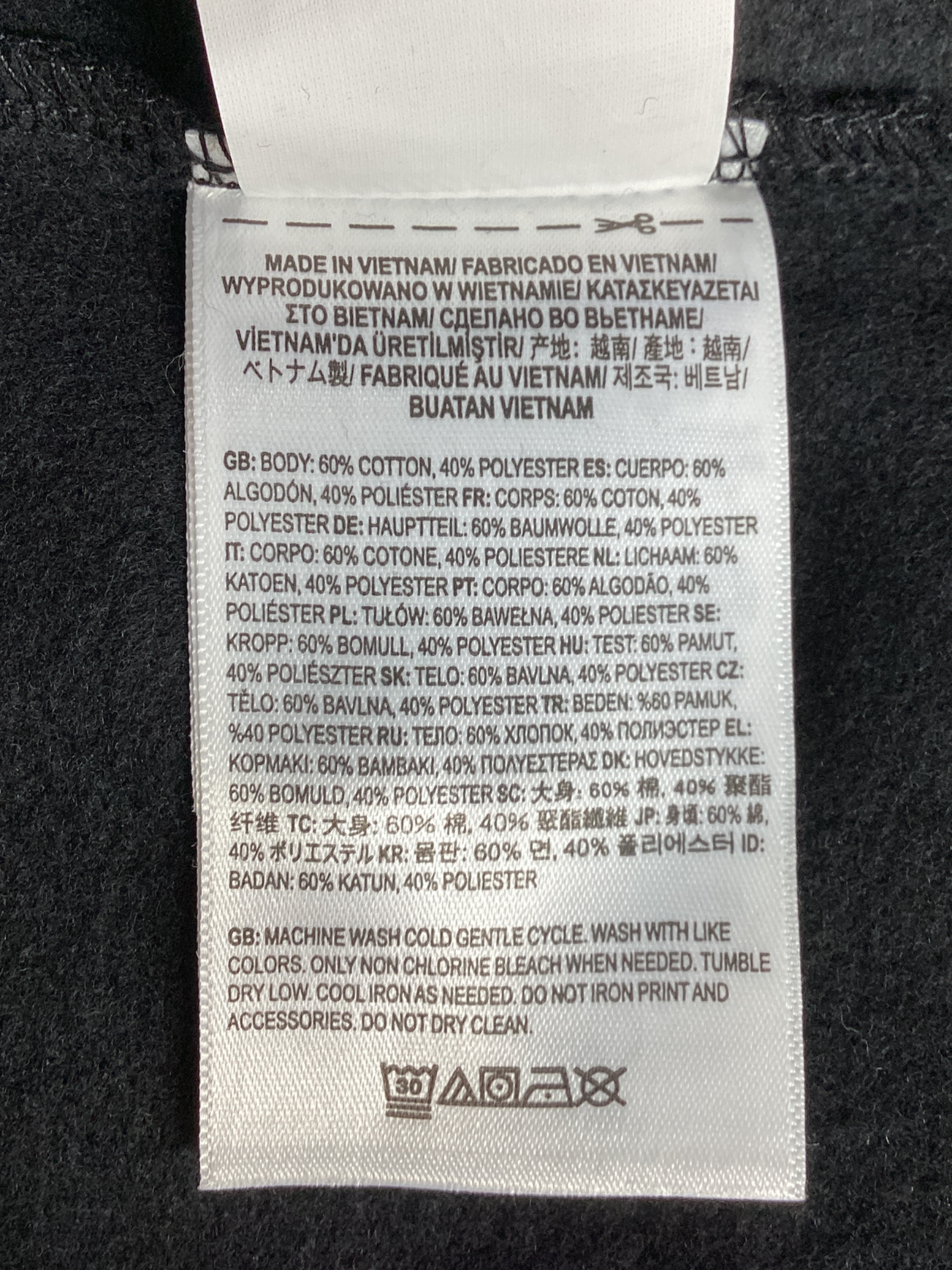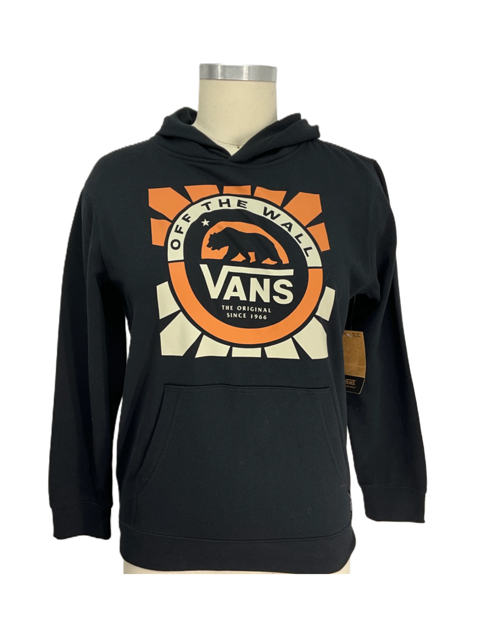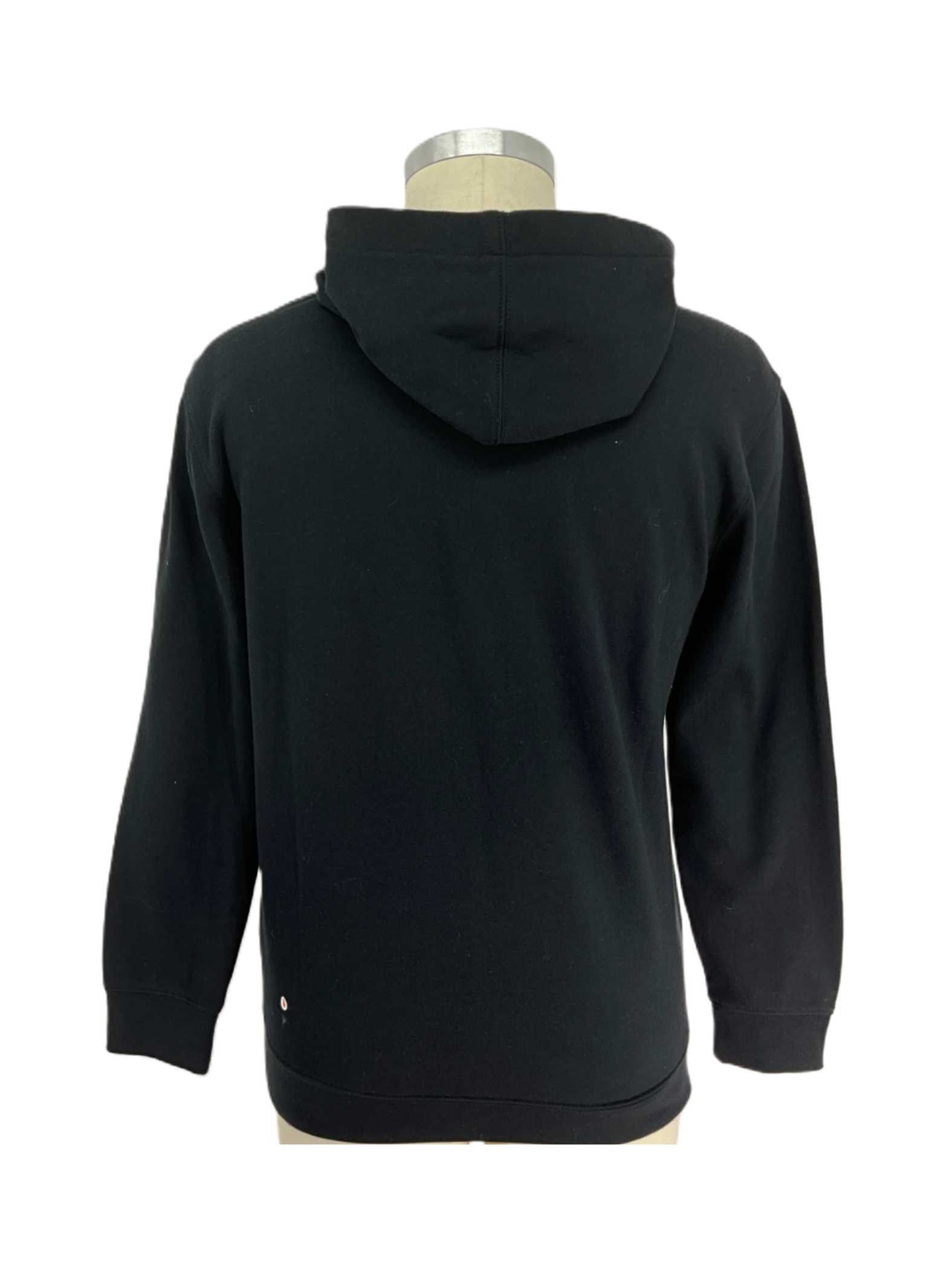 A black hoodie for kids in size large, unisex, with long sleeves and a blemish.