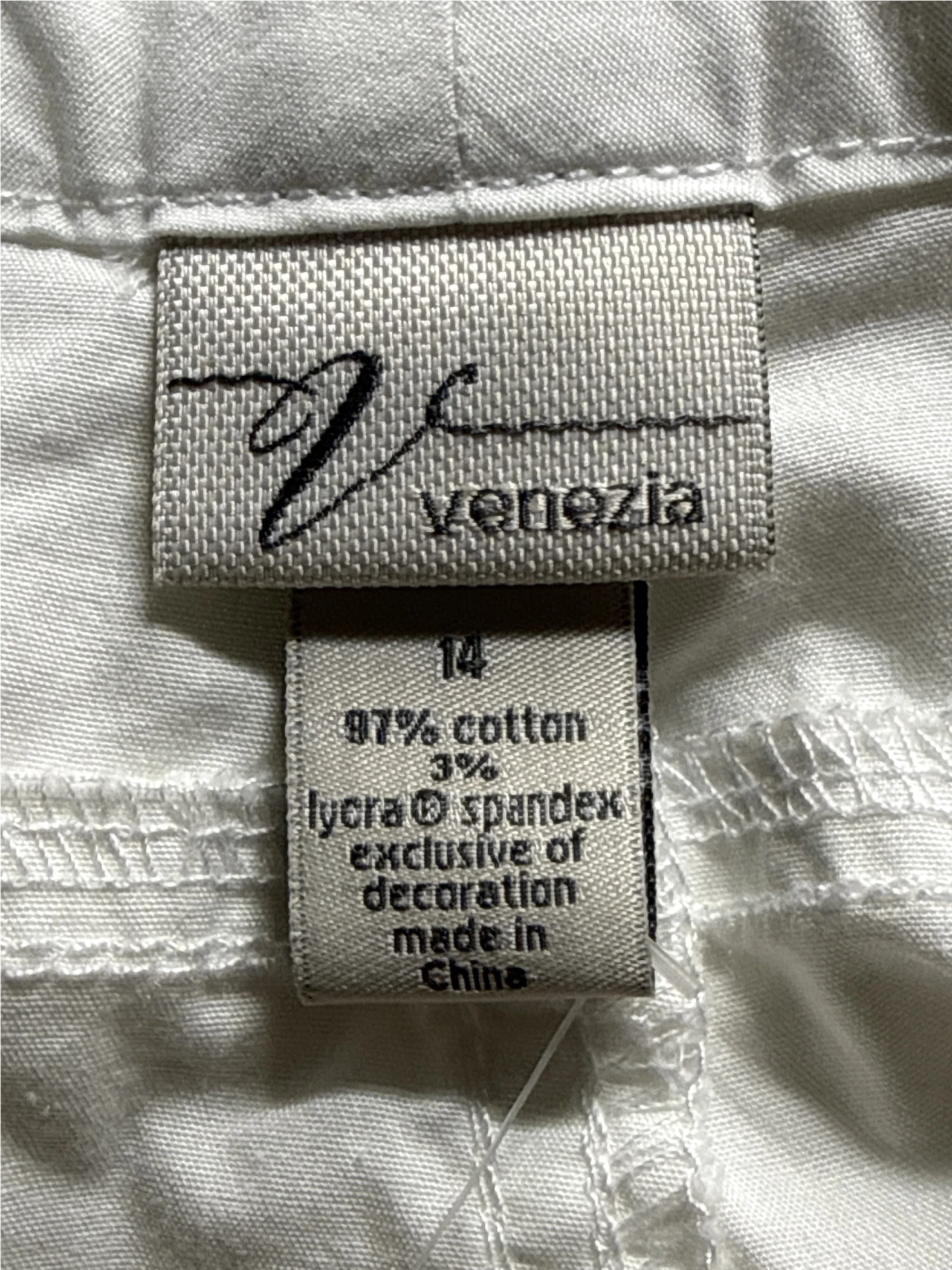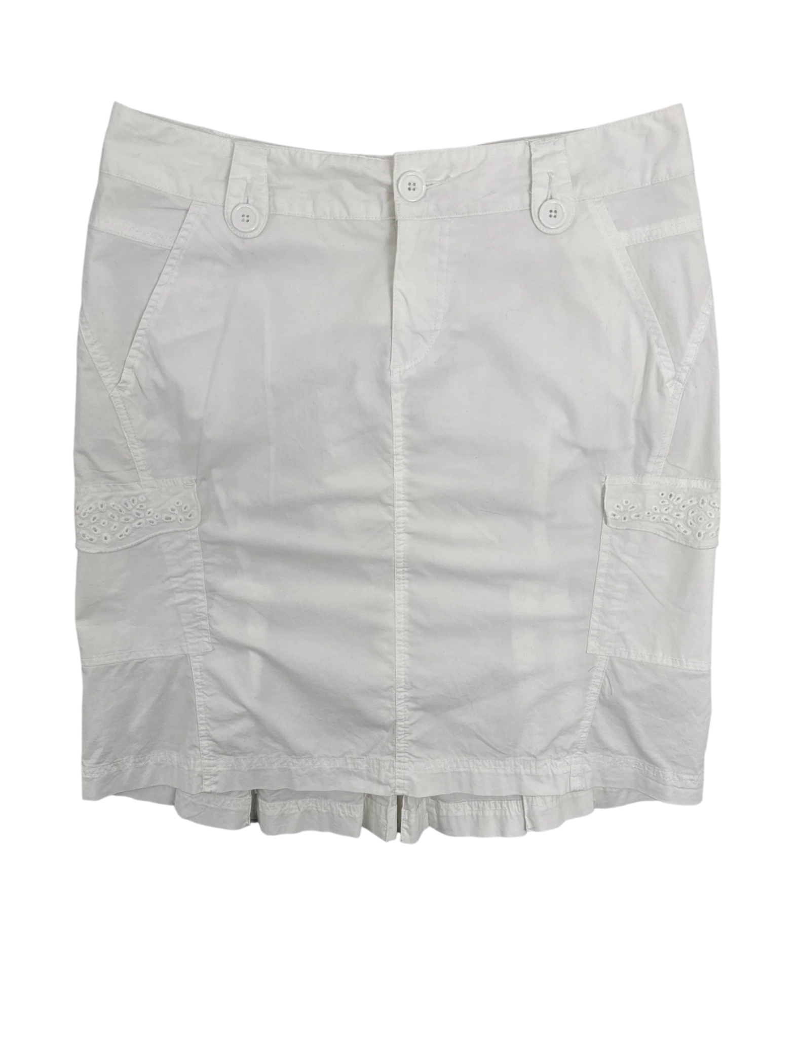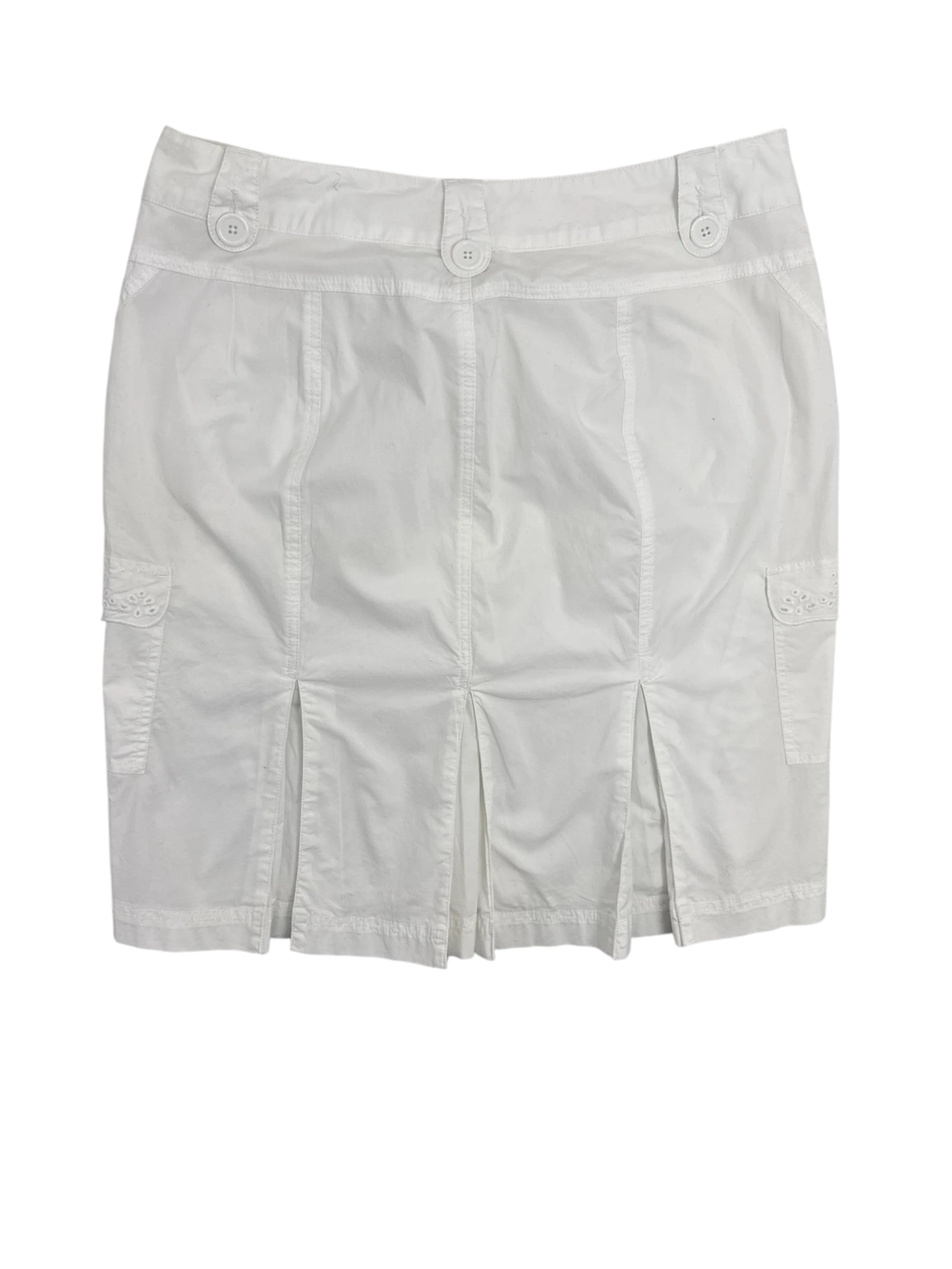 This pre-owned Venezia skirt is a versatile addition to any wardrobe. The skirt features a classic A-line silhouette in crisp white, making it perfect for warm weather. Made with a cotton and spandex blend, it offers both comfort and a flattering fit. It is perfect for a casual day out or can be dressed up for a night out. This mini skirt has a stylish cut, a touch of stretch and eye-catching details.
