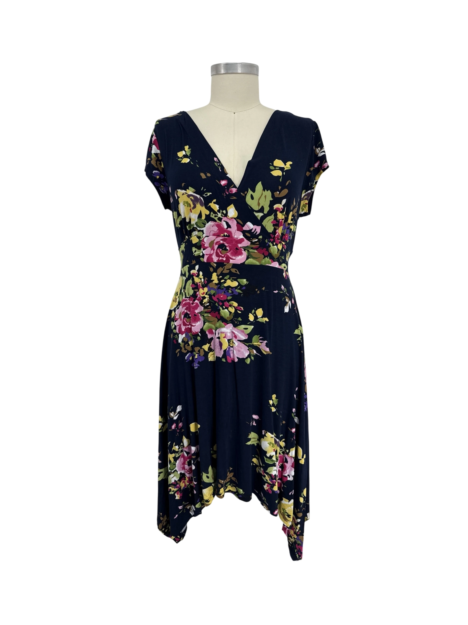 This pre-owned Venus x Lascana dress is a beautiful A-line midi dress perfect for spring and summer. Featuring a lovely floral print on a navy background with a flattering V-neck and short sleeves, it offers a comfortable and stylish fit. Crafted from a blend of viscose and elastane, it ensures both comfort and stretch. This dress is in excellent condition, making it an ideal addition to your wardrobe for everyday wear or a casual event. A great find for anyone seeking a unique, floral dress.