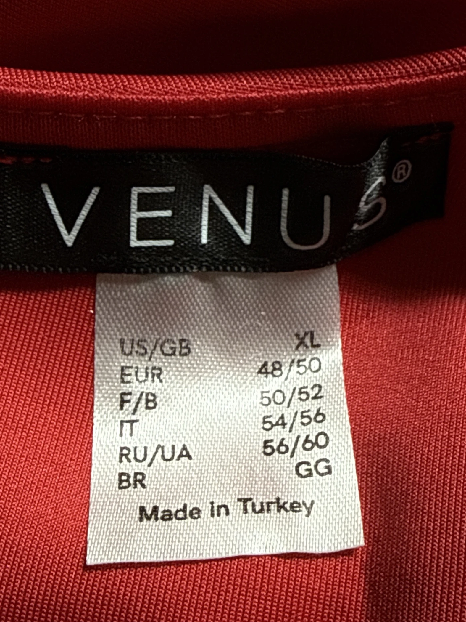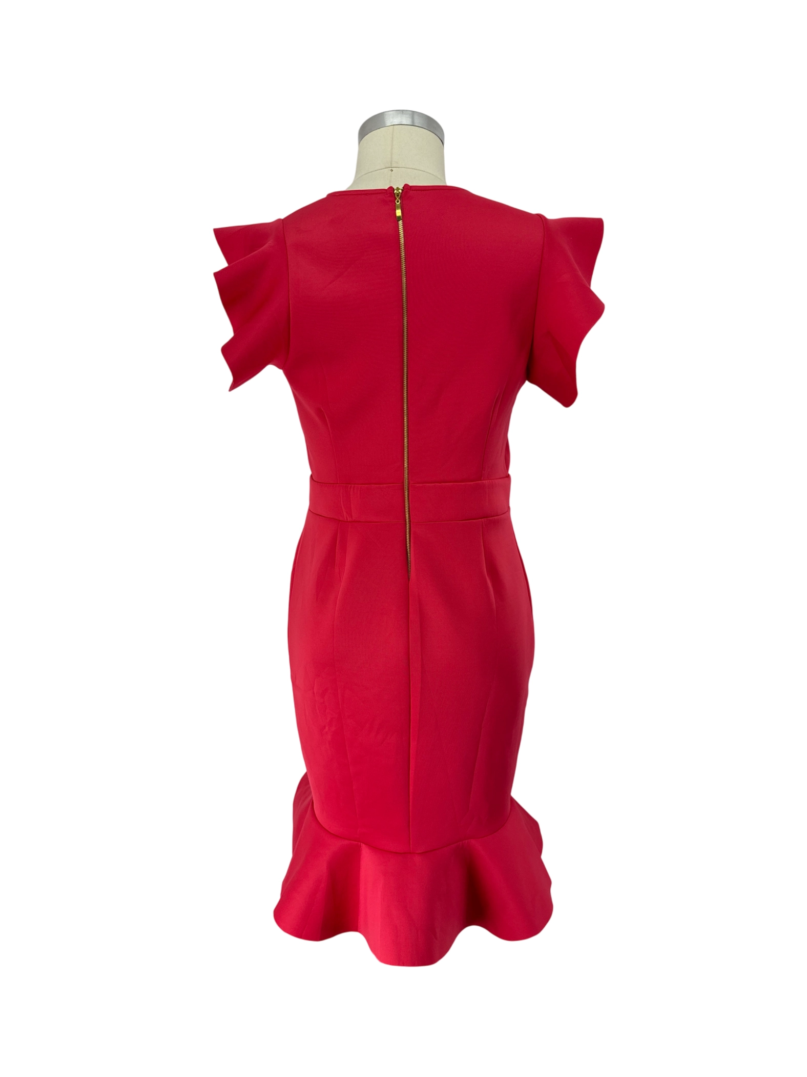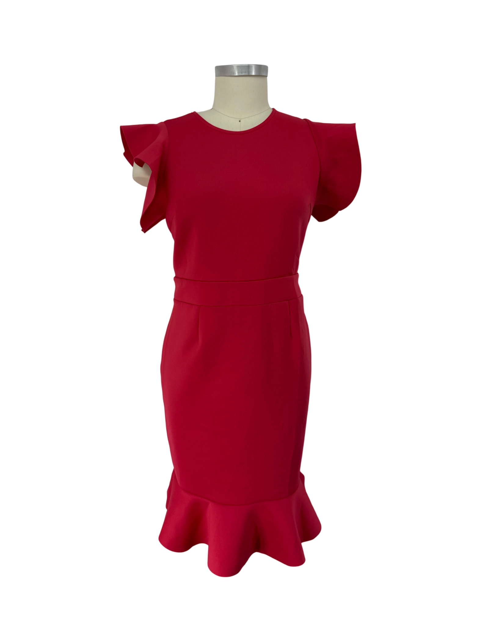This elegant VENUS dress is a stunning choice for any special occasion. This pre-owned sheath dress in a vibrant red hue features stylish short sleeves with ruffles and a flattering midi length. Crafted from a comfortable blend of polyester and spandex, it offers both style and comfort. The dress is perfect for parties and evenings out, offering a sophisticated look. Add this beautiful piece to your wardrobe and make a statement at your next event!