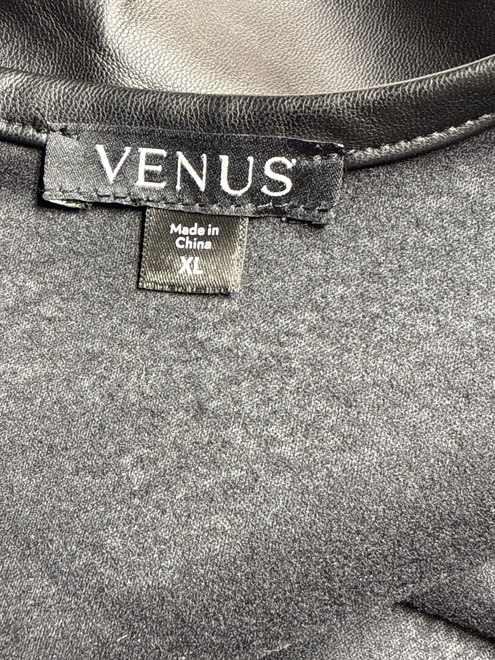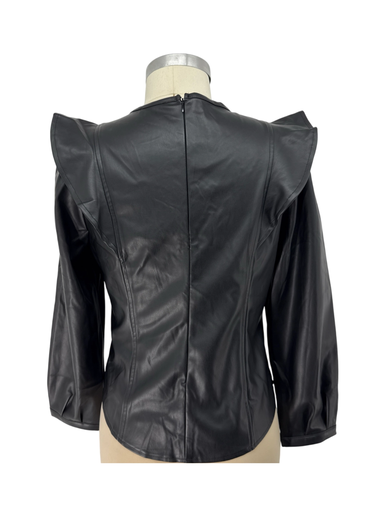 Elevate your outerwear collection with this pre-owned Venus faux leather jacket. This stylish top features a flattering V-neckline, eye-catching ruffle details, and a classic black color, making it a versatile addition to any wardrobe. Perfect for adding an edge to your look, this jacket is a must-have for a night out or a statement everyday outfit. Crafted from a soft and durable faux leather, this jacket offers both comfort and style.