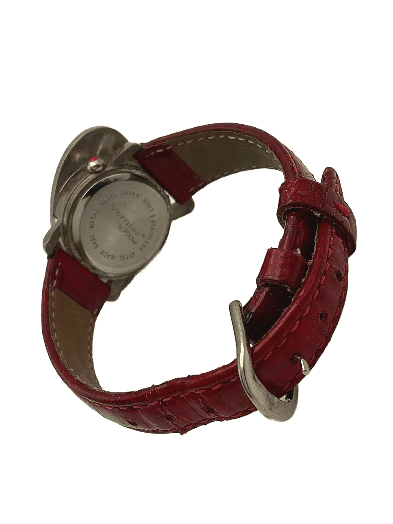 A burgundy women's watch with a stainless steel back and a matching hat.