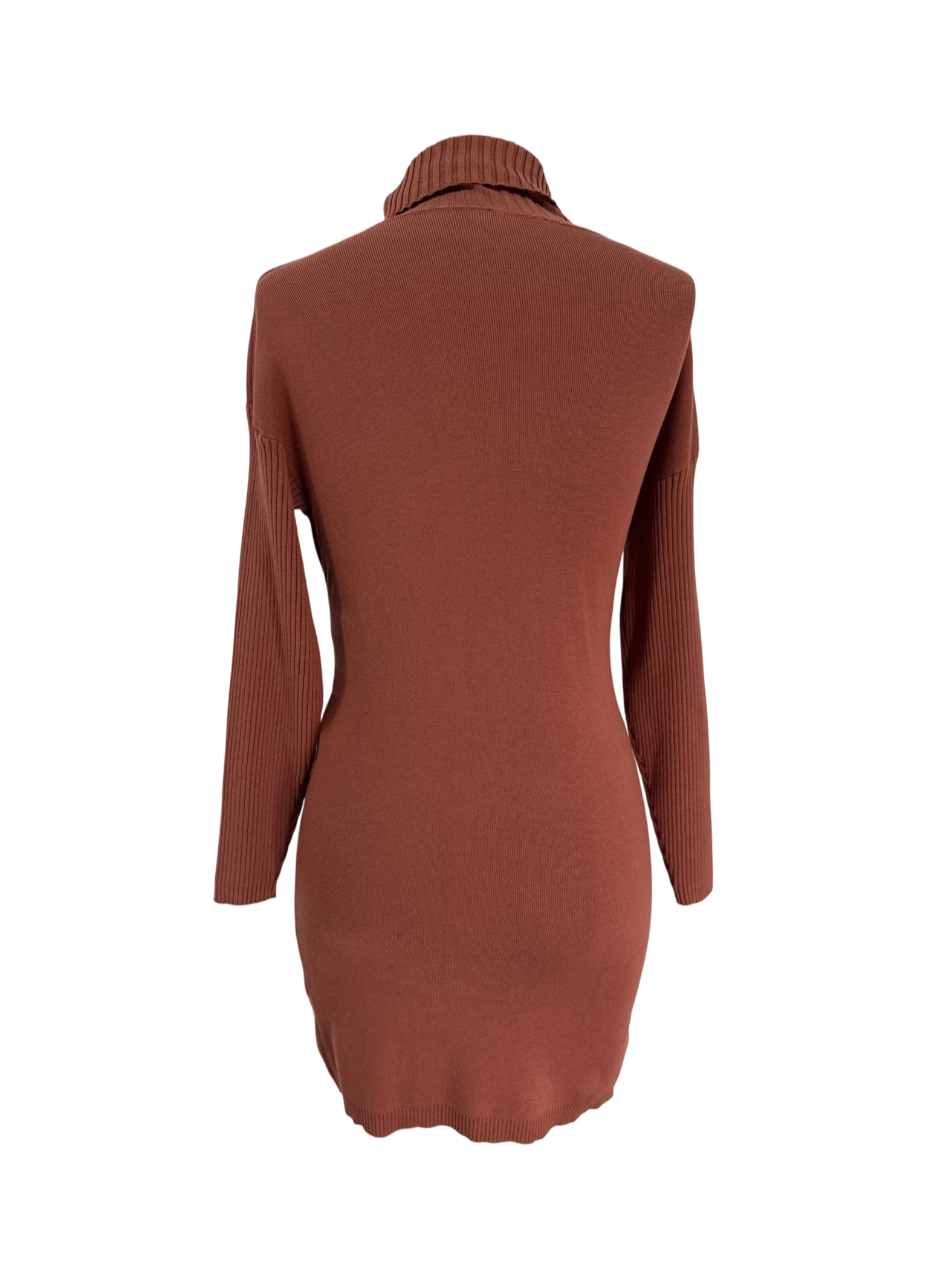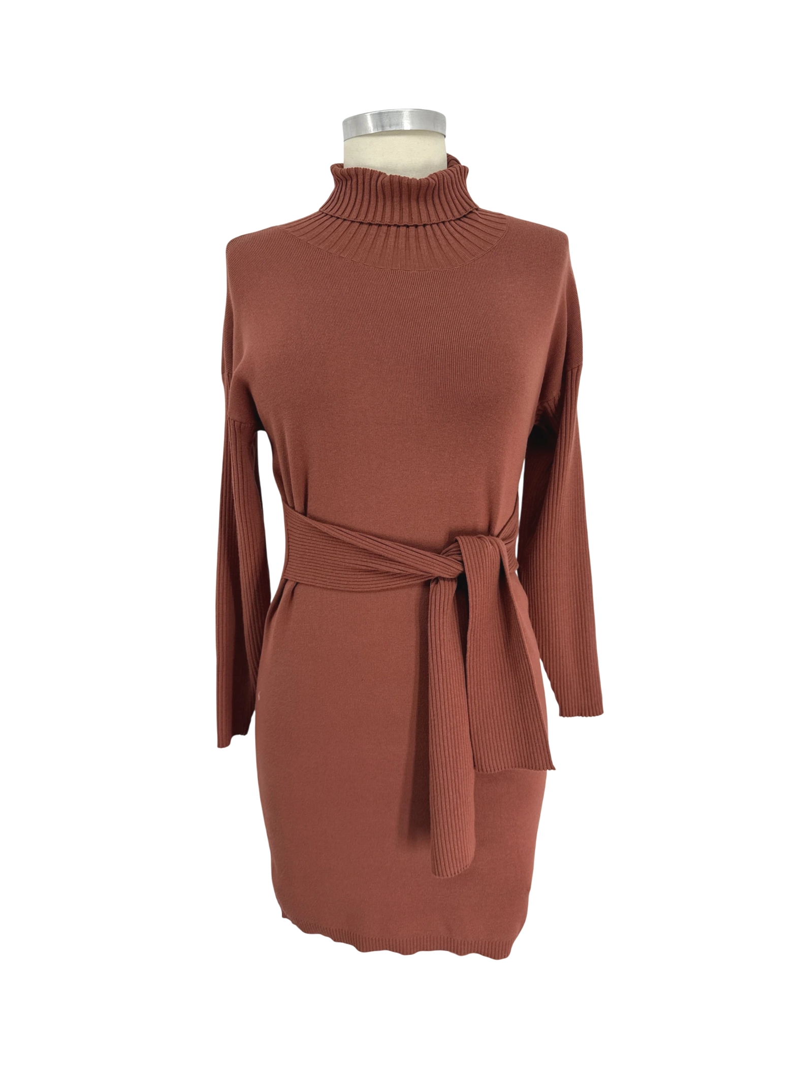 This pre-owned VICI dress is a stylish and comfortable choice for the colder months. Crafted from a blend of rayon, polyester, and nylon, this dress offers a soft and flattering silhouette. It features a classic turtleneck design, long sleeves, and a convenient tie belt to cinch the waist. Perfect for casual outings, this dress offers both warmth and sophistication, making it a must-have addition to your wardrobe.