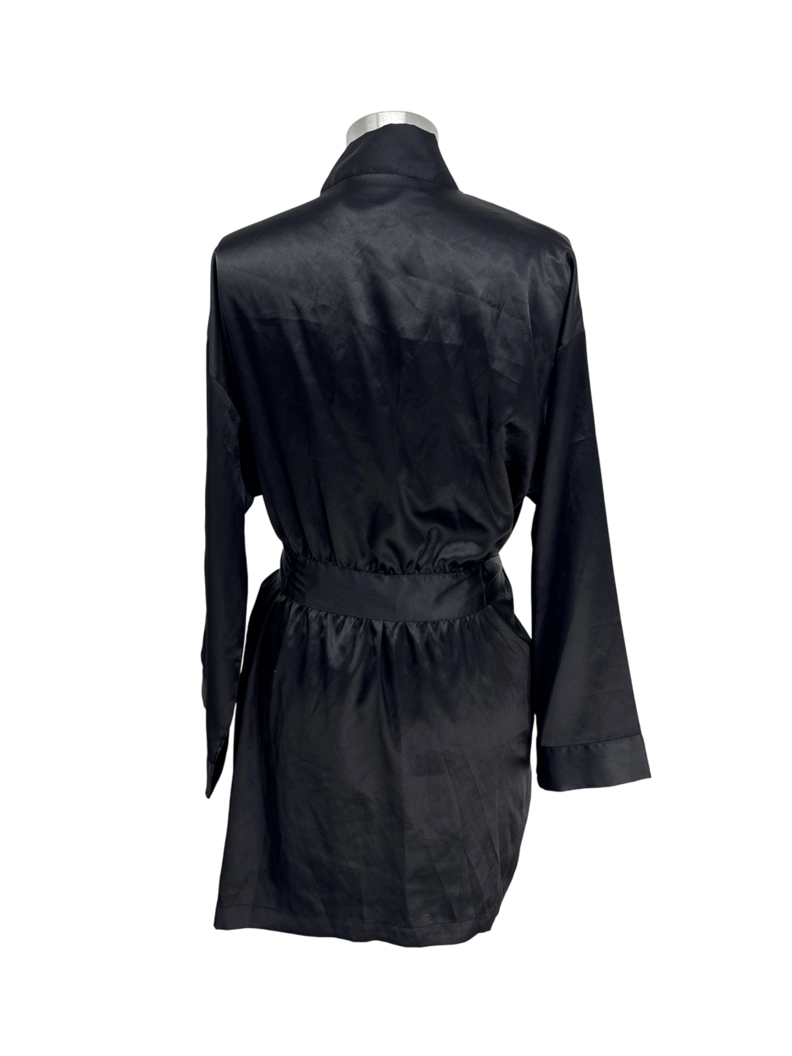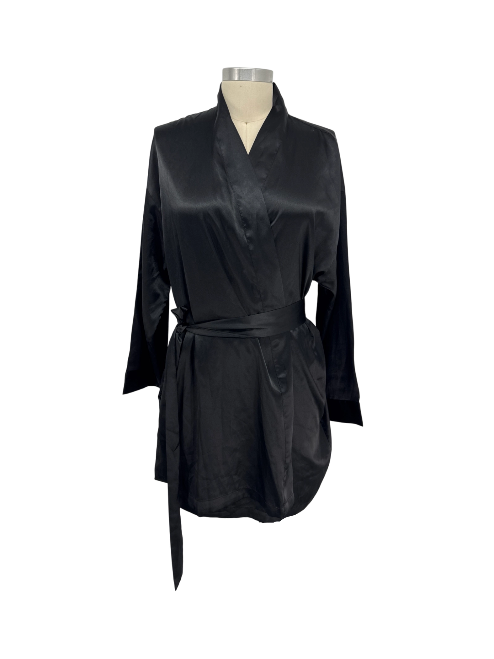 Indulge in luxurious comfort with this pre-owned VICTORIA'S SECRET robe. Crafted from smooth, silky polyester, it drapes beautifully and feels soft against the skin. The classic wrap design with a tie closure offers a flattering fit. Perfect for lounging, this robe adds a touch of elegance to your everyday routine. Available in black. This versatile piece is perfect for any season, whether you're snuggling up on a cold night or slipping it on after a relaxing shower.