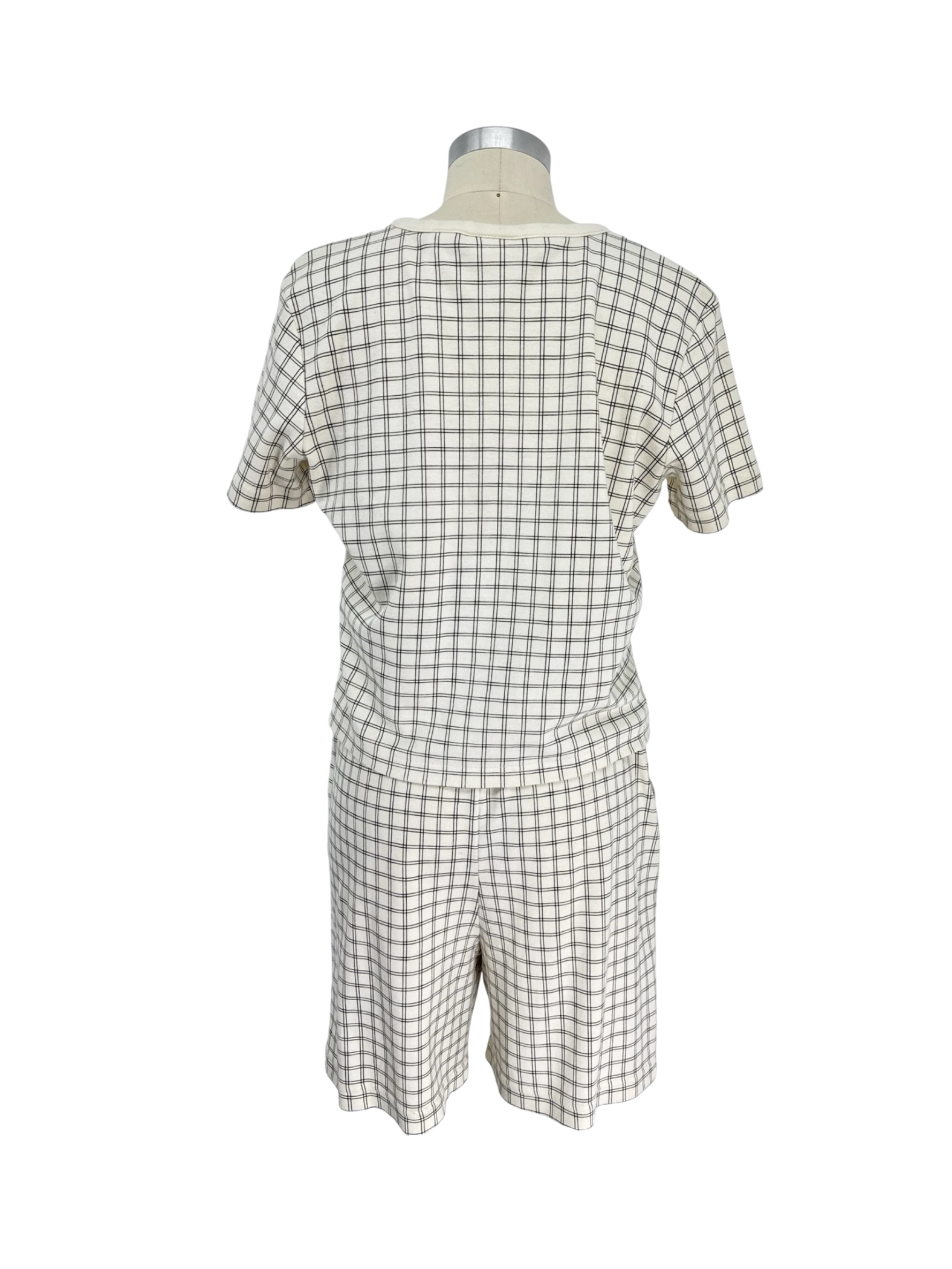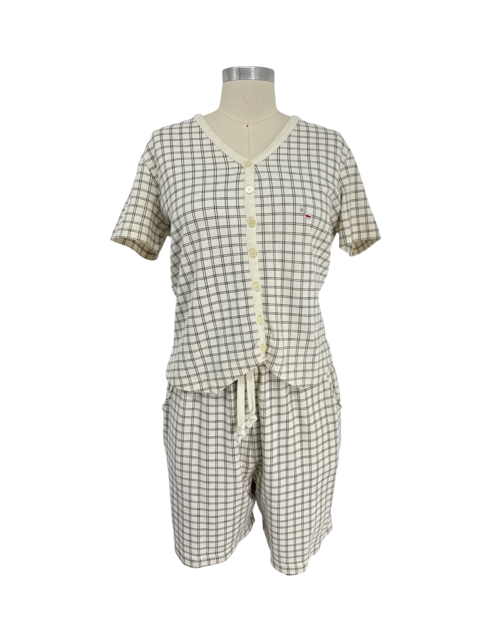 Stain washable refer to photo. - Cozy up in this pre-owned Villager Sport pajama set! This set includes a short-sleeved shirt and shorts, both adorned with a classic checkered pattern. Made from 100% cotton, it promises ultimate comfort for those relaxing nights. Perfect for spring, summer, and fall, this set offers a timeless style. Whether you're lounging at home or getting a good night's sleep, these pajamas provide both comfort and charm. Embrace the vintage feel with this delightful addition to your sleepwear collection.