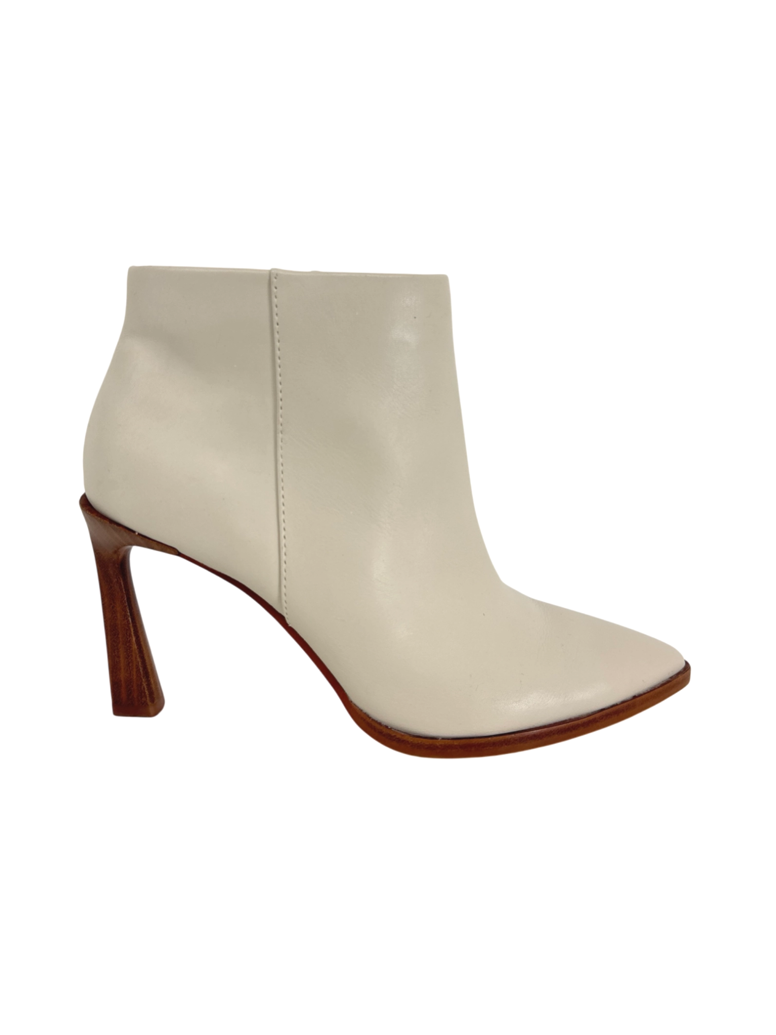 Step out in style with these pre-owned Vince Camuto ankle boots. Crafted from ivory-colored leather, these boots feature a stylish heel, offering a sophisticated look suitable for Fall and Winter. Perfect for elevating any outfit, from casual jeans to a dressy skirt. These boots combine both comfort and chic design. The unique heel adds a touch of modern elegance. These Vince Camuto ankle boots are a must-have for any fashion-forward woman.