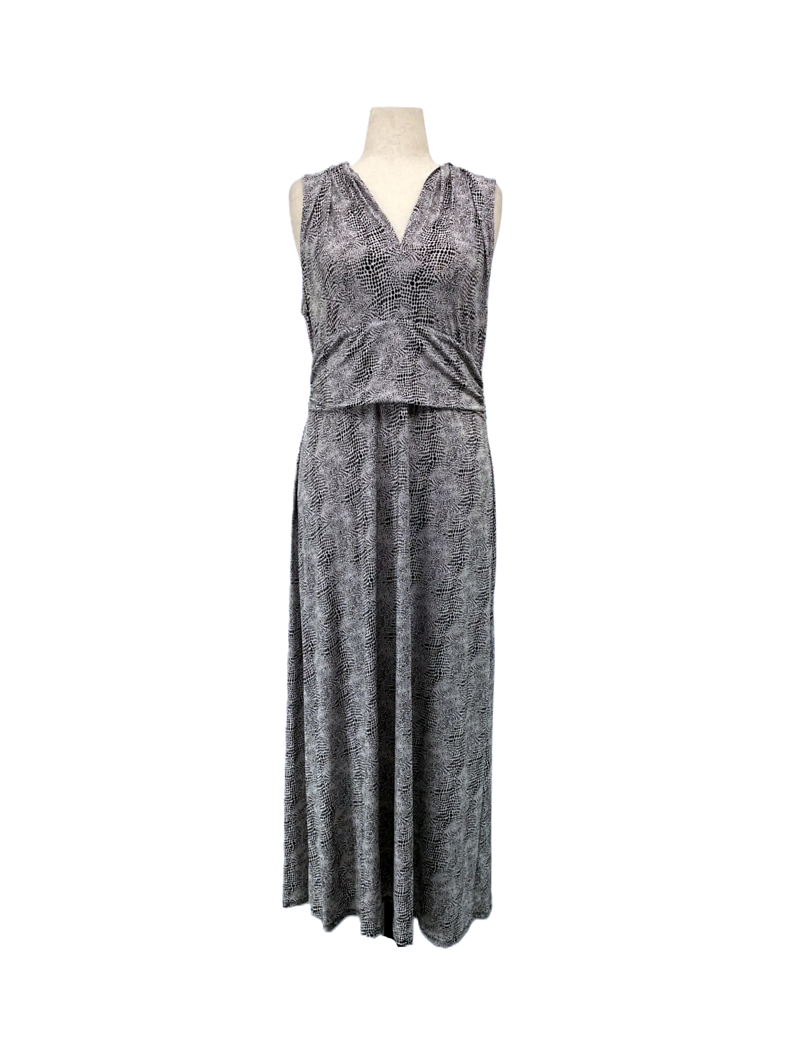 Elevate your wardrobe with this stylish pre-owned Vince Camuto maxi dress. Featuring a chic black and white dot pattern, this sleeveless dress is perfect for warm weather. Crafted from a blend of polyester and spandex, it offers a comfortable and flattering fit. Its A-line silhouette and V-neck design enhance its timeless appeal. Ideal for casual outings or a summer soiree. A must-have for the fashion-forward woman.