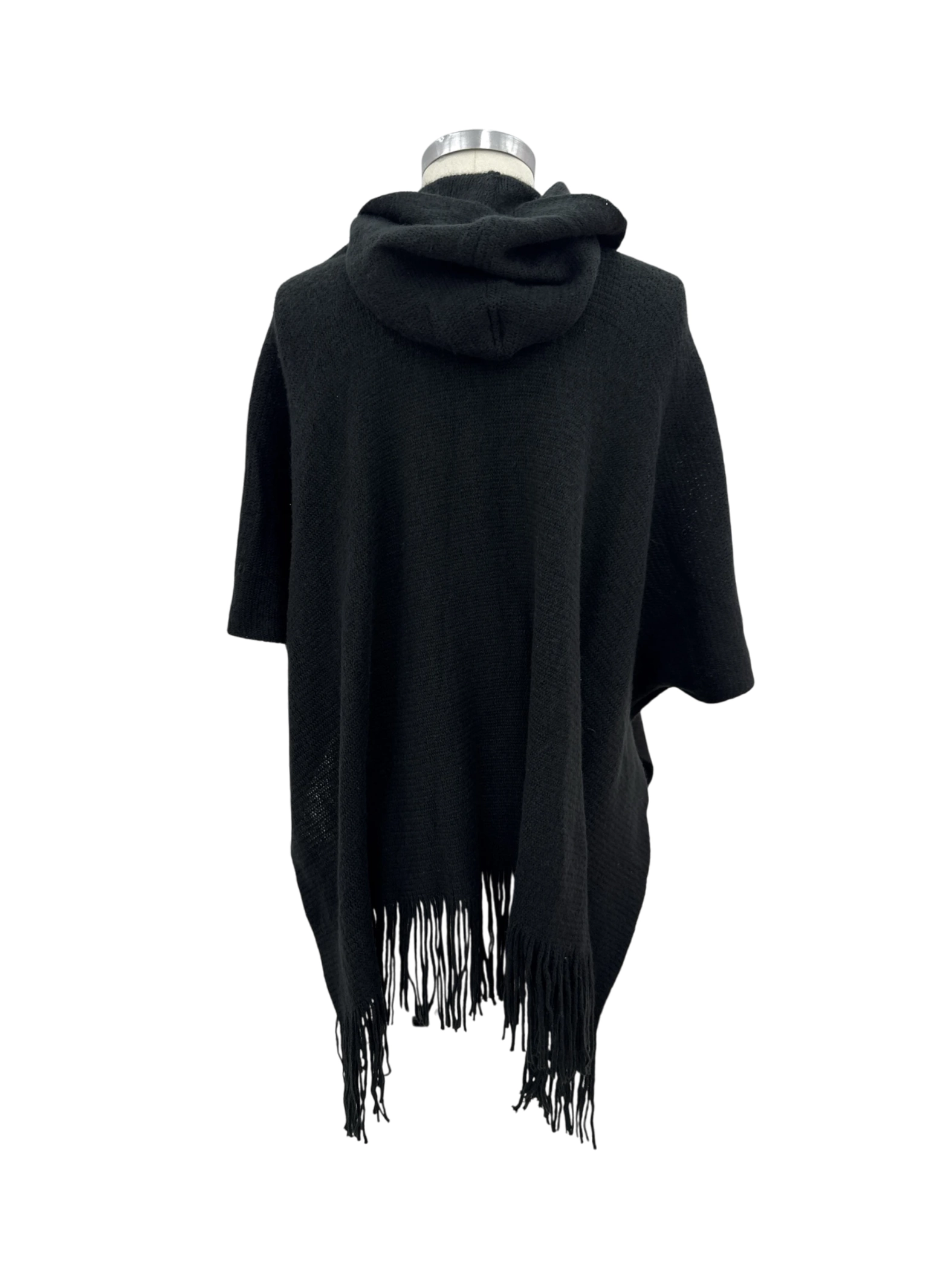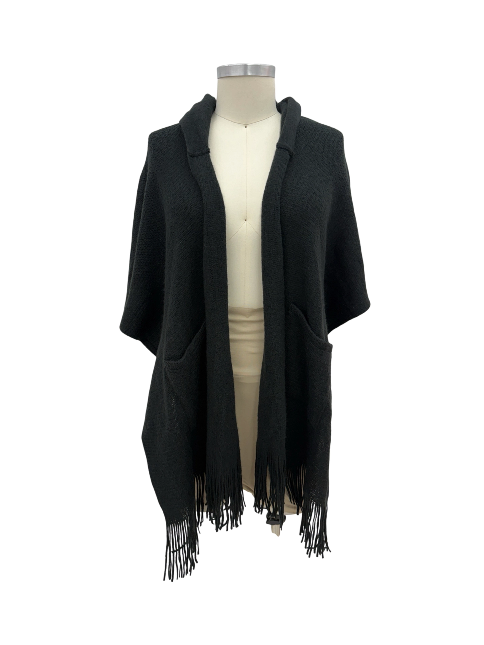 Elevate your outerwear collection with this Vince Camuto black hooded cardigan, a chic and versatile piece perfect for layering. This gently used cardigan features a cozy hood, open front, and fringe detailing, offering both style and warmth. Crafted from a soft acrylic blend, it is designed for comfort and durability. This cardigan is a perfect addition to any wardrobe, ideal for a casual day out or layering over a dress for a more polished look.