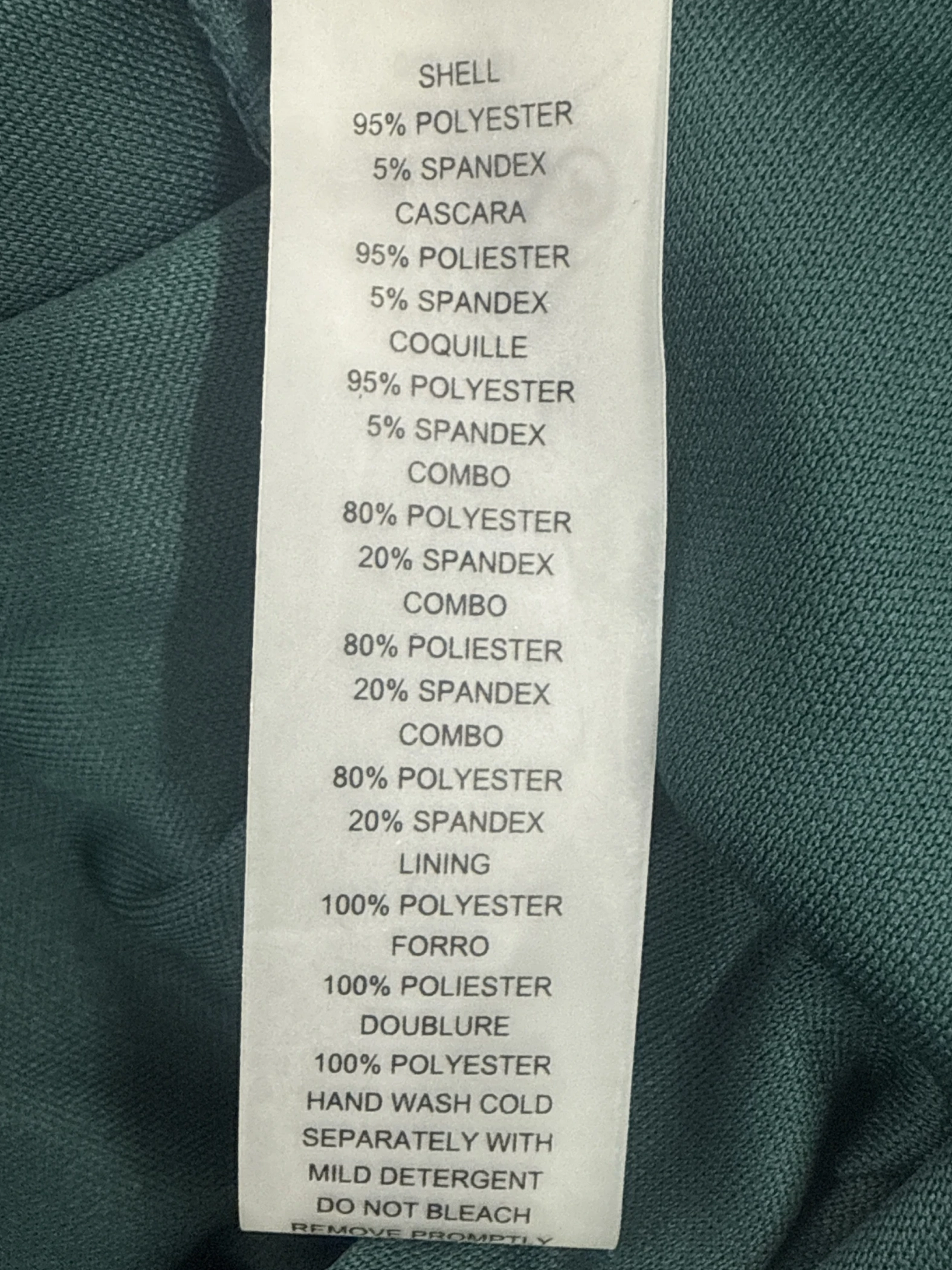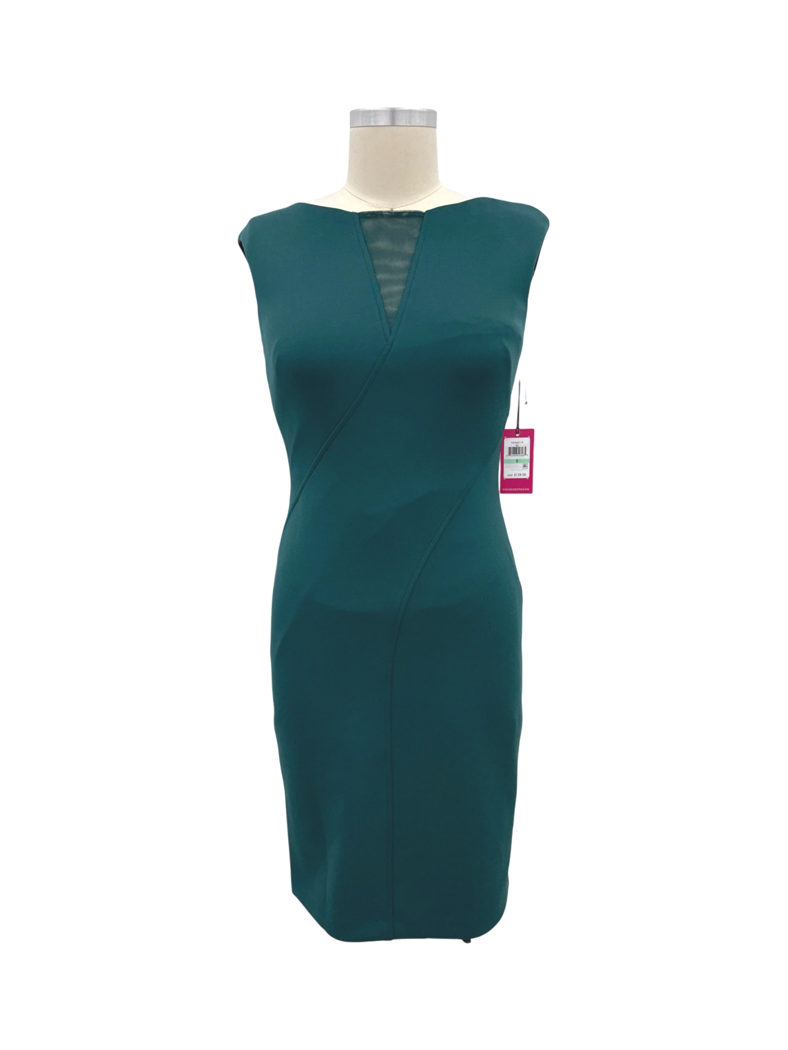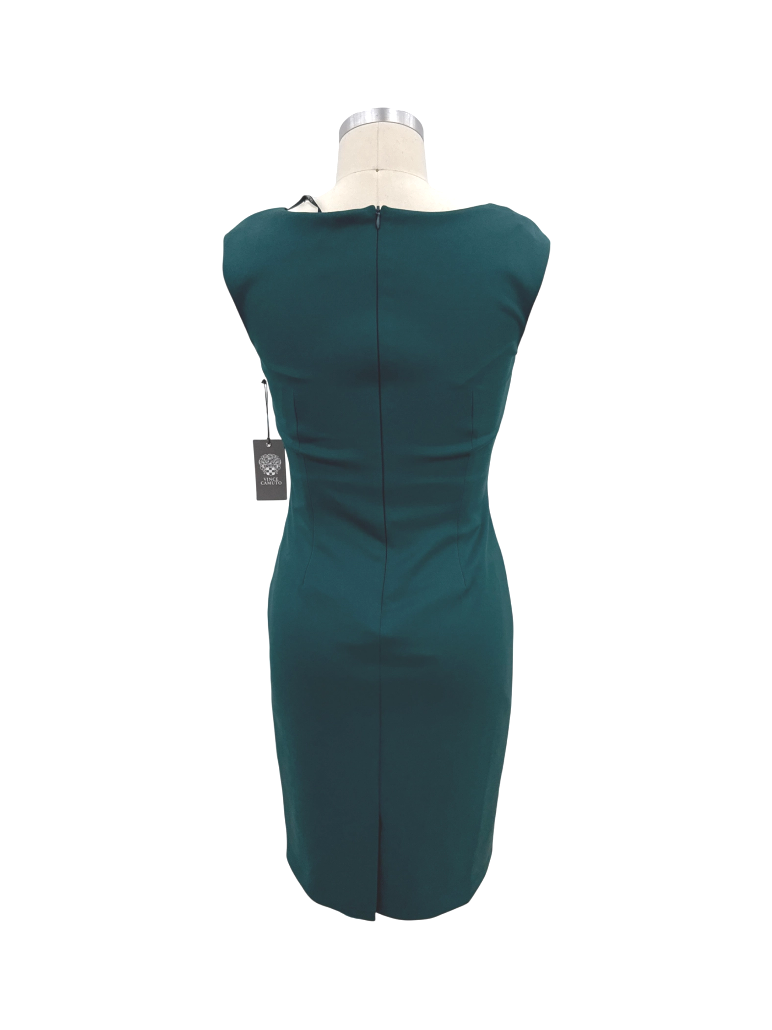 This stunning Vince Camuto dress is perfect for any cocktail party or special occasion. Crafted from a comfortable blend of polyester and spandex, this sheath dress features a flattering silhouette and a stylish round neckline. The dress showcases a beautiful green hue. This pre-owned dress is in excellent condition and ready to elevate your wardrobe.