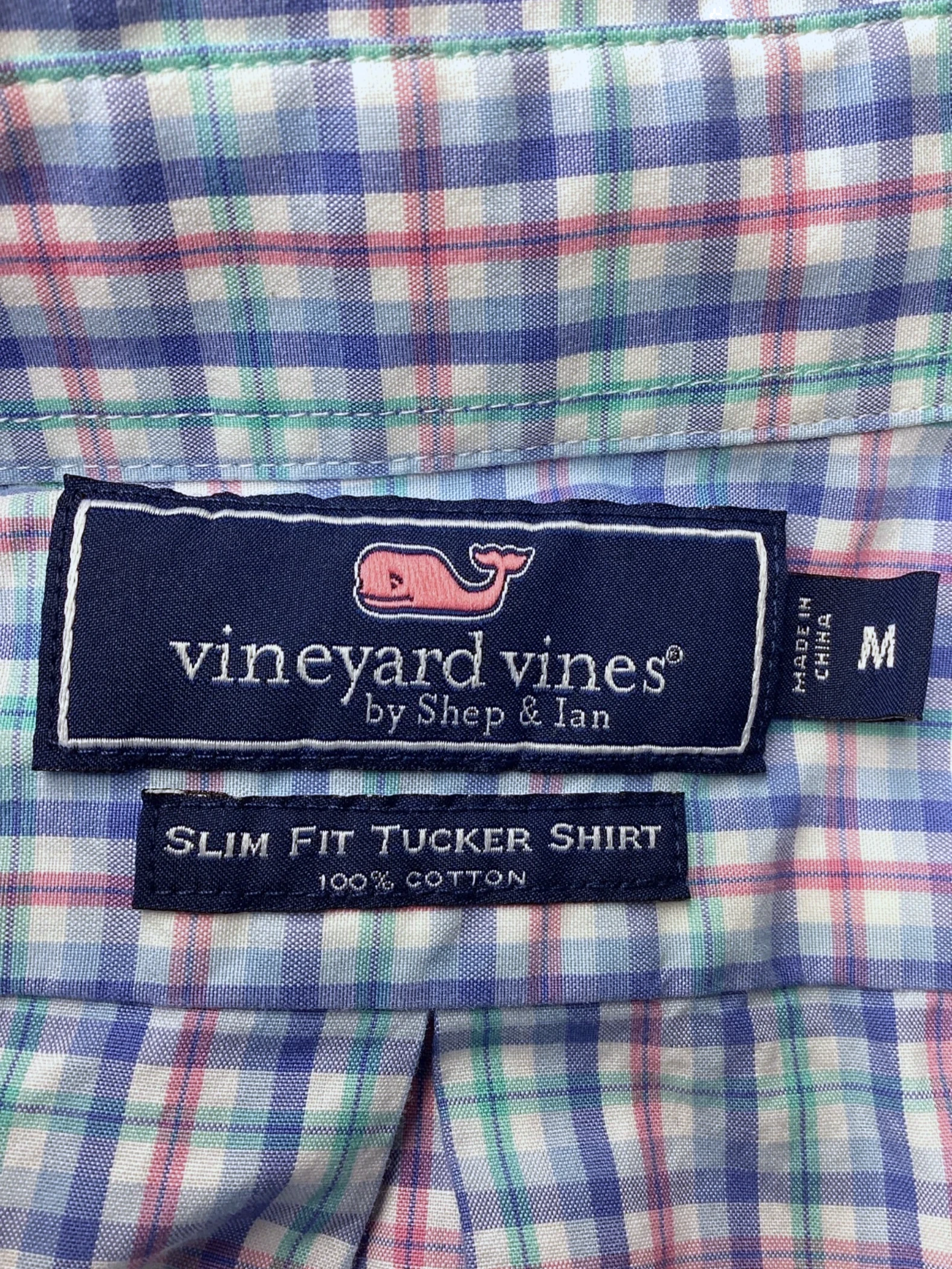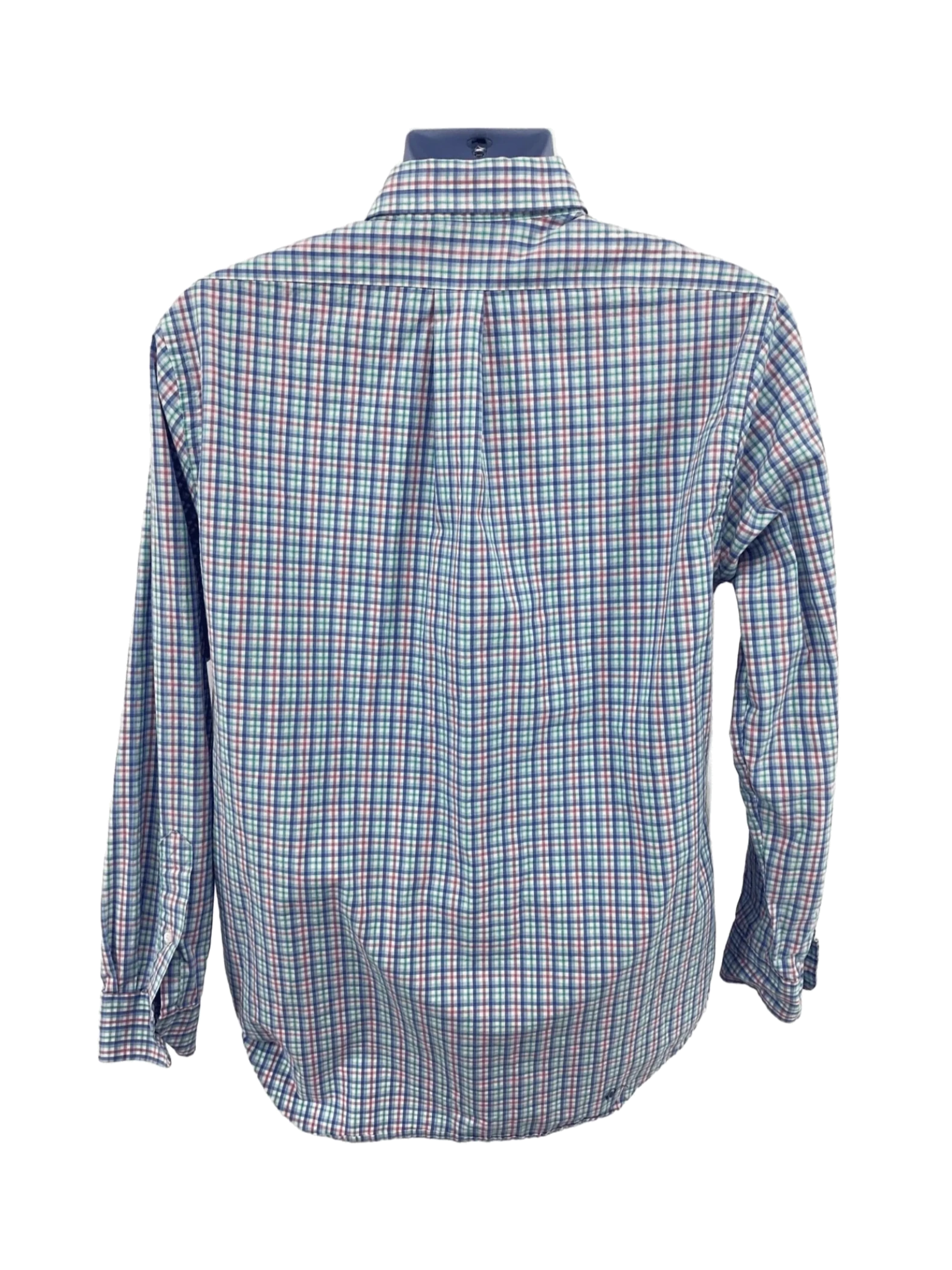 This is a Vineyard Vines men's slim fit long sleeve button-down shirt in blue, pink, and green plaid.