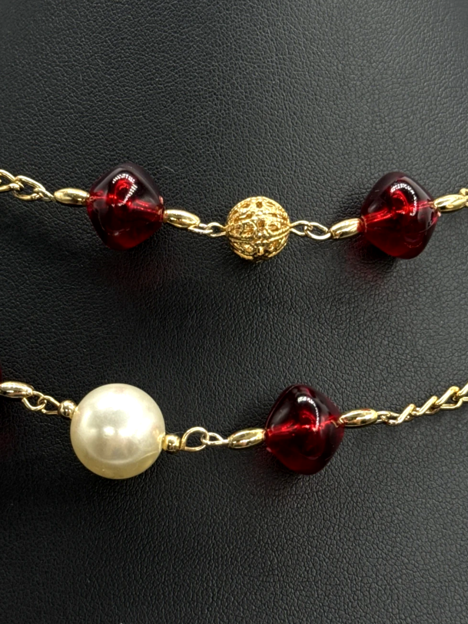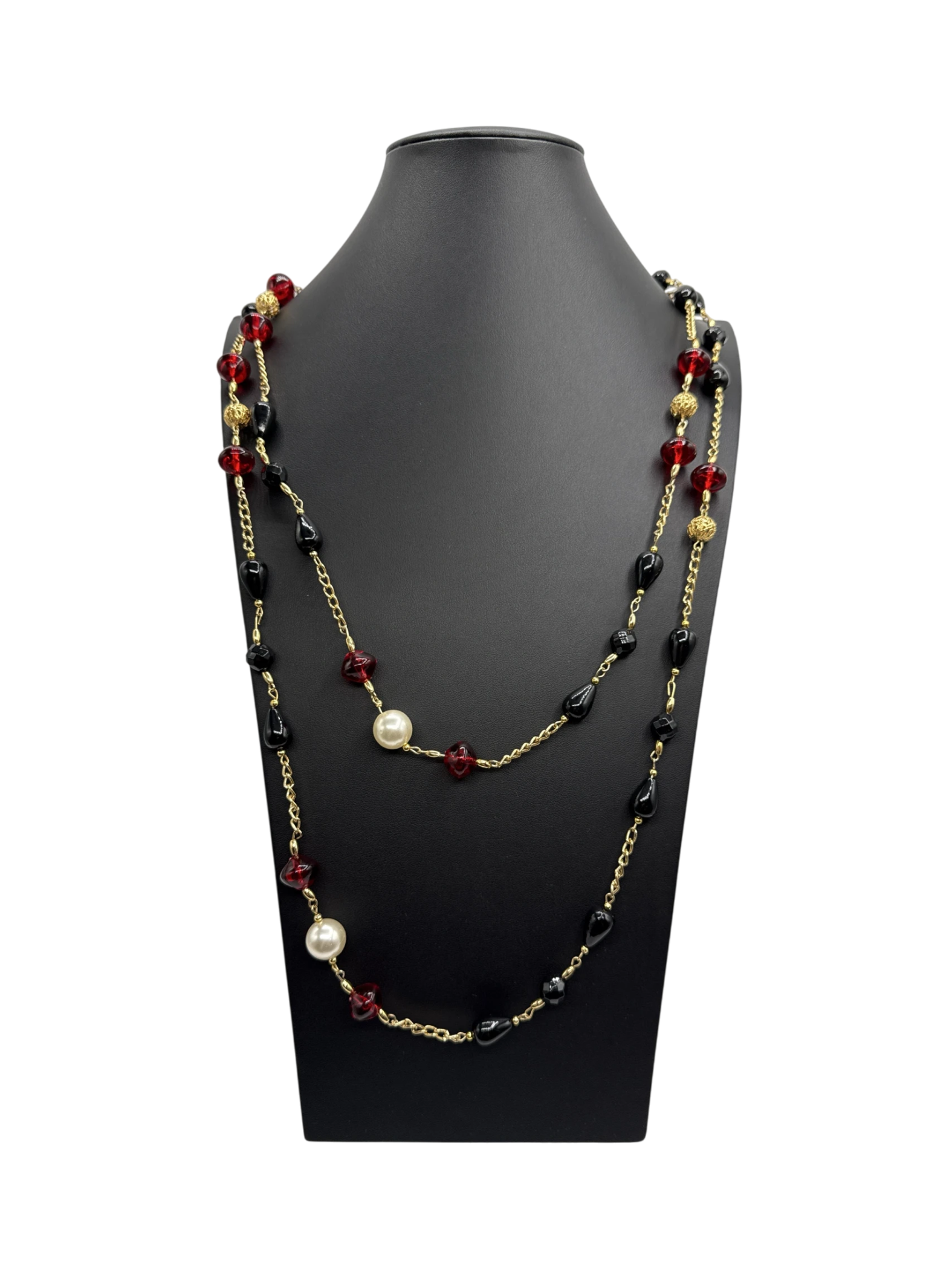 This is a vintage-style faux black and red beaded necklace with a gold-tone finish, measuring 37 inches in length, and another measuring 31 inches.