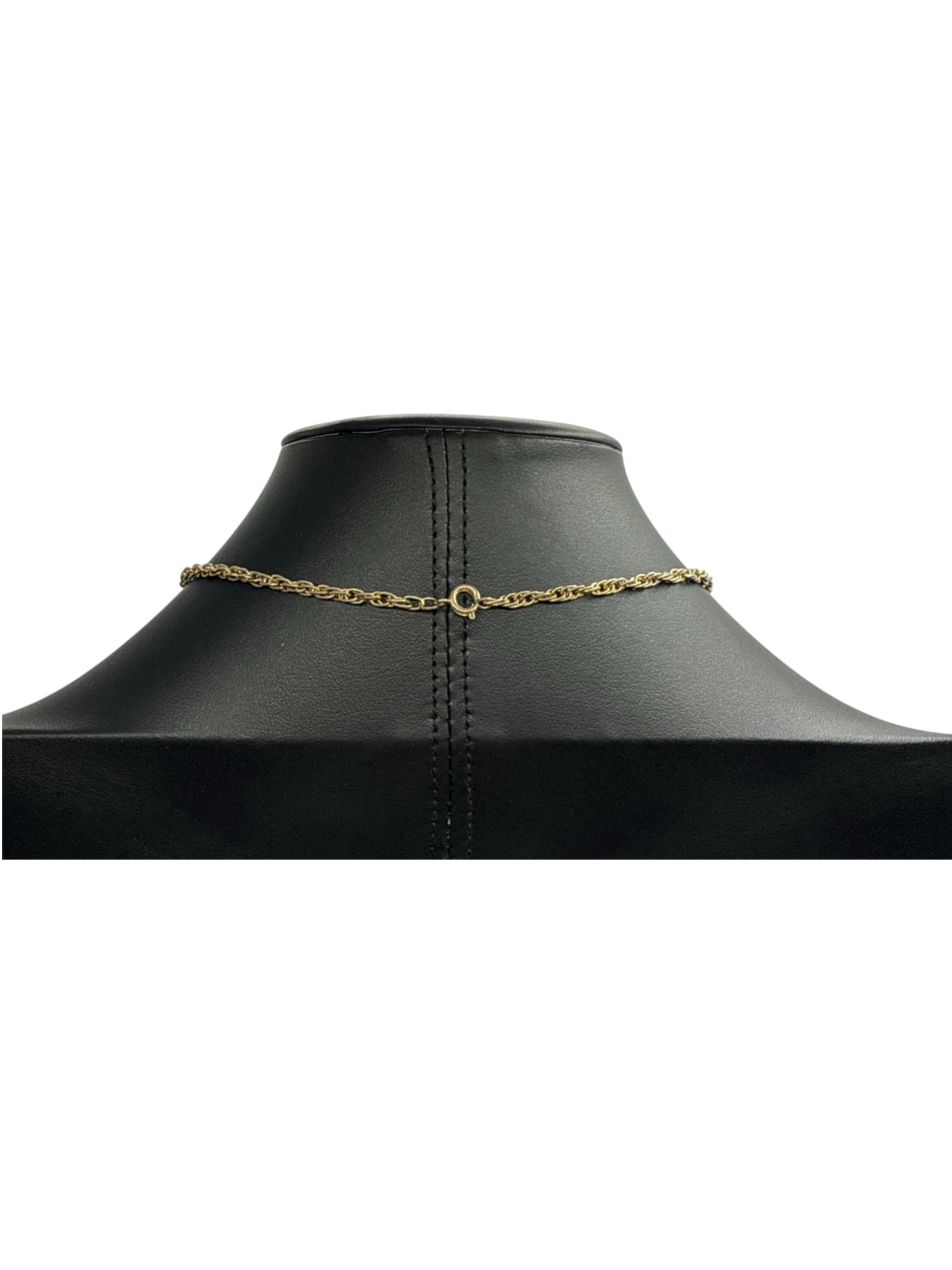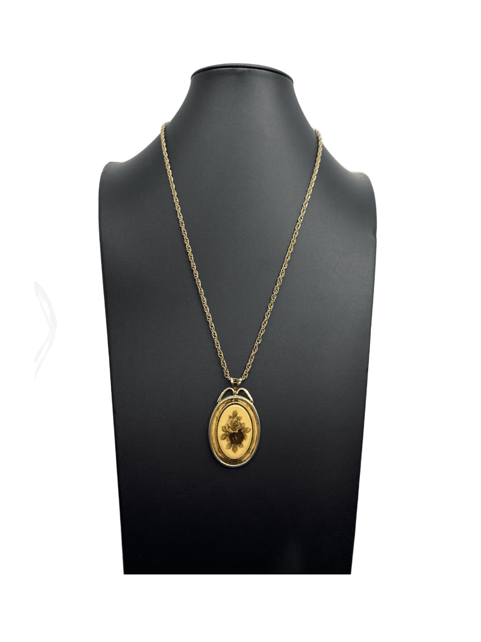 This vintage necklace has a gold-tone chain and a cameo pendant with a delicate rose design. The pendant features a classic cameo style with a raised image.