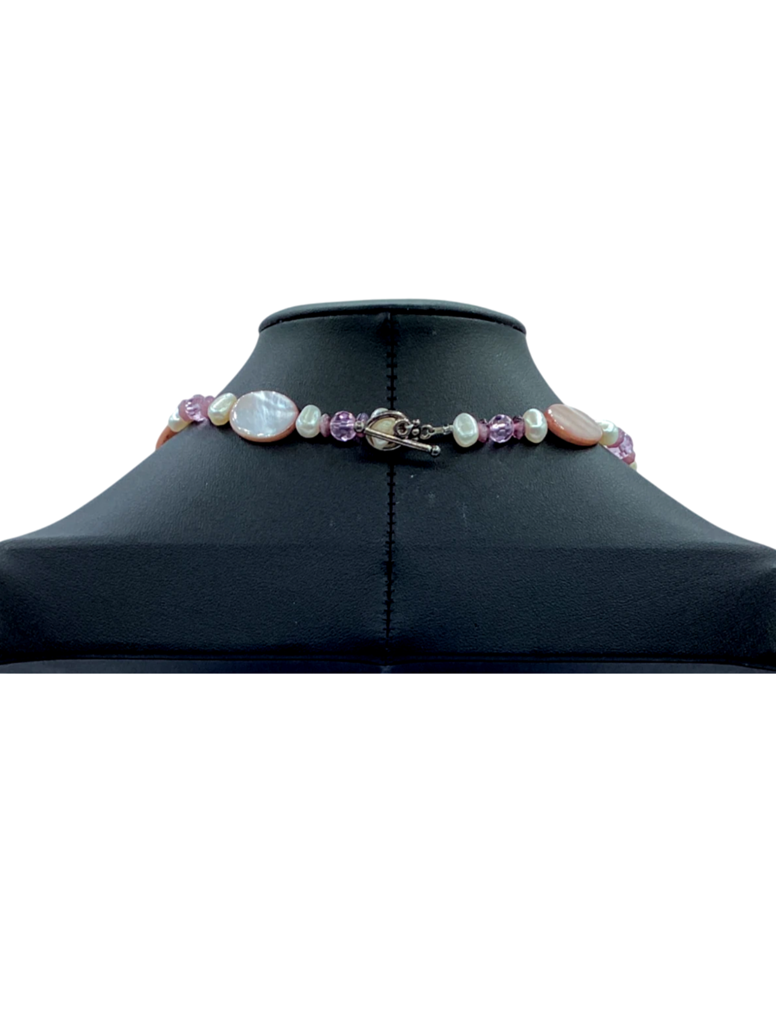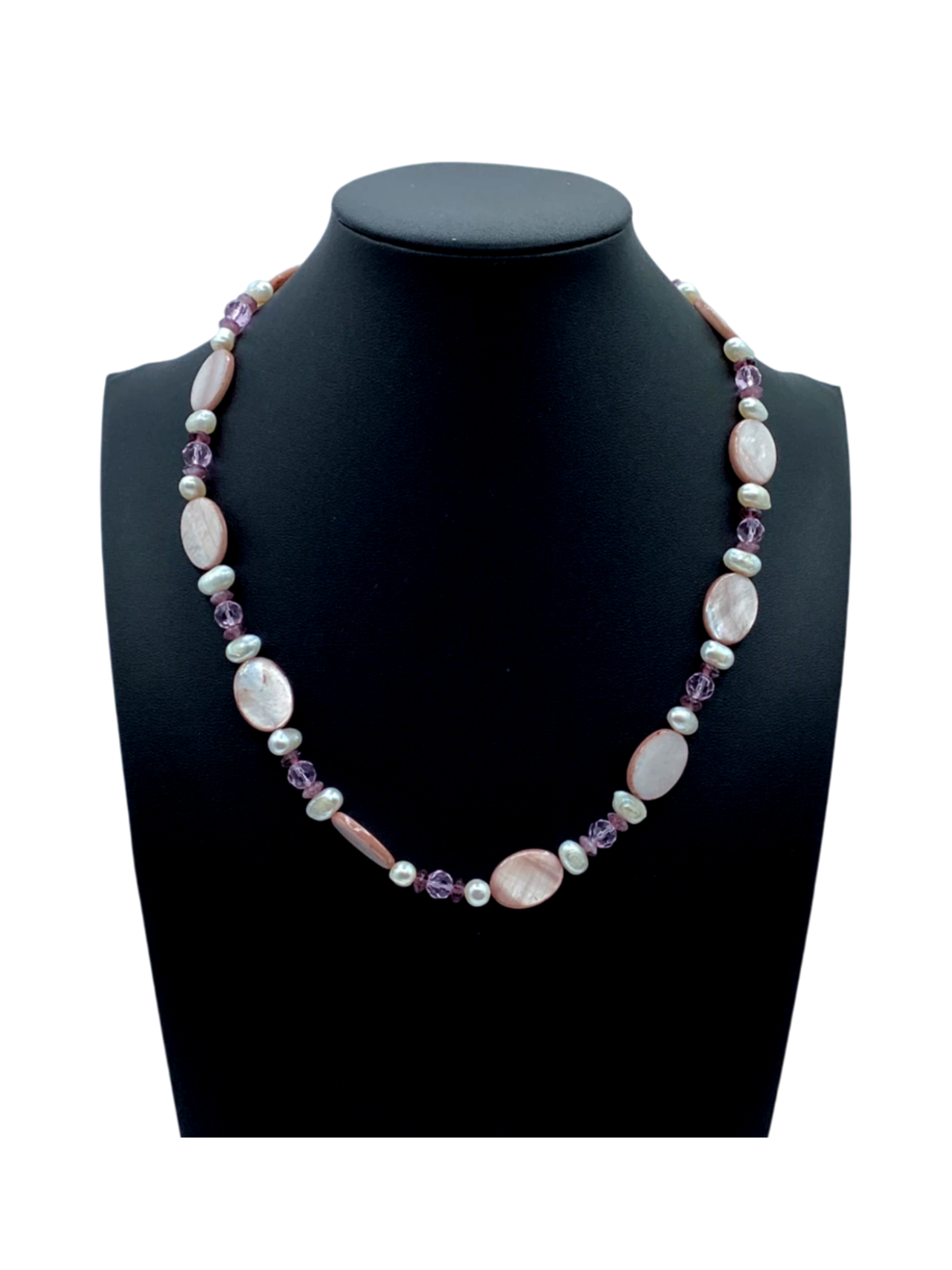 This is a 20-inch necklace made of vintage pink and silver beads with a round box clasp.