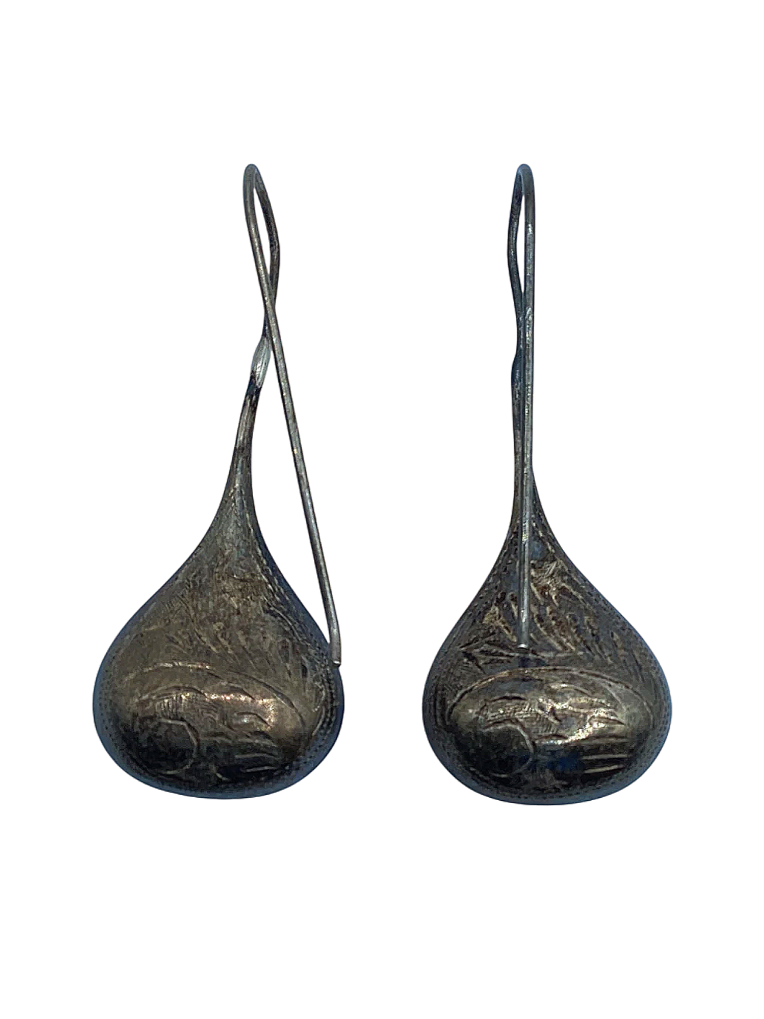The earrings have a delicate teardrop shape with intricate etched patterns on their surface. They are made of sterling silver, indicating a high level of purity and quality. The design and style of the earrings give them a classic and timeless look, making them suitable for various occasions.