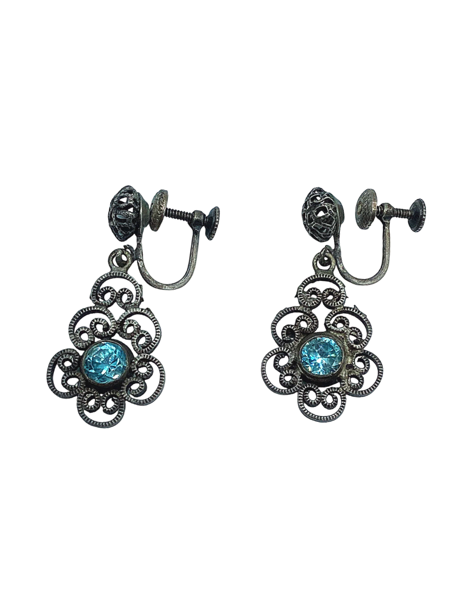 These vintage-style earrings have detailed metalwork with a floral design around a blue stone. They are equipped with a screw-back closure.