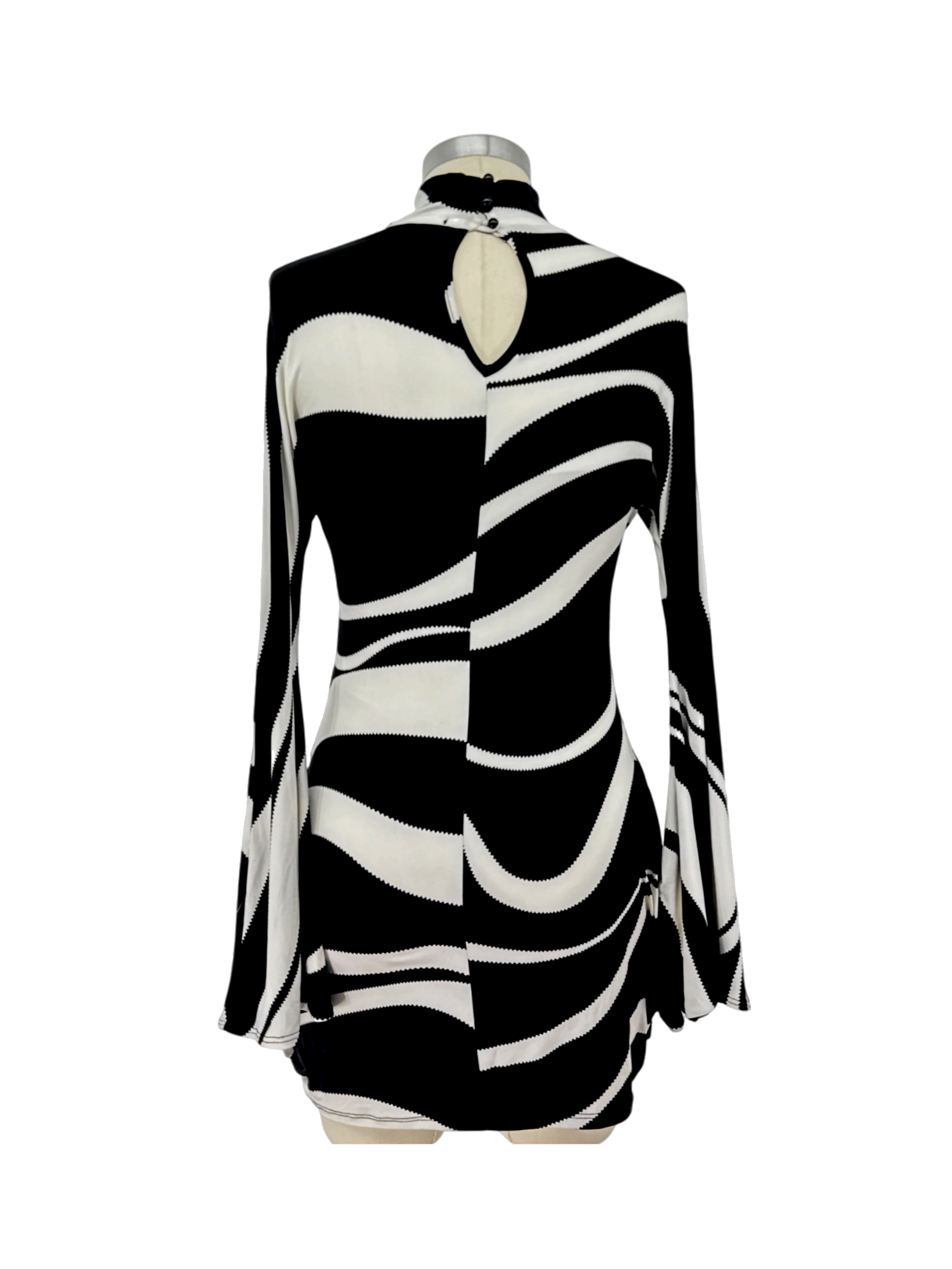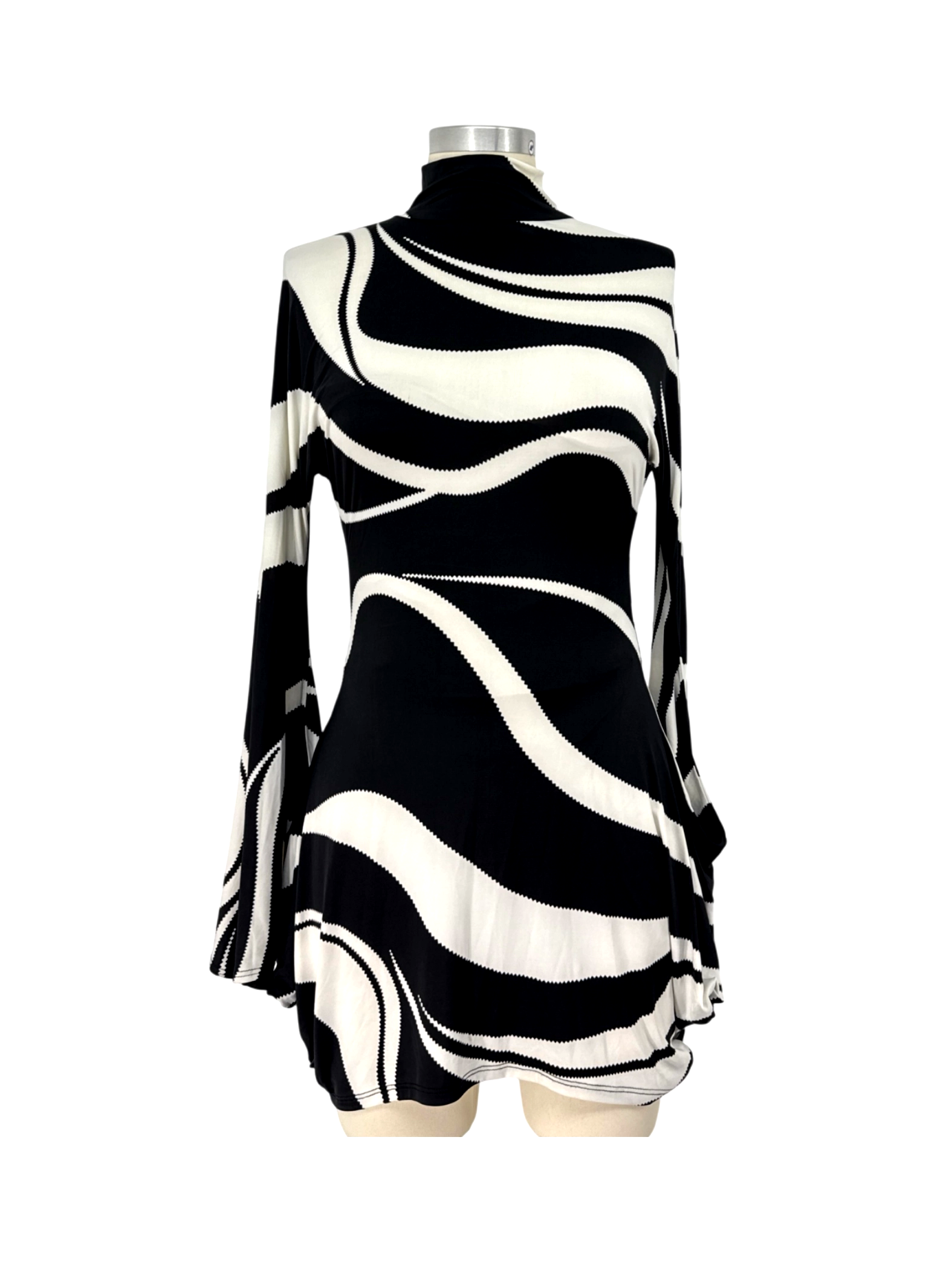 This chic WEEKEND tunic top is a statement piece perfect for fall and winter. Featuring a unique black and white stripe pattern, a flattering mock neck, and long sleeves, this tunic offers both style and comfort. The fabric appears to be a blend of polyester and spandex, ensuring a comfortable fit. Ideal for layering, this pre-owned top adds a touch of modern flair to any wardrobe.