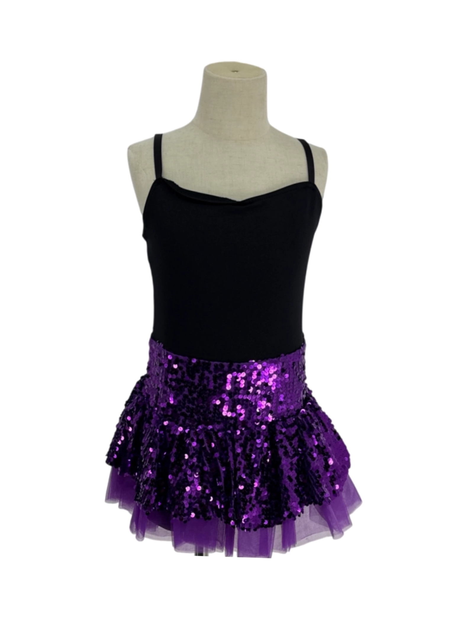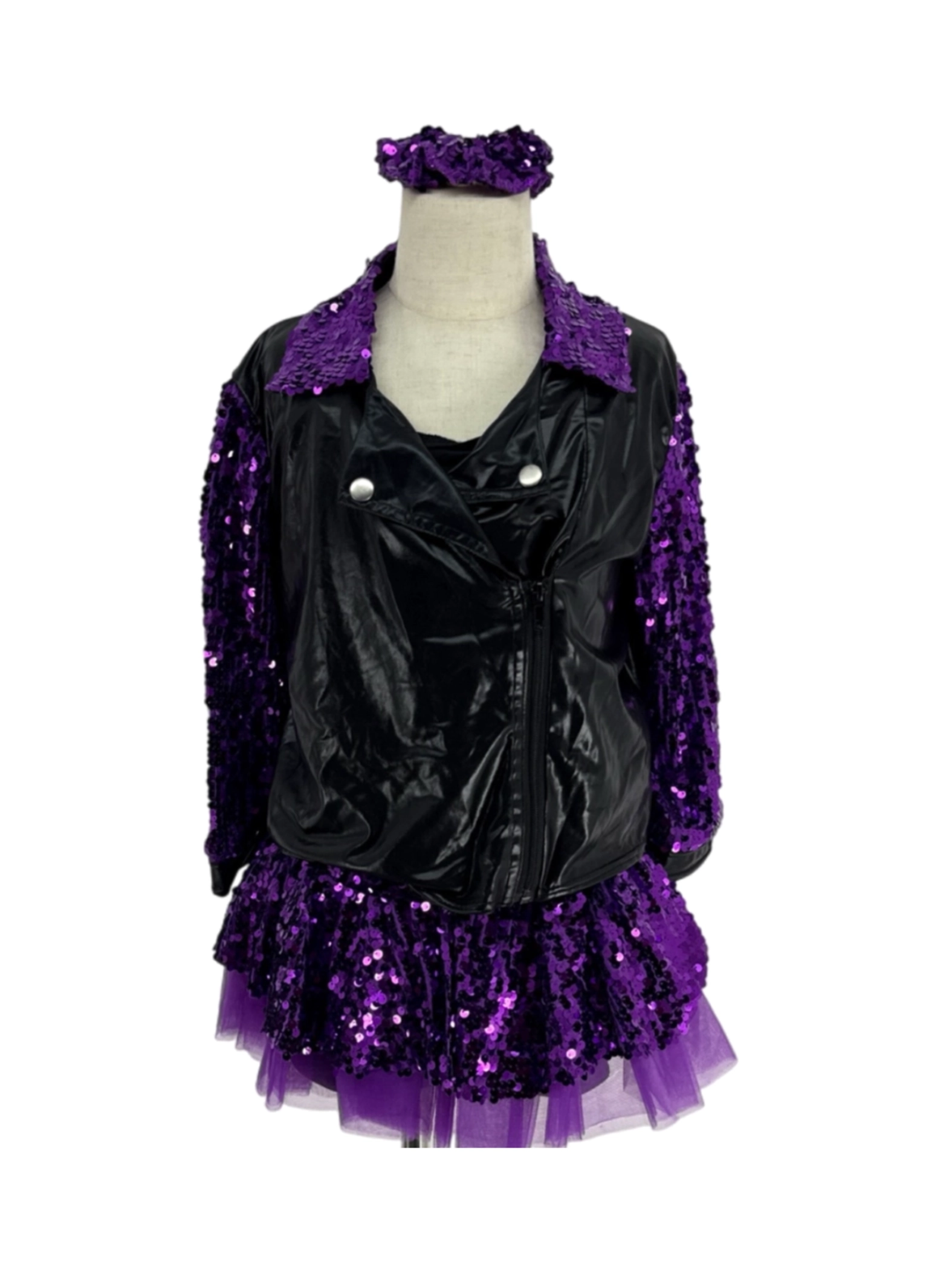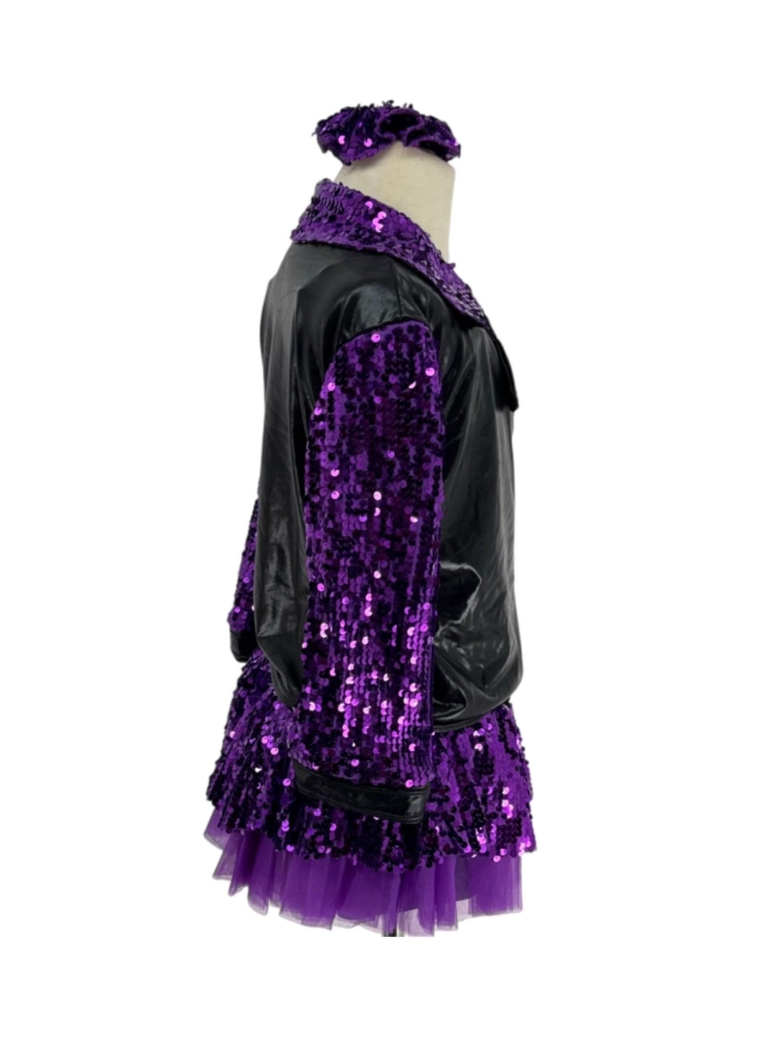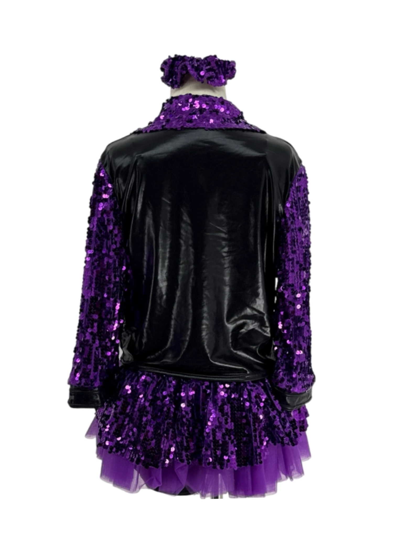 This dance costume is colorful and attention-grabbing. It consists of a black faux leather jacket with vibrant purple sequin sleeves and collar, paired with a matching purple sequin and tulle skirt.