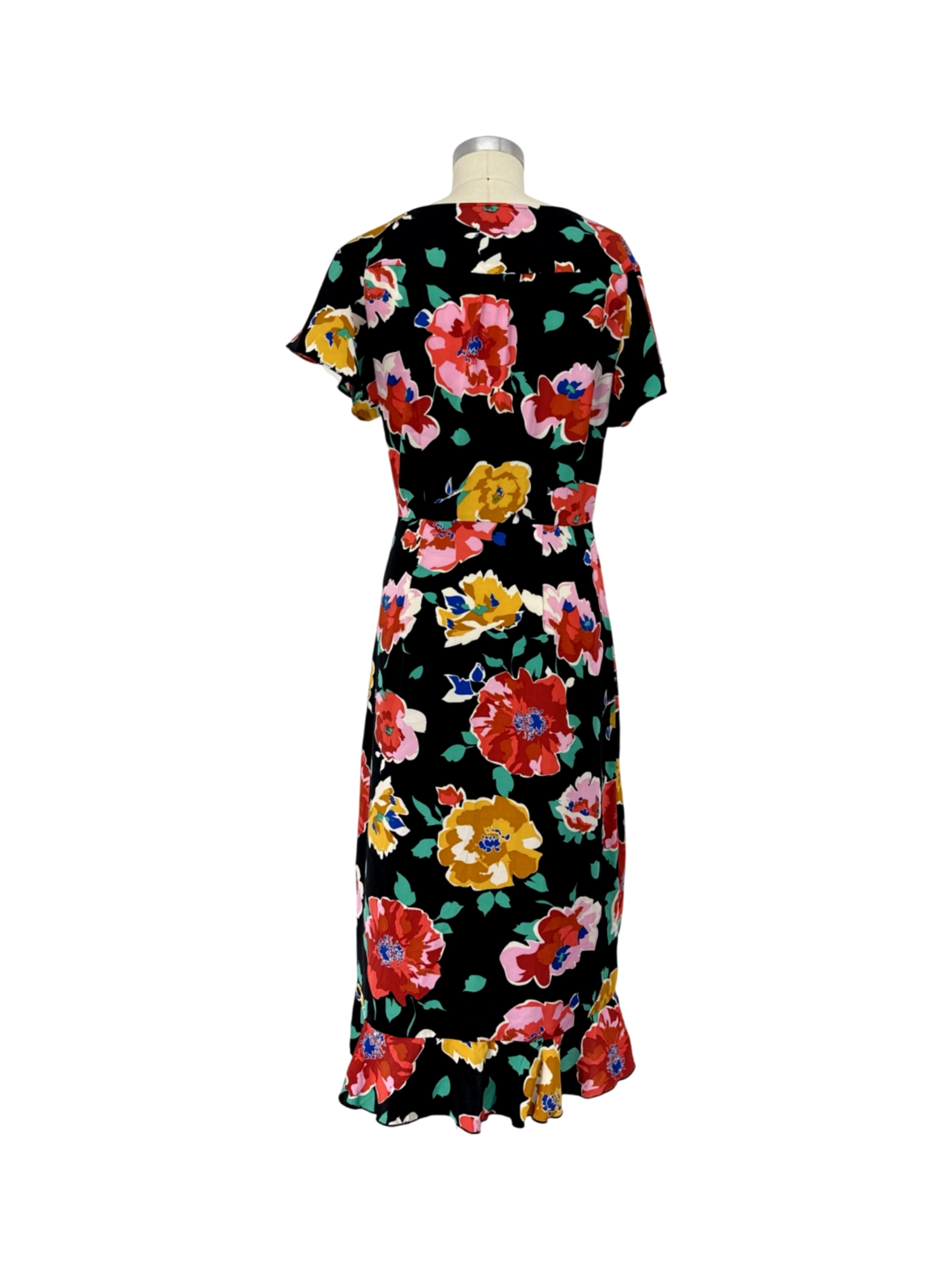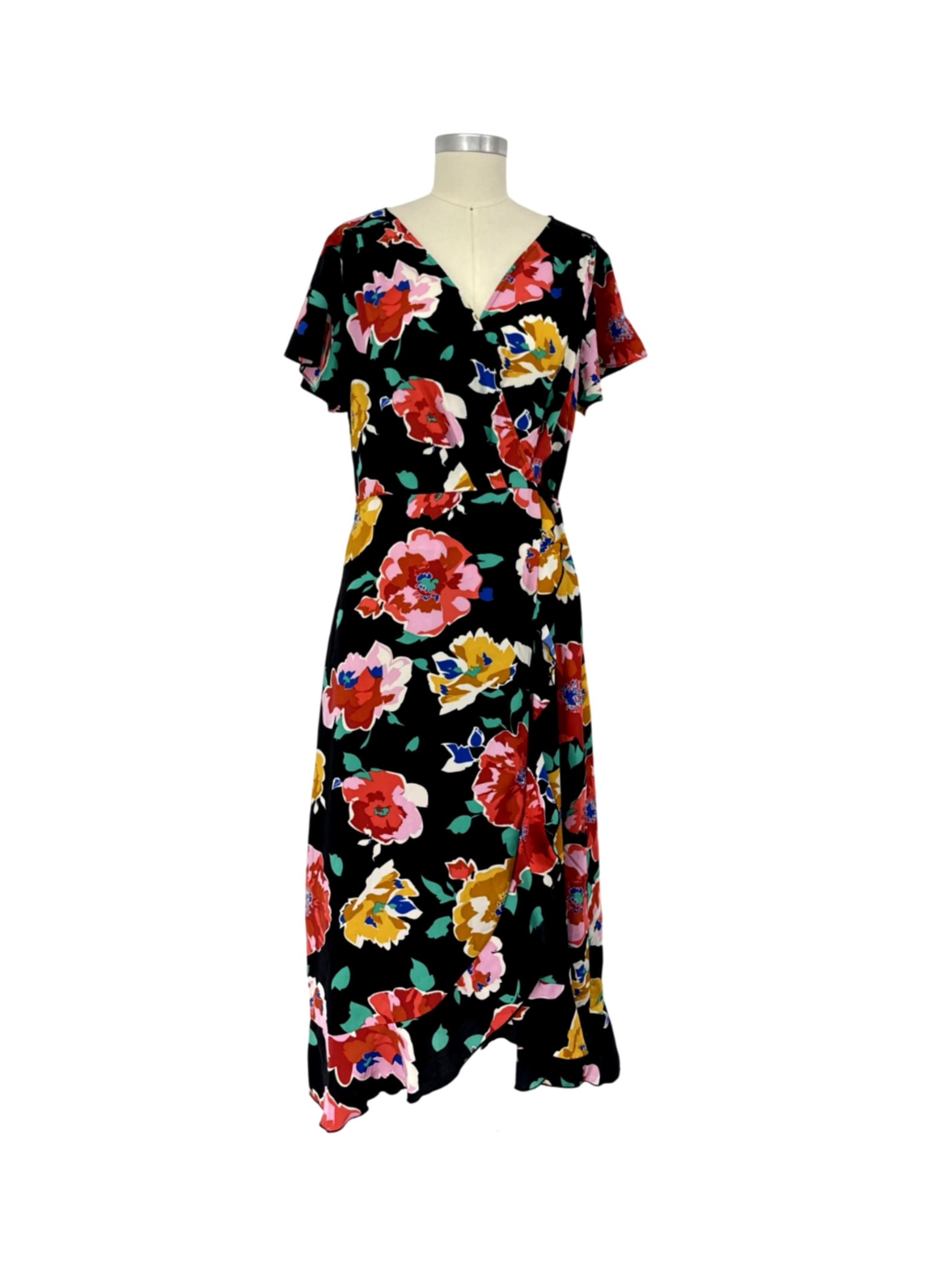 This beautiful Who What Wear dress is perfect for a summer day out! It's a pre-owned dress that features a flattering A-line silhouette, a V-neckline, and short sleeves. The dress is adorned with a vibrant floral pattern on a black background, making it a stylish choice for any casual occasion. It's made of soft, comfortable polyester, is a size S, and is in great condition.