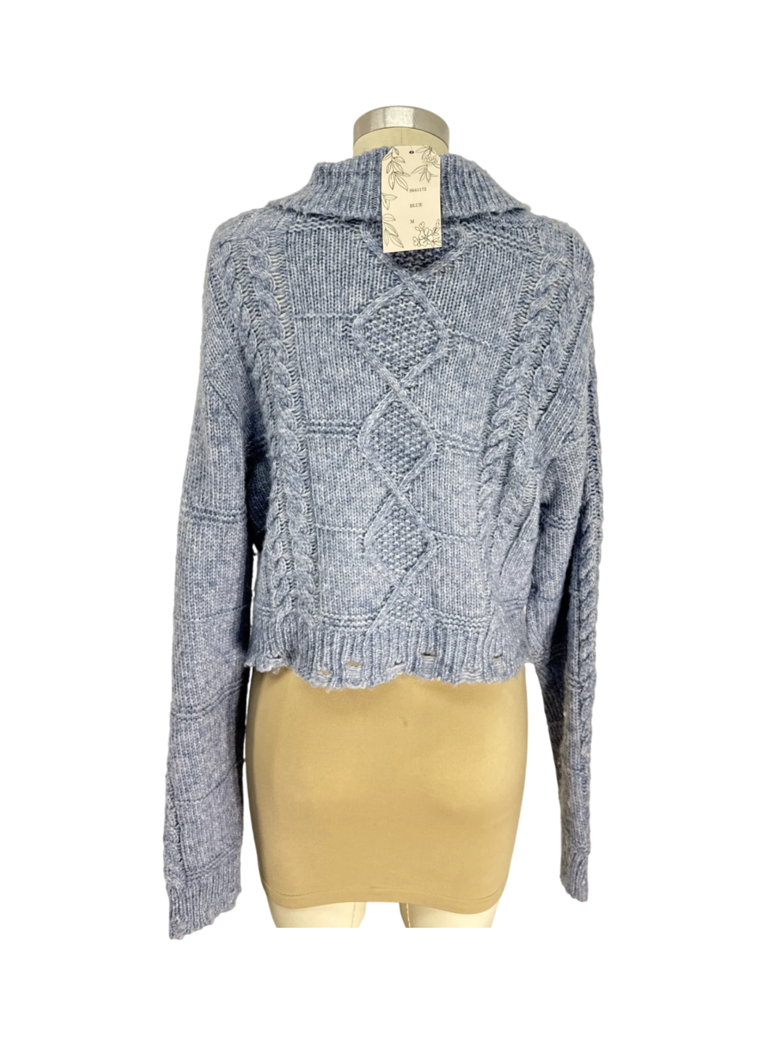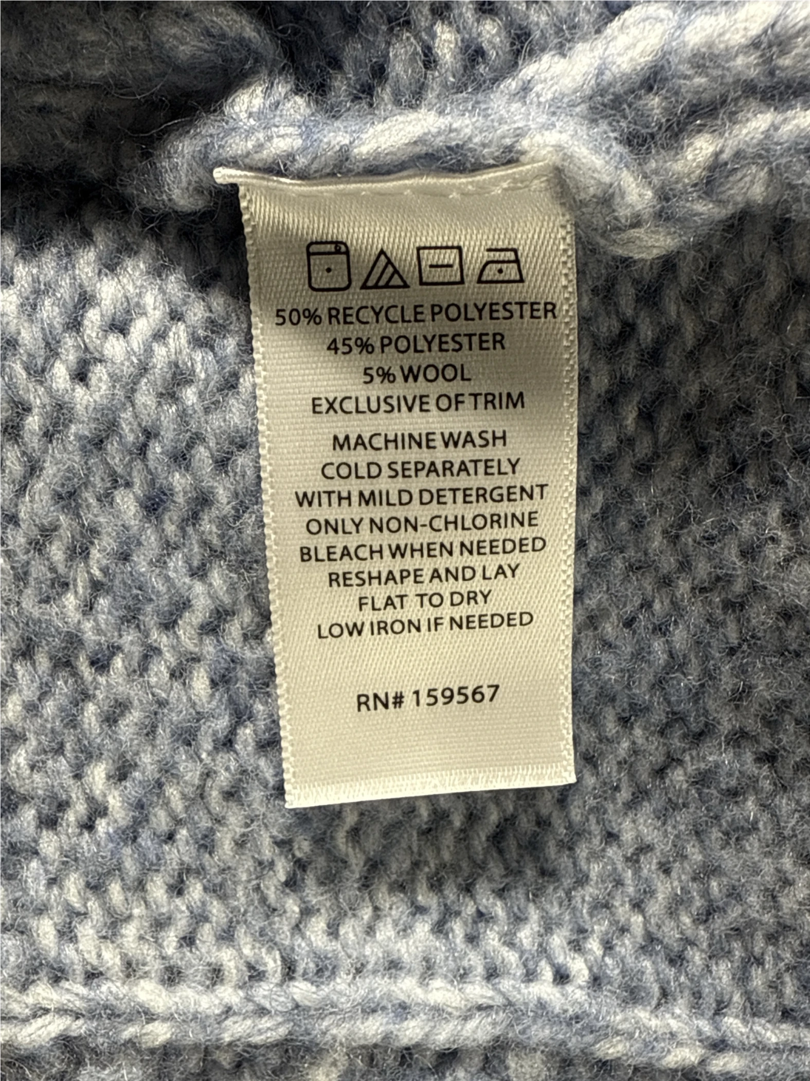Elevate your fall and winter wardrobe with this stylish pre-owned Willow & Wind sweater. This cozy cardigan features a classic cable-knit design, a flattering cropped silhouette, and a secure zipper closure. Crafted from a blend of recycled polyester, polyester, and wool, it offers both comfort and sustainability. The versatile blue color makes it easy to pair with any outfit. Perfect for layering, this sweater is a must-have addition to any fashion-forward closet.