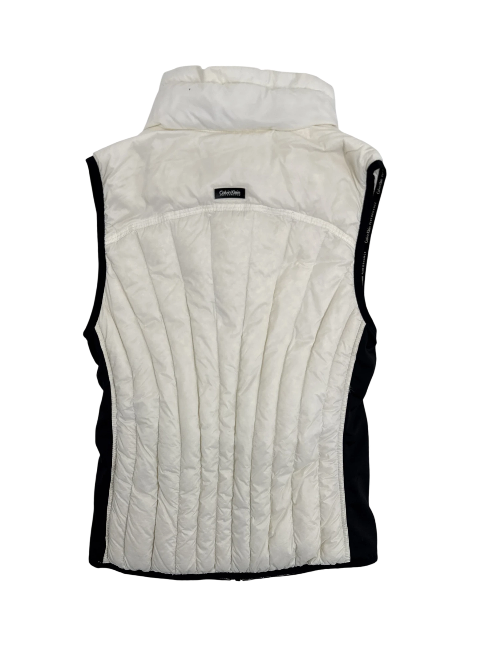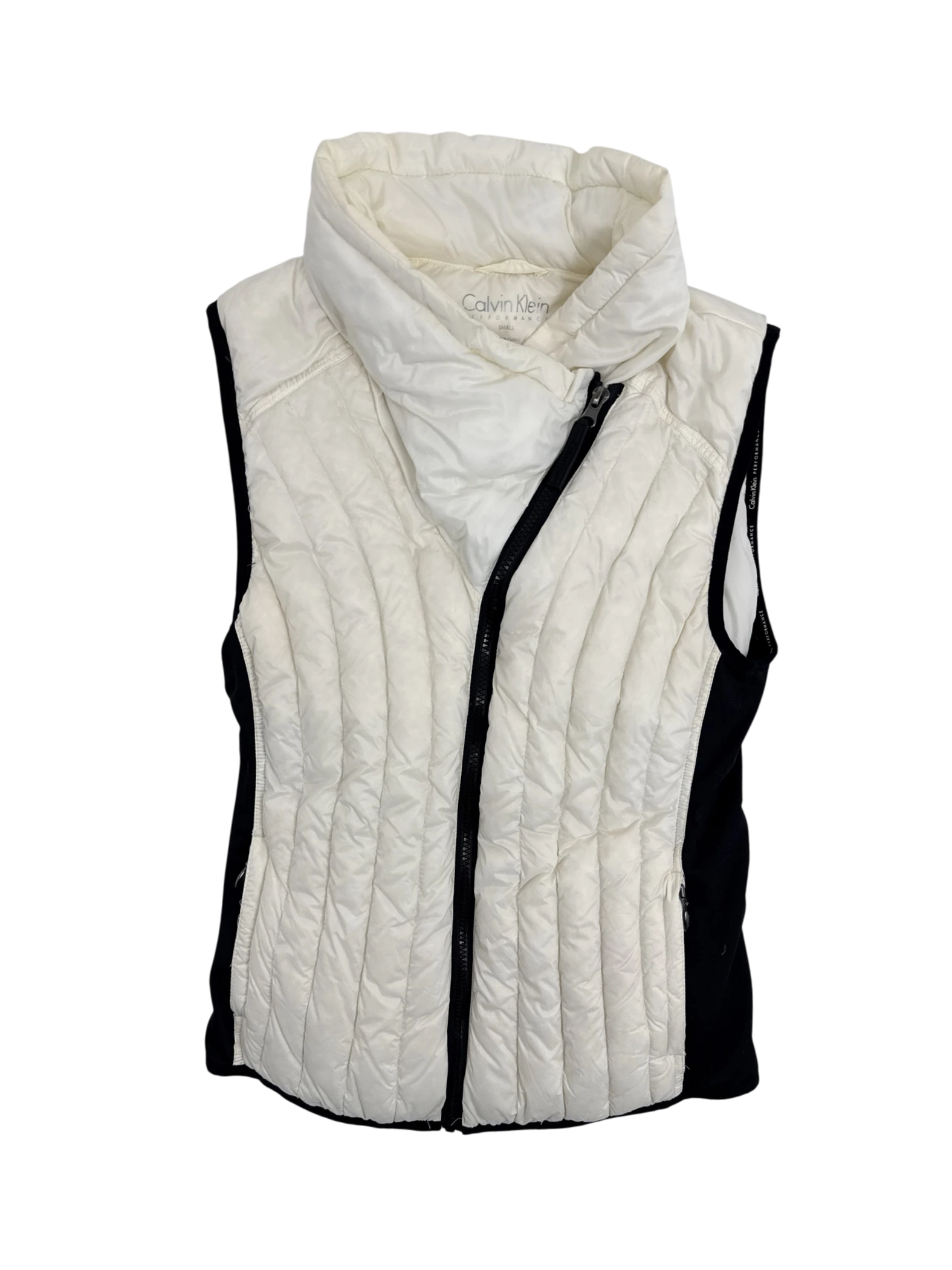 Pre-owned Calvin Klein Performance puffer vest in excellent condition. This stylish vest features a quilted design with a stand-up collar and a full-zip closure. The vest is crafted from a blend of nylon, polyester, and spandex, ensuring both comfort and durability. It's perfect for layering during the cooler months. It's in a small size, with a classic two-tone colorway. Ideal for any wardrobe.