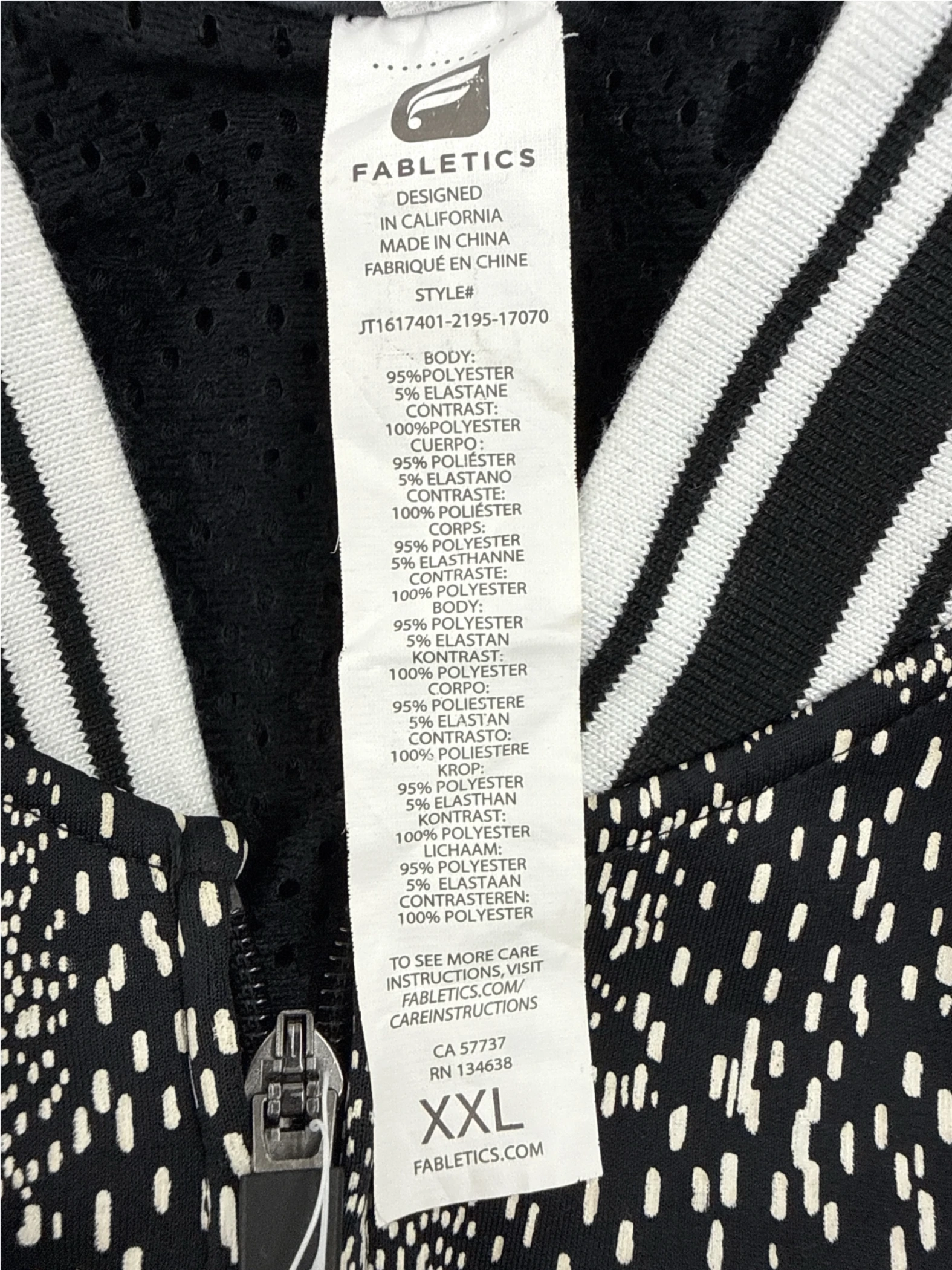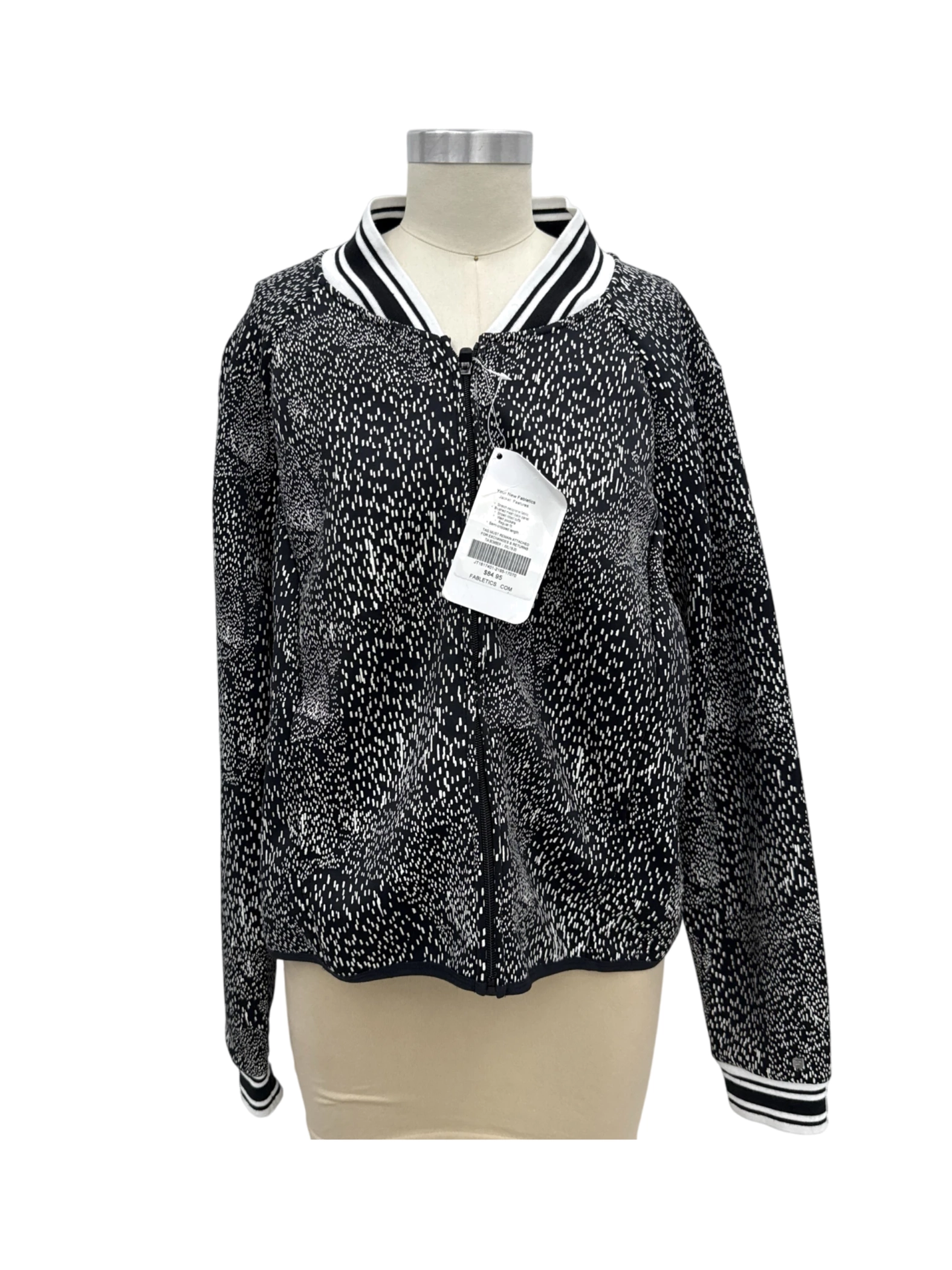 Elevate your athleisure wardrobe with this stylish Fabletics jacket. This pre-owned piece offers a unique blend of sporty and chic. Crafted with a comfortable polyester and elastane blend, this jacket features a striking black and white pattern. Perfect for layering, it's suitable for spring and fall. The jacket boasts a classic design and a flattering fit. Get ready to make a statement with this versatile and fashionable find, ideal for workouts or everyday wear.